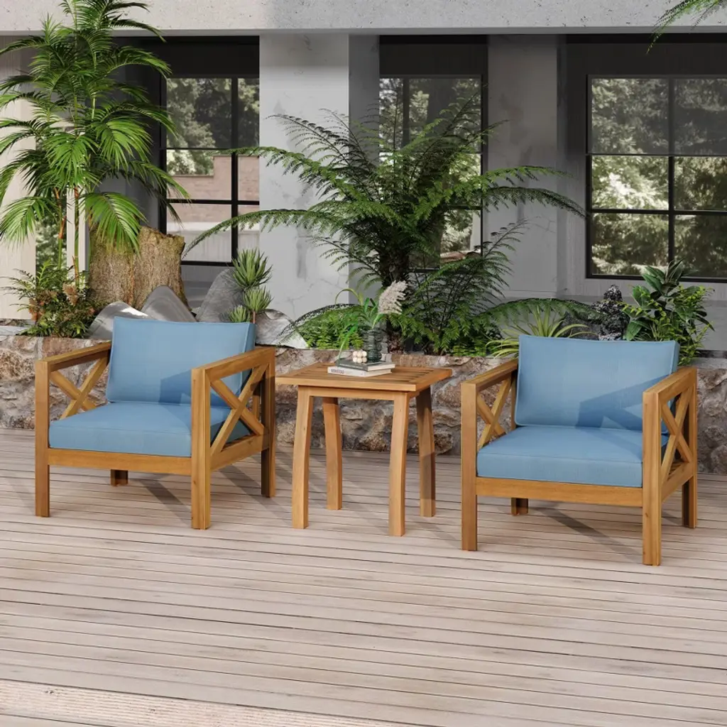 NAYSAYE adds an easygoing touch to your outdoor lounging with this thoughtfully crafted leisure set. Built from durable Acacia wood, the chairs and table are designed to handle outdoor elements while maintaining a warm natural finish. Cushions provide breathable comfort that resists moisture, making them ideal for poolside moments or quiet backyard afternoons. A matching end table completes the set with useful style.