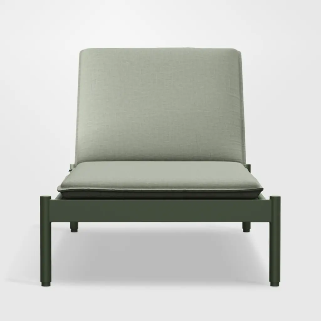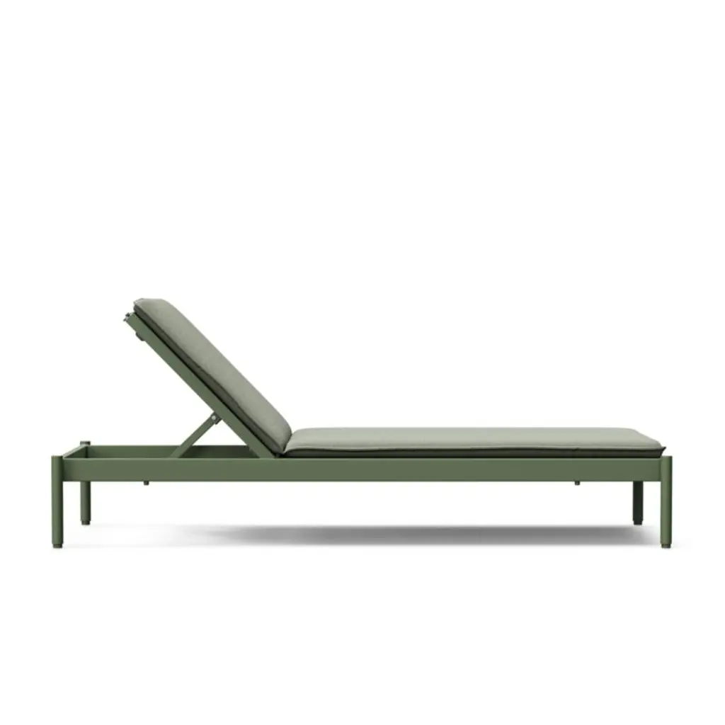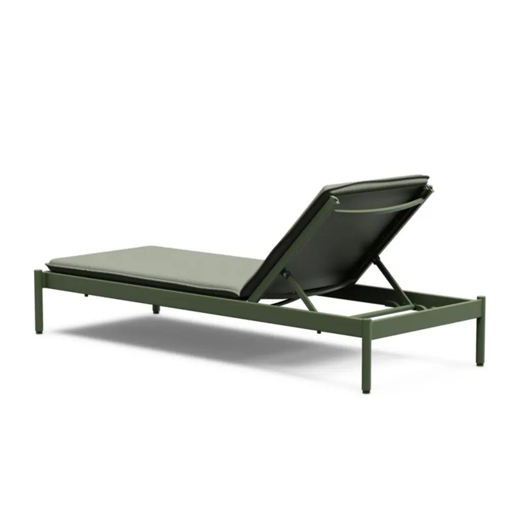 Minimalist in design, maximal in comfort. This set of sleek loungers relaxes with pillowy cushions neatly tailored with self-welting in weather- and fade-resistant Sunbrella fabric. The aluminum frame matches the cushion's olive green tone with a matte finish in durable powdercoat. Made for lounging, the lightweight chaise lounges adjust to three levels of recline.