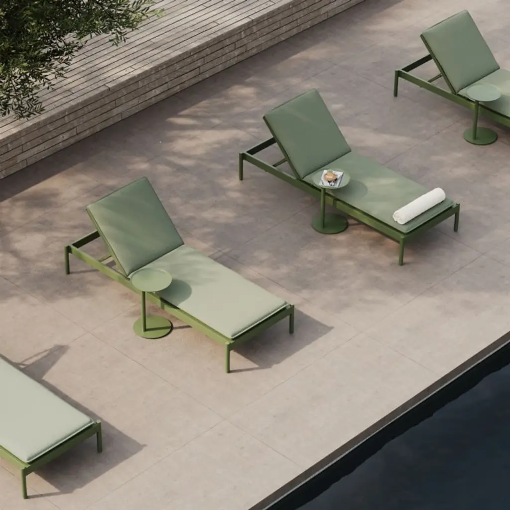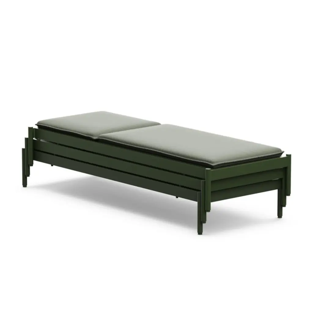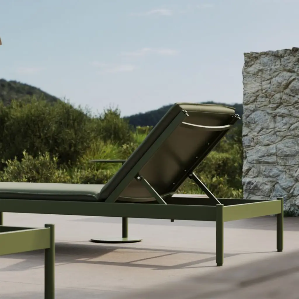 Minimalist in design, maximal in comfort. This set of sleek loungers relaxes with pillowy cushions neatly tailored with self-welting in weather- and fade-resistant Sunbrella fabric. The aluminum frame matches the cushion's olive green tone with a matte finish in durable powdercoat. Made for lounging, the lightweight chaise lounges adjust to three levels of recline.
