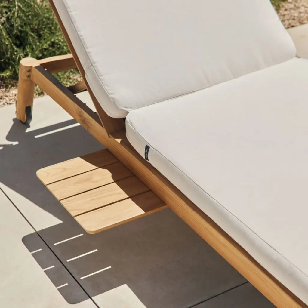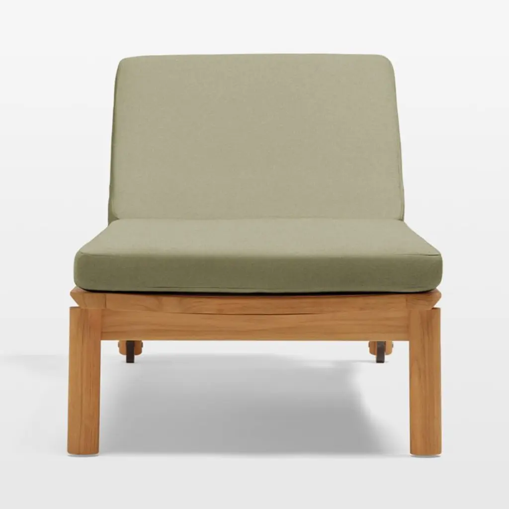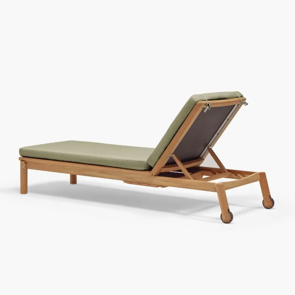 Angled at a slight recline, the chaise lounge invites you to kick back and enjoy the great outdoors. Natural teak shapes the chaise's chunky, rounded frame that features an adjustable back with five reclining positions and a side table surface that slides out on either side. The leafy green cushion adds a layer of comfort, and wheels make it easy to move the chaise into sun or shade. Offering living-room looks with surprising durability, the outdoor chaise lounge withstands the elements in weather-resistant teak with a fast-drying foam cushion.Based in Phoenix, Neighbor crafts beautiful, durable furniture for outdoor living with premium materials such as Sunbrella fabrics and FSC®-certified teak. We're thrilled to partner with Neighbor in bringing you Haven, one of the company's first collections designed to build connection and expand livable square footage to outdoor spaces.By choosing FSC®-certified furniture, you are supporting responsible management of the world's forests.