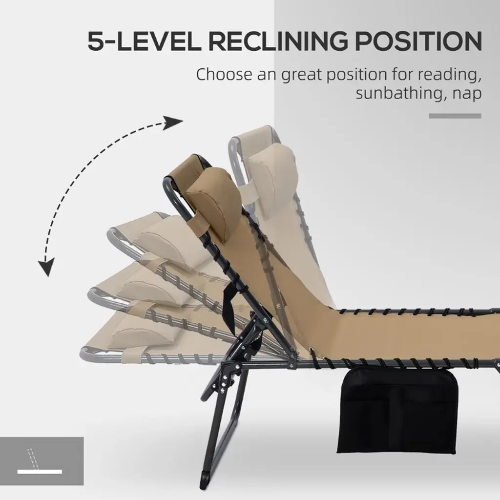 This two-piece outdoor sun lounger set is perfect for enjoying warm summer days in comfort. Featuring a breathable mesh surface and plush pillows, these loungers provide cushioned, low-pressure seating with a bouncy bungee suspension. The adjustable backrest offers five reclining positions, including a convenient face hole for comfortable face-down lounging or reading. Each chair includes a storage pocket to keep your phone, book, or essentials within easy reach. Designed with a tri-fold, space-saving structure, the set folds compactly for easy storage and travel, fitting neatly in your car trunk. Built with durable steel frames and water-safe powder-coated finishes, these loungers are ready to withstand outdoor elements and provide long-lasting relaxation.