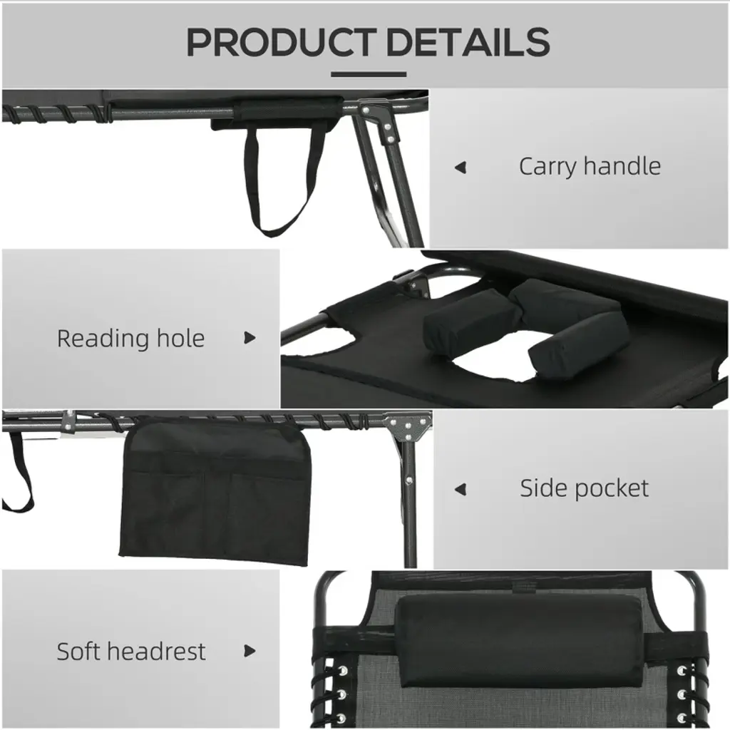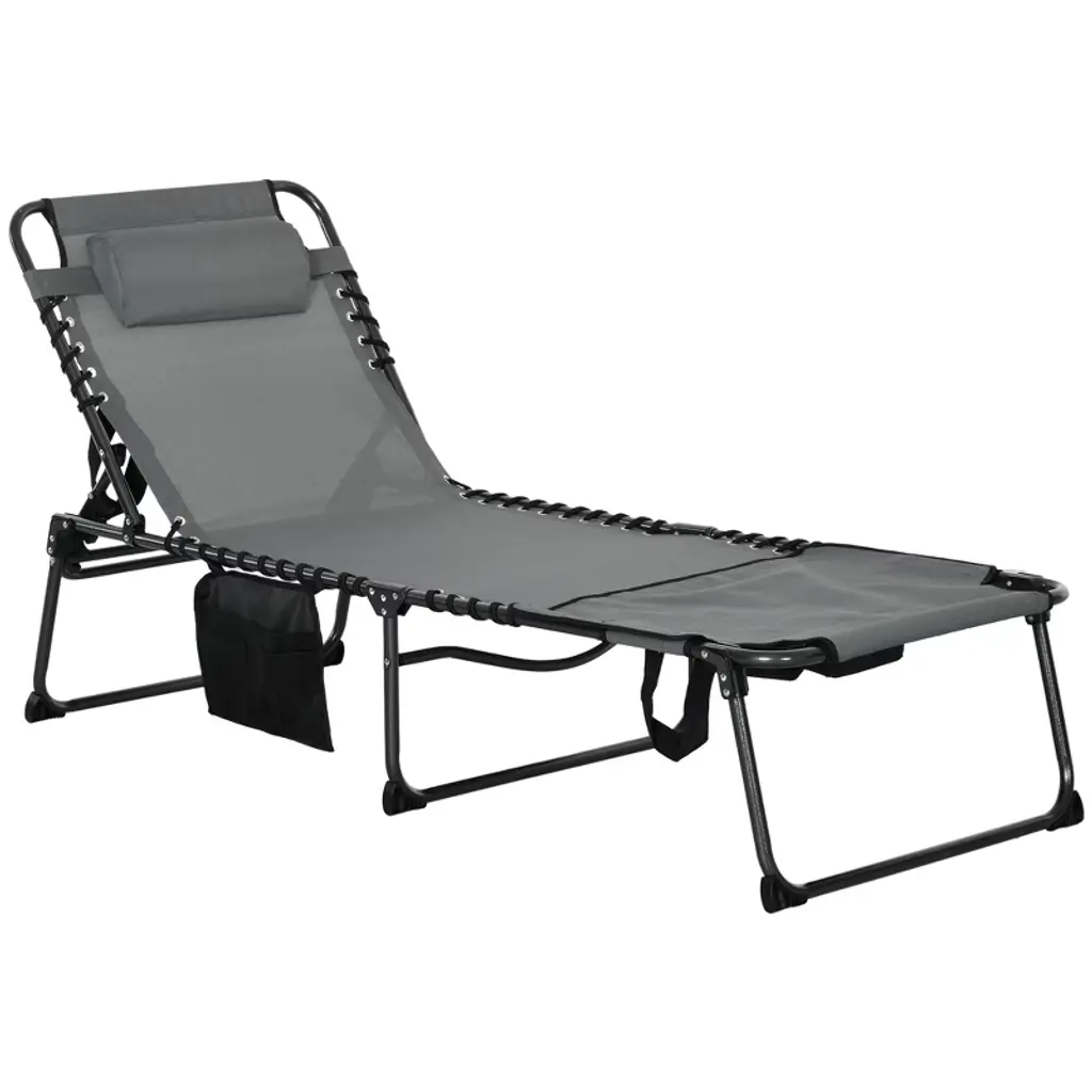 Ultimate Outdoor Comfort and ConvenienceStep outside and relax with this versatile outdoor sun lounger, designed for comfort and functionality. Its breathable mesh surface keeps you cool on warm days, while the plush pillow adds head support for ultimate relaxation. The adjustable backrest offers five reclining positions, including a convenient face hole perfect for lying face down while reading or resting. Stay organized with a built-in storage pocket for your phone, book, or essentials. The tri-fold design makes this chair easy to fold, store, and transport, fitting neatly into your car trunk or garage. Crafted with a durable steel frame and water-safe powder-coated finish, this lounger is built to withstand outdoor elements and provide lasting enjoyment.Product Details:Adjustable backrest with 5 positionsBreathable mesh fabric with plush pillowBuilt-in storage pocketFoldable tri-fold designDurable steel frame with powder coating