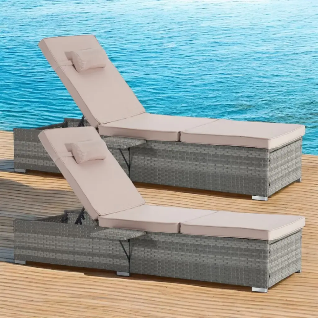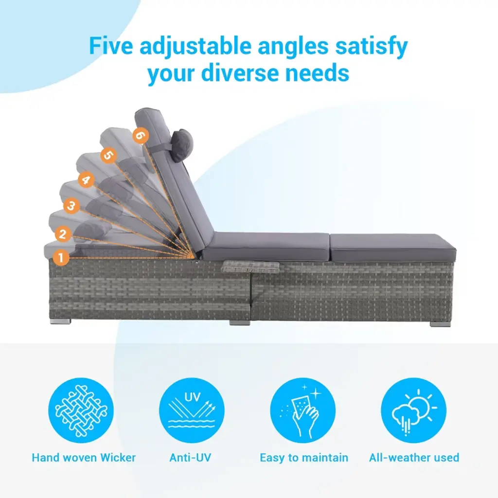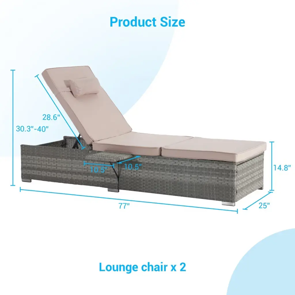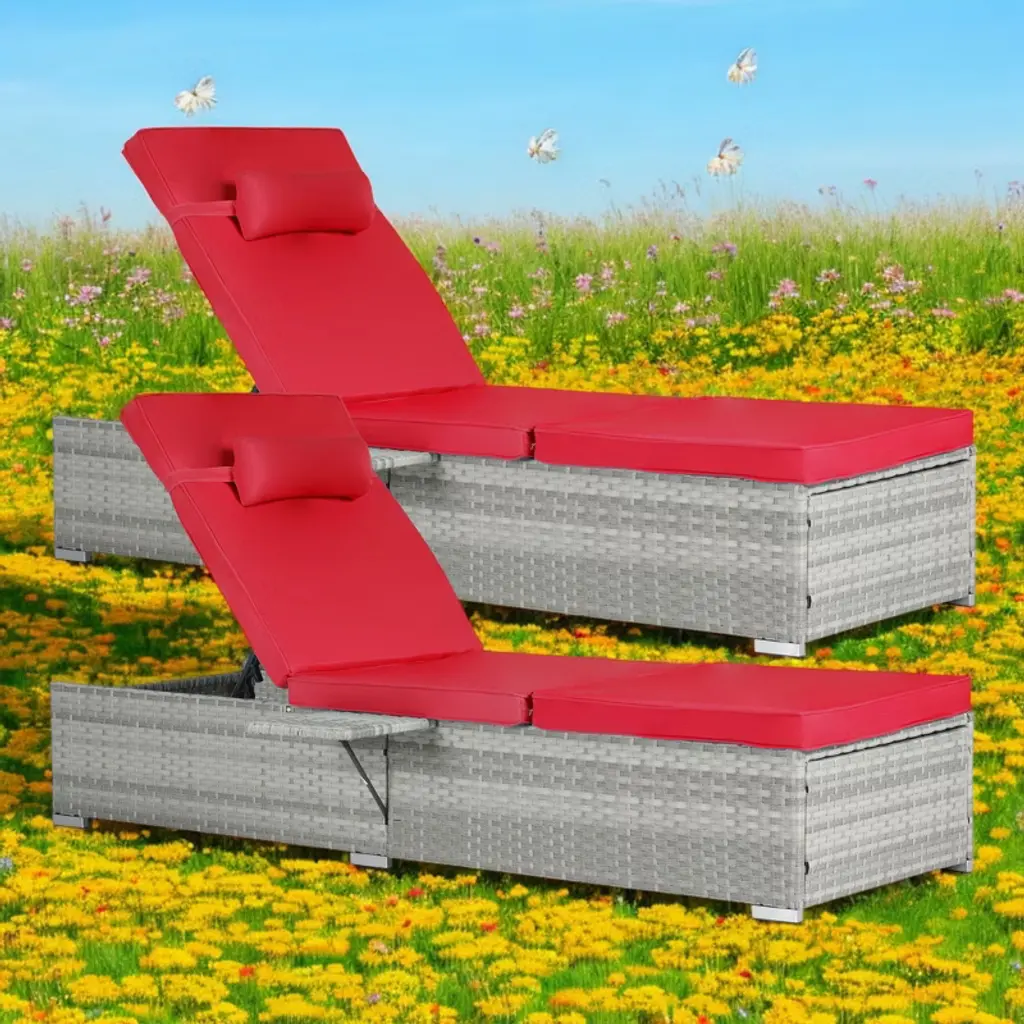 Product Overview Relax and enjoy the outdoors in style with this Outdoor Chaise Lounge Chair Set. Crafted with high-quality PE rattan and a rust-resistant steel frame, this set is perfect for sunbathing, lounging, and entertaining. The adjustable backrest offers customizable comfort, while the plush cushions provide long-lasting support. Whether you're lounging by the pool, in your garden, or on the patio, this set is ideal for any outdoor setting. Product Features Classic & Functional Design: This outdoor chaise lounge set includes two pieces, each offering a comfortable lounging experience in any outdoor space. The set's design is perfect for sunbathing, relaxing, and enjoying the outdoors. Sturdy & Durable Construction: Built with premium PE rattan and a rust-resistant, powder-coated steel frame, this chaise lounge set is both durable and stable. The materials used ensure it will withstand the test of time and outdoor elements. Adjustable Backrest: With six adjustable backrest positions, this lounge set allows you to find the perfect angle for relaxation, whether you're lounging or reading a book. Comfortable Cushions: The set includes high-density foam cushions that offer superior comfort and support. The cushions are also easy to clean, ensuring hassle-free maintenance. Weather Resistance & Easy Maintenance: The PE rattan material is UV-resistant, breathable, and easy to clean. Whether it’s hot sun or light rain, the set is designed to endure, and the cushions can be cleaned with a wet cloth or hose. Specifications Overall Size: 77” L x 25” W x 14.8” H Cushion Color: Red Rattan Color: Gray Material: PE Rattan, Steel Frame, Foam Cushions Maximum Weight Capacity: 600 lbs (300 lbs per chair) Assembly Required: No assembly required (pre-assembled) Item Weight: 80.74 lbs (Net), 82.94 lbs (Gross) Country of Origin: China Suitable Scenarios This versatile chaise lounge set is perfect for various outdoor settings, including patios, gardens, poolside areas, balconies, and beaches. It’s great for relaxing in the sun, reading a book, or enjoying a refreshing drink with friends and family. The set is also suitable for commercial use, such as outdoor resorts or lounges. Notes Color Variation: Due to lighting and screen settings, the actual color of the product may vary slightly from the images shown. Care Instructions: The cushions are removable and easy to clean with a damp cloth or by washing them directly with a hose. The PE rattan material is weather-resistant but should be covered during heavy rainfall for long-lasting durability. Assembly: No assembly is required; the chaise lounges come fully assembled and ready to use.