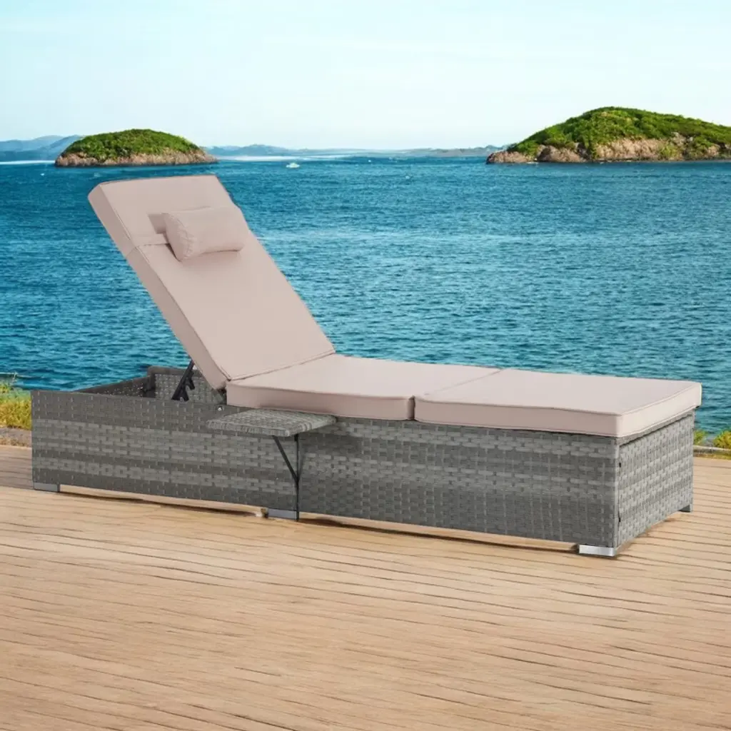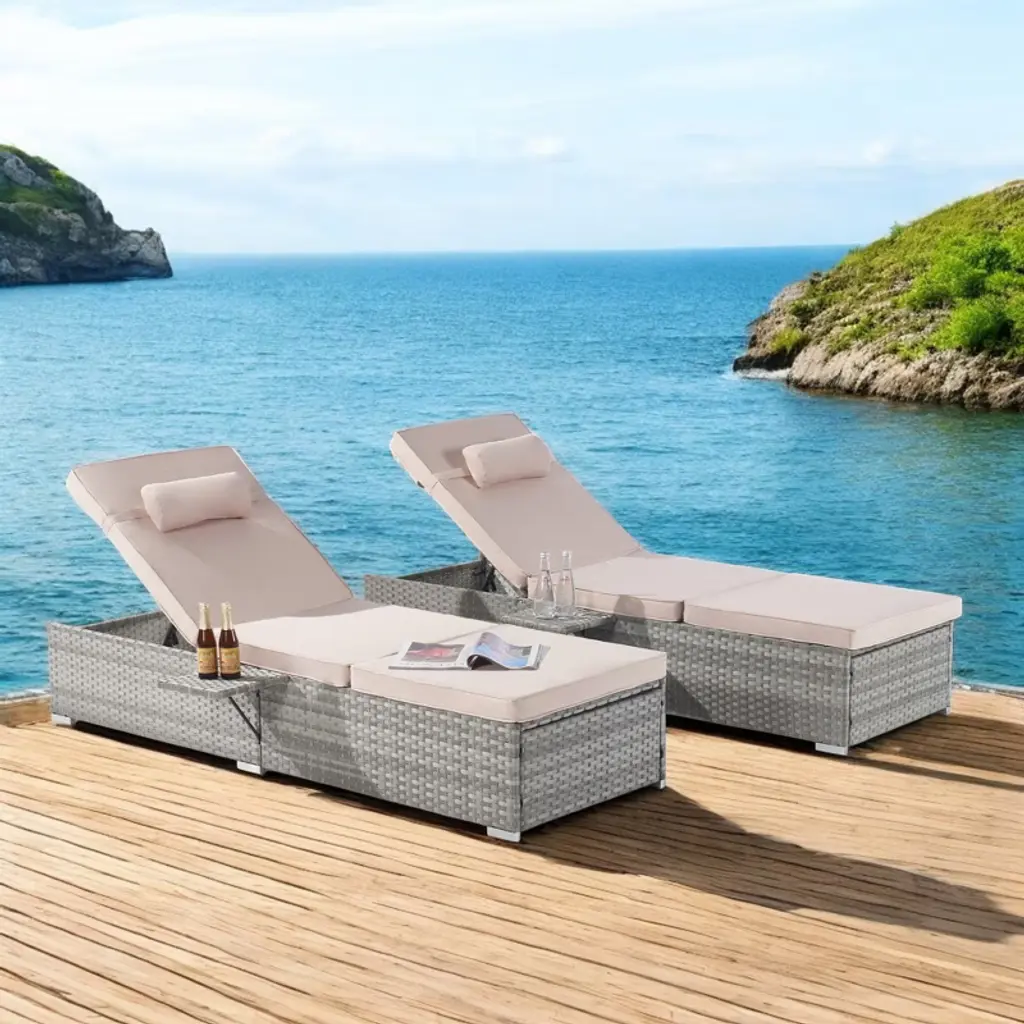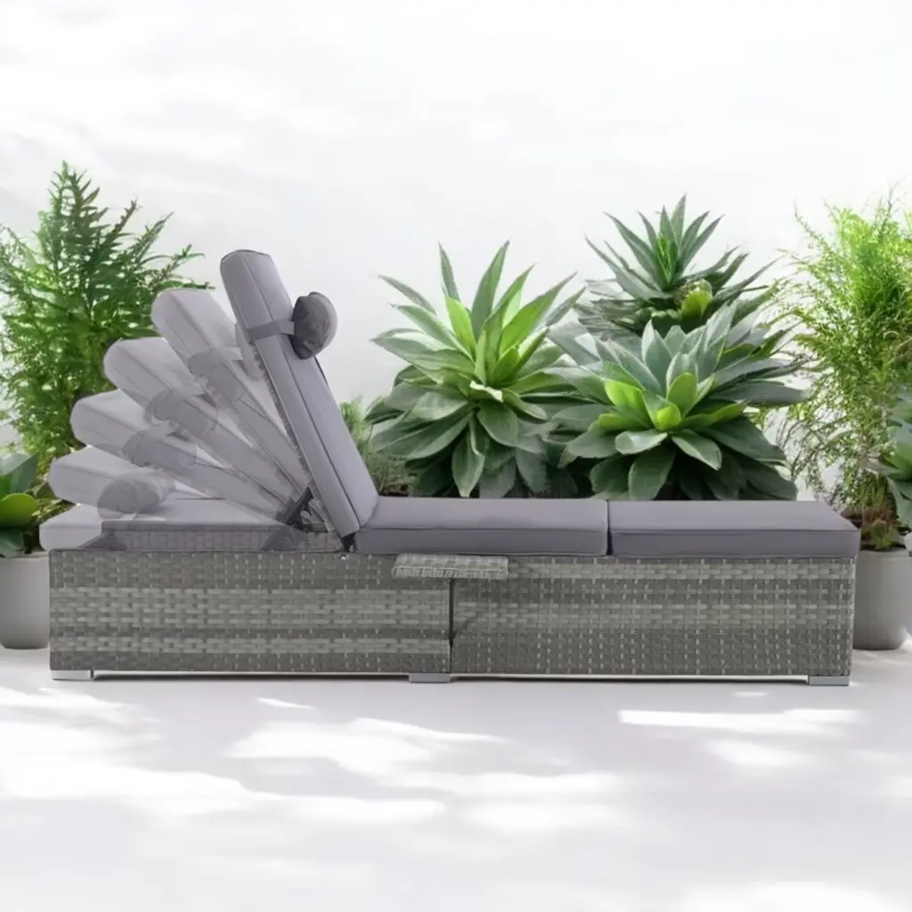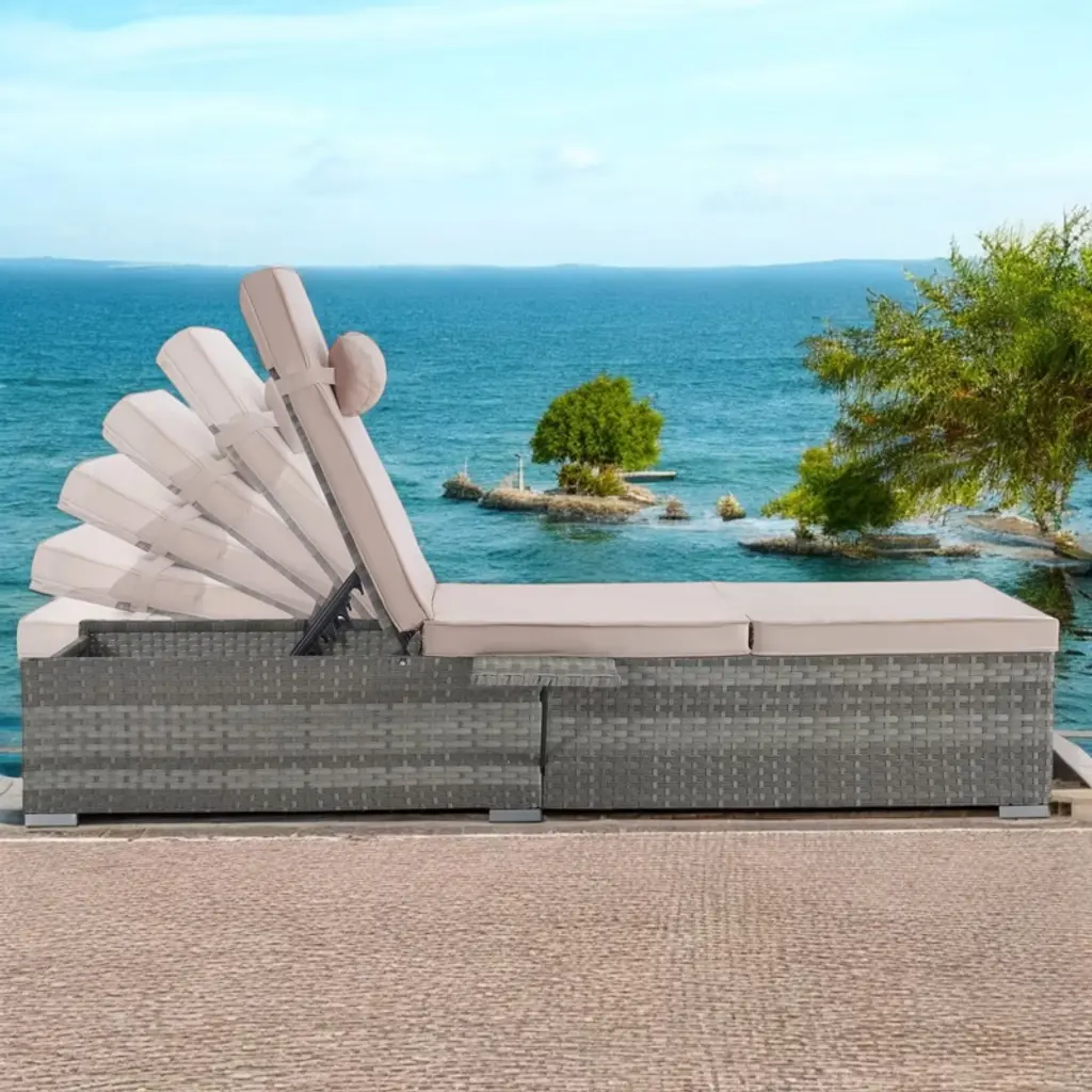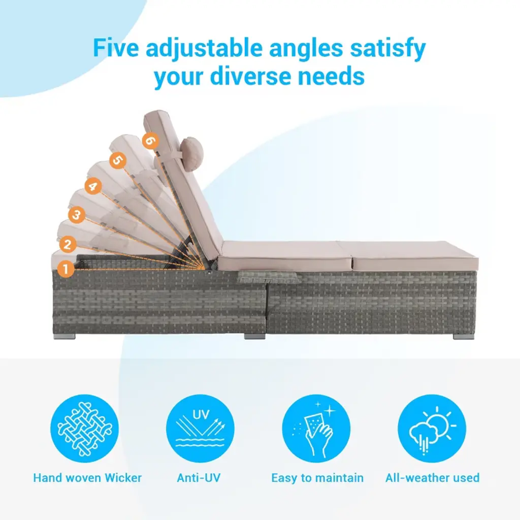 Product Overview Relax and enjoy the outdoors in style with this Outdoor Chaise Lounge Chair Set. Crafted with high-quality PE rattan and a rust-resistant steel frame, this set is perfect for sunbathing, lounging, and entertaining. The adjustable backrest offers customizable comfort, while the plush cushions provide long-lasting support. Whether you're lounging by the pool, in your garden, or on the patio, this set is ideal for any outdoor setting. Product Features Classic & Functional Design: This outdoor chaise lounge set includes two pieces, each offering a comfortable lounging experience in any outdoor space. The set's design is perfect for sunbathing, relaxing, and enjoying the outdoors. Sturdy & Durable Construction: Built with premium PE rattan and a rust-resistant, powder-coated steel frame, this chaise lounge set is both durable and stable. The materials used ensure it will withstand the test of time and outdoor elements. Adjustable Backrest: With six adjustable backrest positions, this lounge set allows you to find the perfect angle for relaxation, whether you're lounging or reading a book. Comfortable Cushions: The set includes high-density foam cushions that offer superior comfort and support. The cushions are also easy to clean, ensuring hassle-free maintenance. Weather Resistance & Easy Maintenance: The PE rattan material is UV-resistant, breathable, and easy to clean. Whether it’s hot sun or light rain, the set is designed to endure, and the cushions can be cleaned with a wet cloth or hose. Specifications Overall Size: 77” L x 25” W x 14.8” H Cushion Color: Red Rattan Color: Gray Material: PE Rattan, Steel Frame, Foam Cushions Maximum Weight Capacity: 600 lbs (300 lbs per chair) Assembly Required: No assembly required (pre-assembled) Item Weight: 80.74 lbs (Net), 82.94 lbs (Gross) Country of Origin: China Suitable Scenarios This versatile chaise lounge set is perfect for various outdoor settings, including patios, gardens, poolside areas, balconies, and beaches. It’s great for relaxing in the sun, reading a book, or enjoying a refreshing drink with friends and family. The set is also suitable for commercial use, such as outdoor resorts or lounges. Notes Color Variation: Due to lighting and screen settings, the actual color of the product may vary slightly from the images shown. Care Instructions: The cushions are removable and easy to clean with a damp cloth or by washing them directly with a hose. The PE rattan material is weather-resistant but should be covered during heavy rainfall for long-lasting durability. Assembly: No assembly is required; the chaise lounges come fully assembled and ready to use.