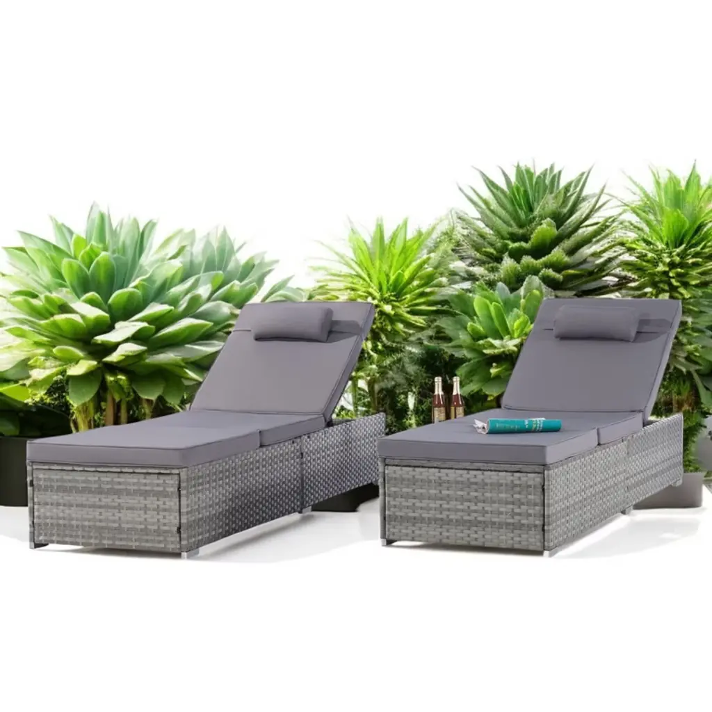 Product Overview Relax and enjoy the outdoors in style with this Outdoor Chaise Lounge Chair Set. Crafted with high-quality PE rattan and a rust-resistant steel frame, this set is perfect for sunbathing, lounging, and entertaining. The adjustable backrest offers customizable comfort, while the plush cushions provide long-lasting support. Whether you're lounging by the pool, in your garden, or on the patio, this set is ideal for any outdoor setting. Product Features Classic & Functional Design: This outdoor chaise lounge set includes two pieces, each offering a comfortable lounging experience in any outdoor space. The set's design is perfect for sunbathing, relaxing, and enjoying the outdoors. Sturdy & Durable Construction: Built with premium PE rattan and a rust-resistant, powder-coated steel frame, this chaise lounge set is both durable and stable. The materials used ensure it will withstand the test of time and outdoor elements. Adjustable Backrest: With six adjustable backrest positions, this lounge set allows you to find the perfect angle for relaxation, whether you're lounging or reading a book. Comfortable Cushions: The set includes high-density foam cushions that offer superior comfort and support. The cushions are also easy to clean, ensuring hassle-free maintenance. Weather Resistance & Easy Maintenance: The PE rattan material is UV-resistant, breathable, and easy to clean. Whether it’s hot sun or light rain, the set is designed to endure, and the cushions can be cleaned with a wet cloth or hose. Specifications Overall Size: 77” L x 25” W x 14.8” H Cushion Color: Red Rattan Color: Gray Material: PE Rattan, Steel Frame, Foam Cushions Maximum Weight Capacity: 600 lbs (300 lbs per chair) Assembly Required: No assembly required (pre-assembled) Item Weight: 80.74 lbs (Net), 82.94 lbs (Gross) Country of Origin: China Suitable Scenarios This versatile chaise lounge set is perfect for various outdoor settings, including patios, gardens, poolside areas, balconies, and beaches. It’s great for relaxing in the sun, reading a book, or enjoying a refreshing drink with friends and family. The set is also suitable for commercial use, such as outdoor resorts or lounges. Notes Color Variation: Due to lighting and screen settings, the actual color of the product may vary slightly from the images shown. Care Instructions: The cushions are removable and easy to clean with a damp cloth or by washing them directly with a hose. The PE rattan material is weather-resistant but should be covered during heavy rainfall for long-lasting durability. Assembly: No assembly is required; the chaise lounges come fully assembled and ready to use.