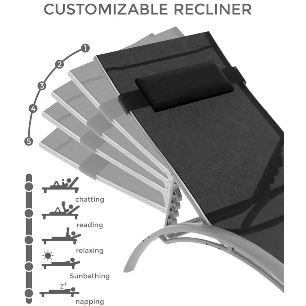 Enjoy ultimate relaxation with our Outdoor Chaise Lounge Chairs Set of 2, designed to bring comfort and style to your poolside, garden, beach, or backyard. Each chaise lounge features an adjustable design with four reclining positions, allowing you to customize your sitting or lying posture for maximum comfort. Crafted from premium lightweight aluminum alloy, these chairs offer exceptional durability and stability, while beingfor long-lasting use in any outdoor environment. The lightweight construction makes these chaise lounges easy to move and store, perfect for taking to the beach, patio, or poolside. Built with weather-resistant materials, they withstand sun, rain, and humidity, ensuring reliable performance year-round. Their sleek, modern design adds an elegant touch to any outdoor setting, enhancing your space's aesthetic while providing a comfortable place to unwind. Whether you're soaking up the sun or enjoying a peaceful afternoon outdoors, this set of 2 chaise lounge chairs combines functionality, portability, and style to elevate your outdoor living experience.