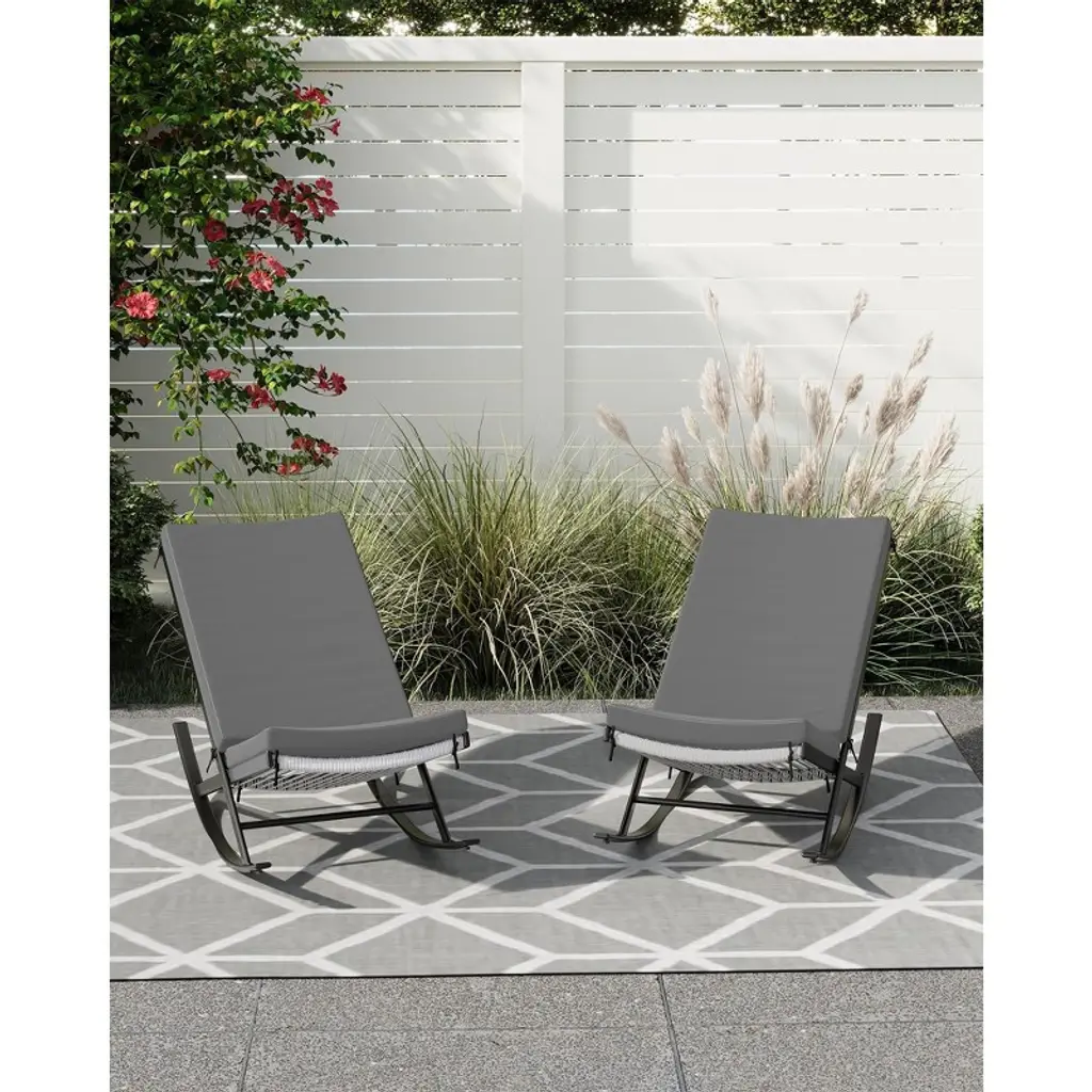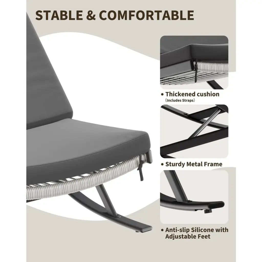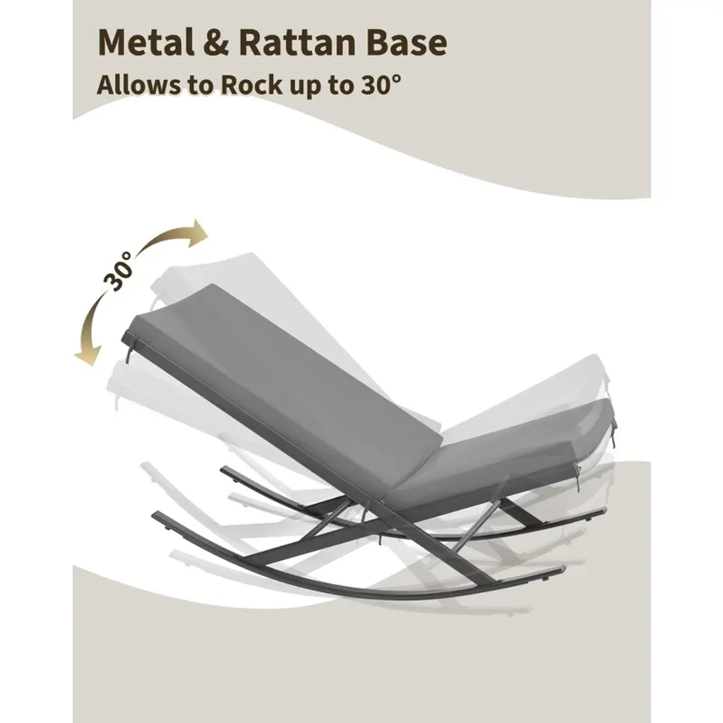 Outdoor Rocking Lounge Chair Set of 2, Patio Chaise Lounge with Removable Cushion for Napping Relaxing, Indoor Reclining Papasan Rocker Chair, Grey