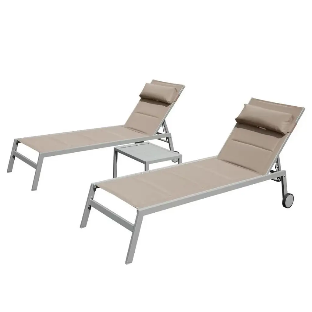 Paged Outdoor Lounge Chairs With Side Table And Wheels,3pc Outdoor Chaise Lounge Chair Set ,2 Lounge Chairs And 1Table,khaki