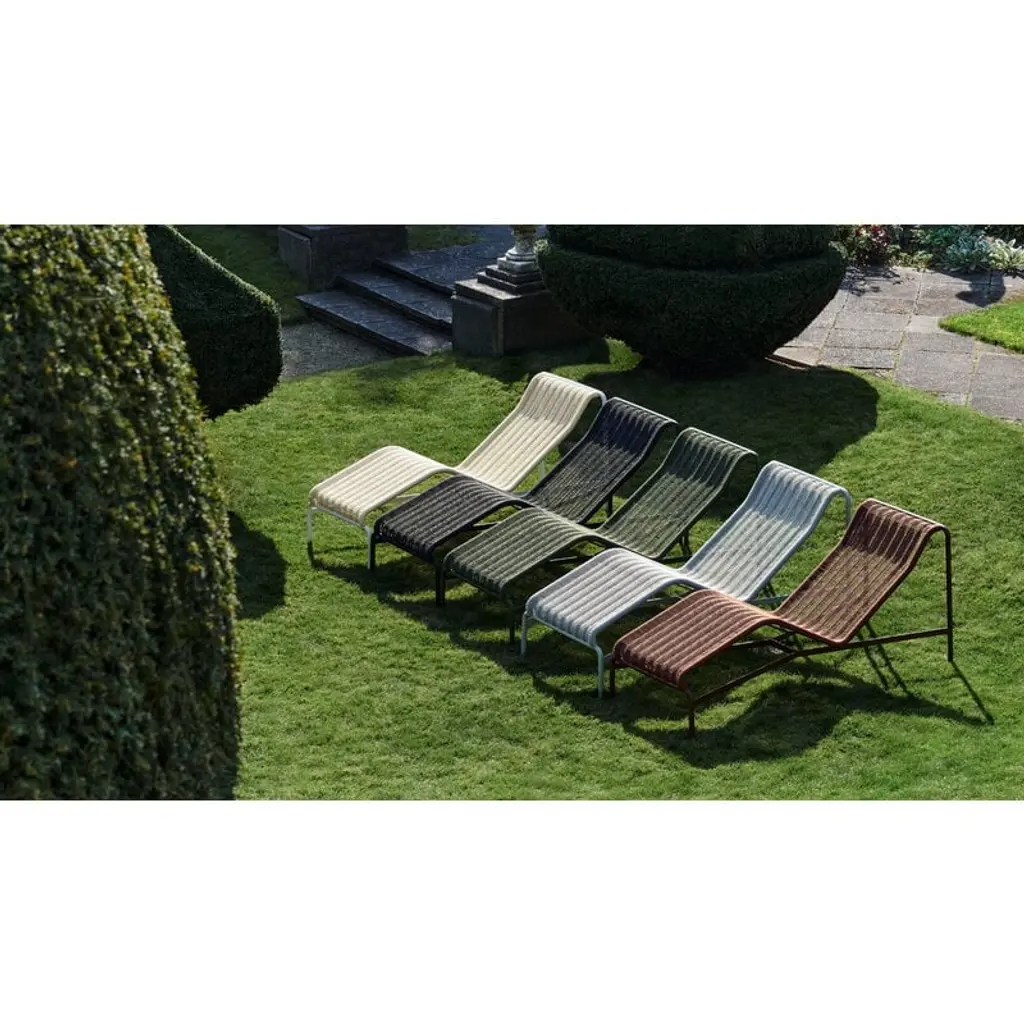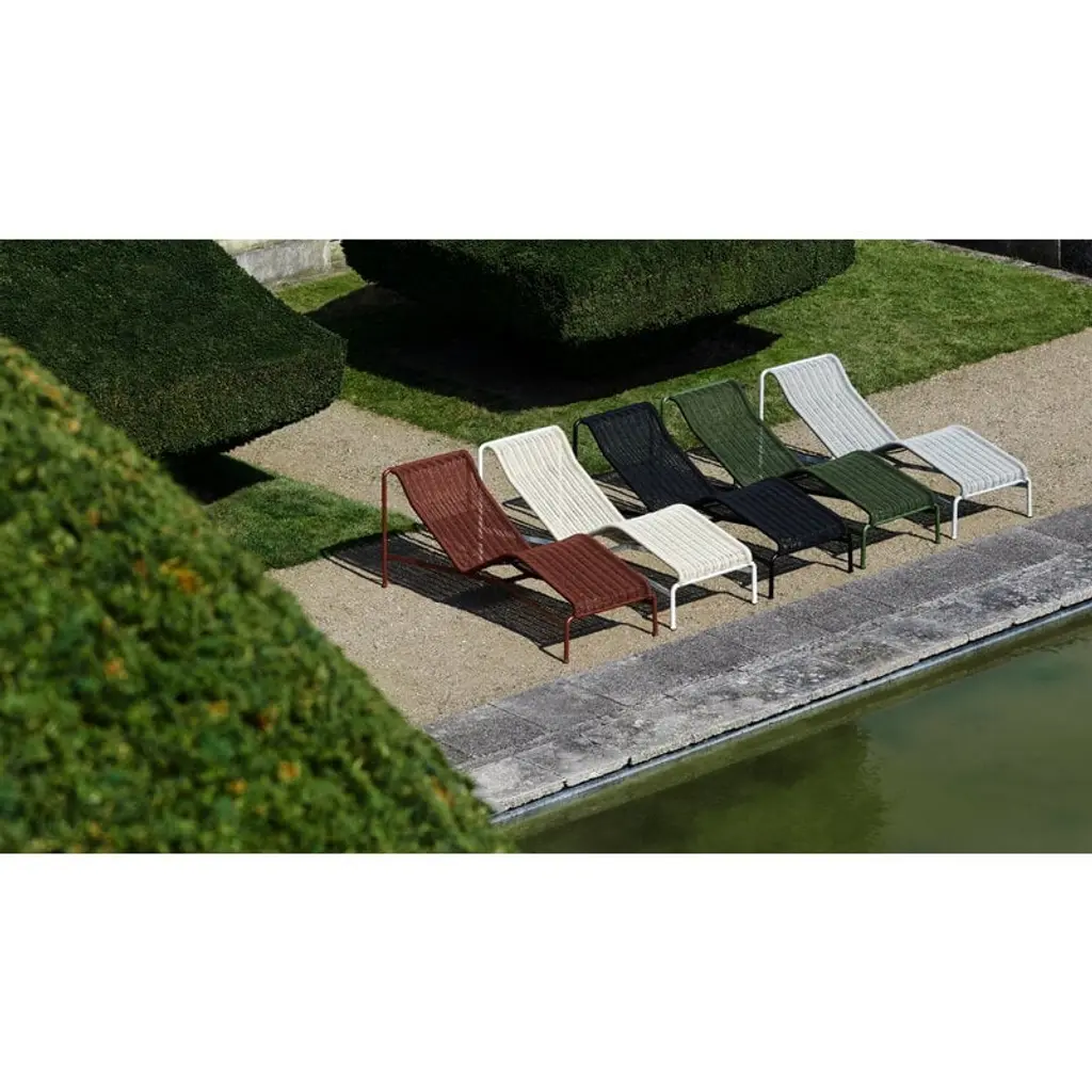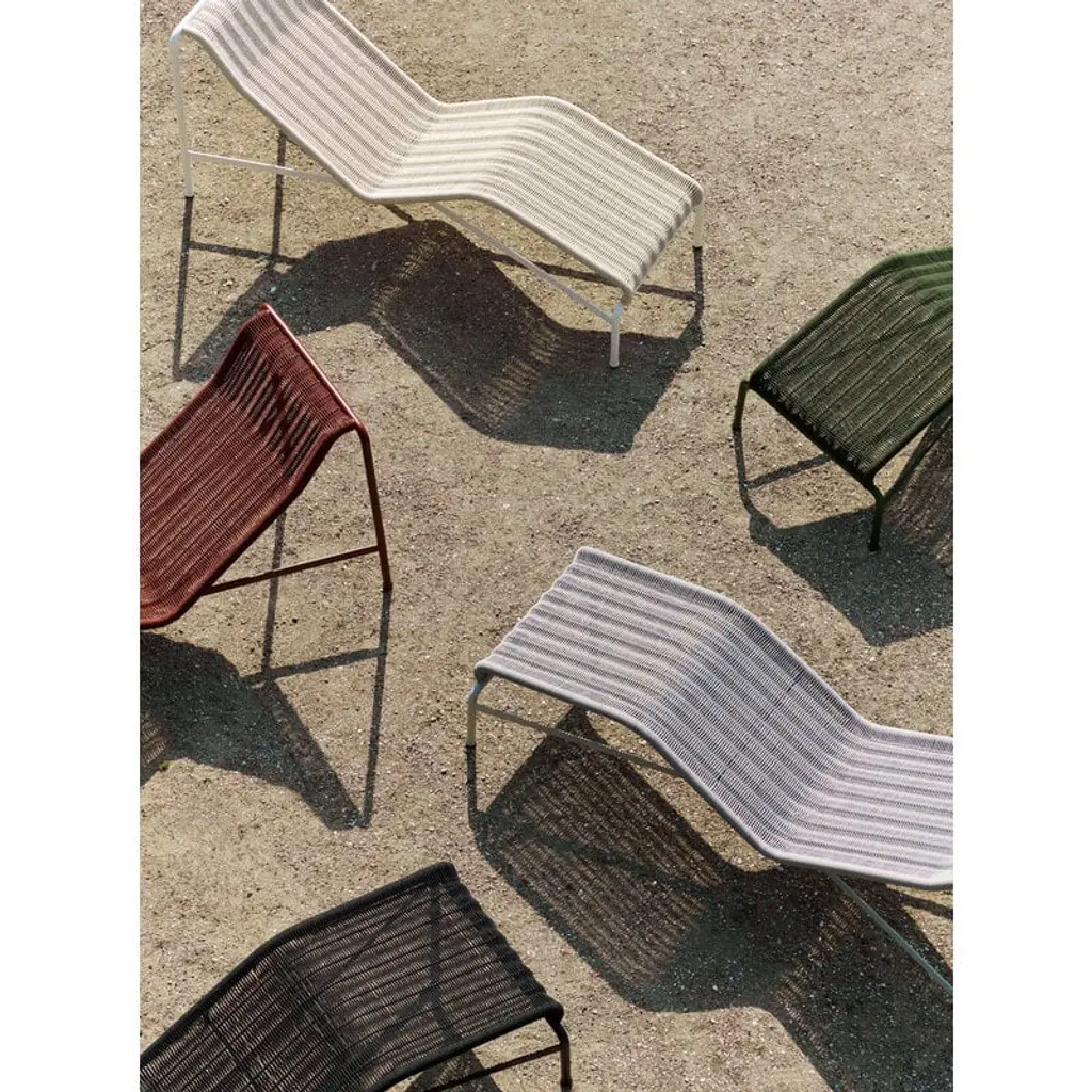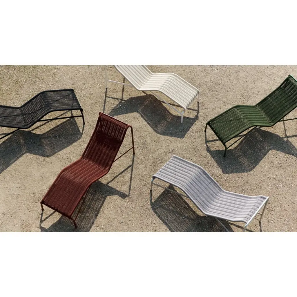 The Palissade Cord chaise longue updates the look of HAY's beloved Palissade range. The stylish chair still features the same familiar curved frame, but instead of the usual steel, the Palissade Cord sun lounger's seat is made from recycled polyester cord, adding a summery lightness to the chair's otherwise robust appearance. Ronan & Erwan Bouroullec spent no less than two years refining the Palissade range and it paid off! The result is a sturdy yet extremely elegant collection of outdoor furniture with a graphic look that is suitable for terraces, balconies, gardens and public spaces alike. The Palissade collection is designed to stand the test of time and weather, and its components make it easy to put together a functional outdoor furniture set for the home or summerhouse.
