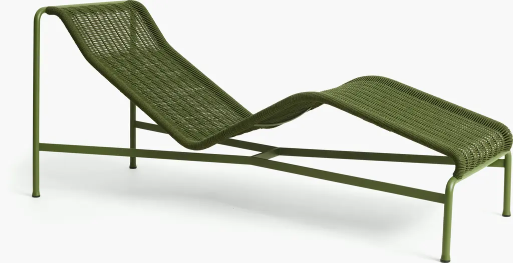 Rowan and Erwan Bouroullec's new Palissade Cord Collection puts a tactile spin on their versatile Palissade Collection for HAY. Recycled polyester cord is handwoven around a powder-coated steel frame to give it a softer expression while ensuring long-term durability. The Palissade Cord Chaise Lounge (2025) offers the perfect position to stretch out and lounge with no need for tweaks or adjustments. Elegant without being fragile and strong without being bulky, it brings high-quality craftsmanship to all-weather furniture. Made in China.