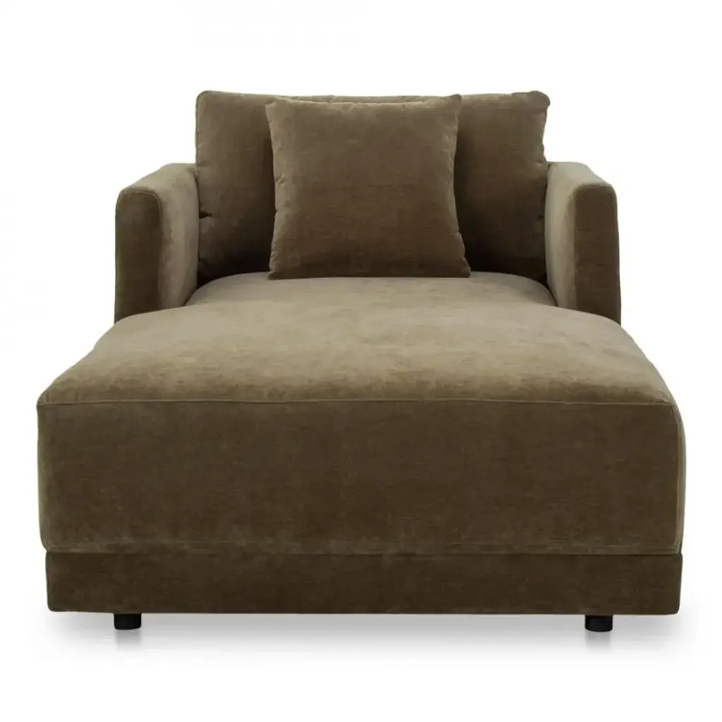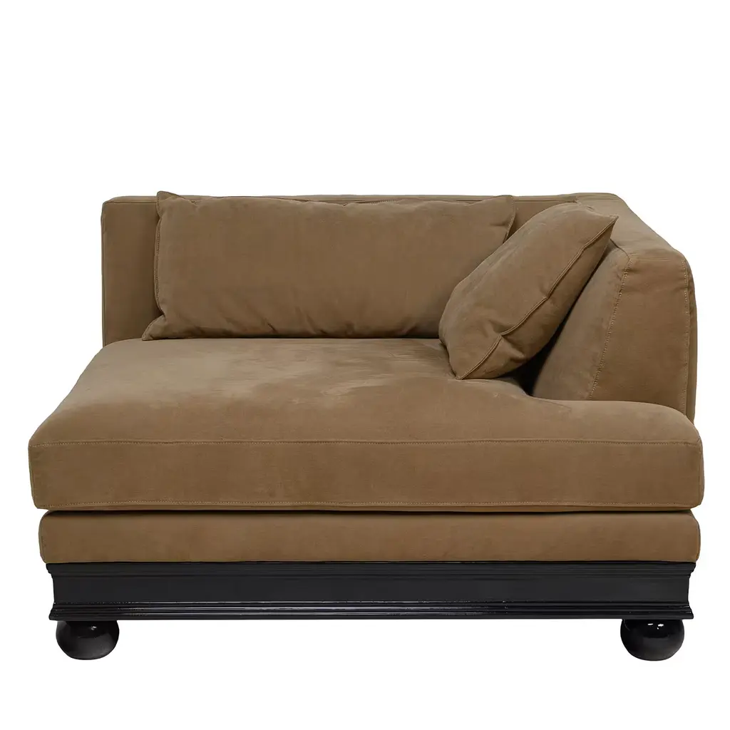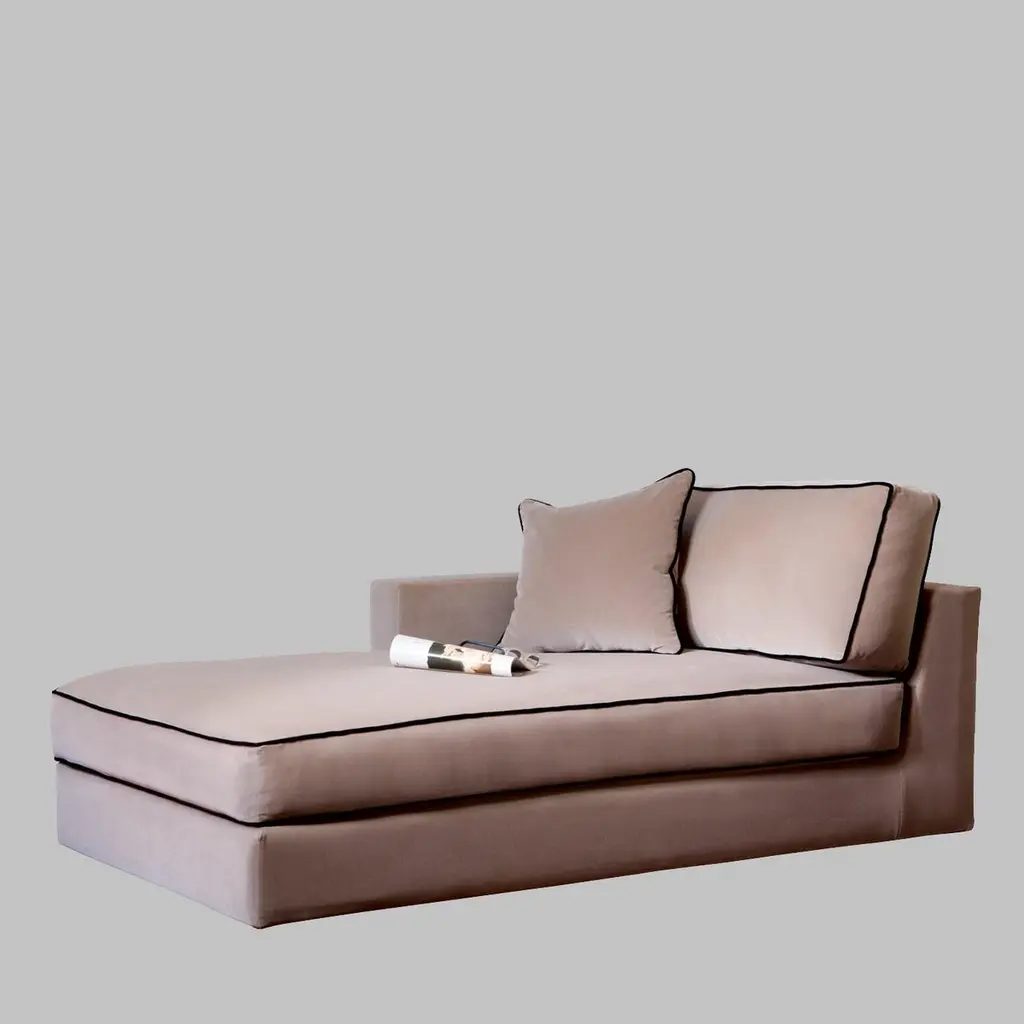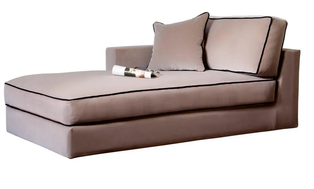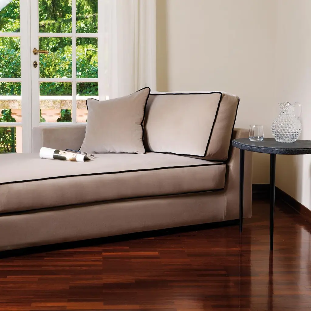 A superb addition to a contemporary or classic home, this chaise longue is a celebration of sophisticated lounging. The wooden structure is visible in the lacquered feet that support the plush base padded with a combination of goose down and polyurethane of different densities. With a seat 43 cm-high, this comfortable and welcoming sofa is equipped with pillows (not included). It is entirely upholstered with a light gray upholstery with contrasting piping for a striking visual impact.