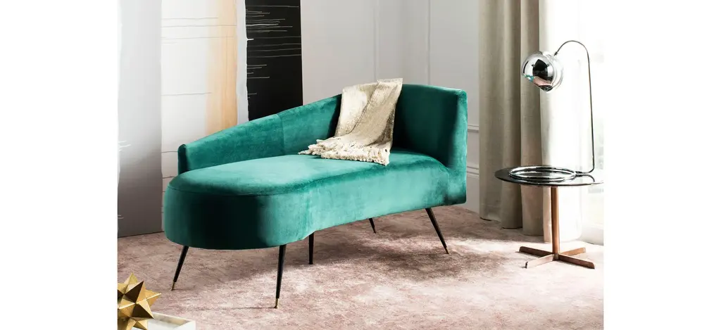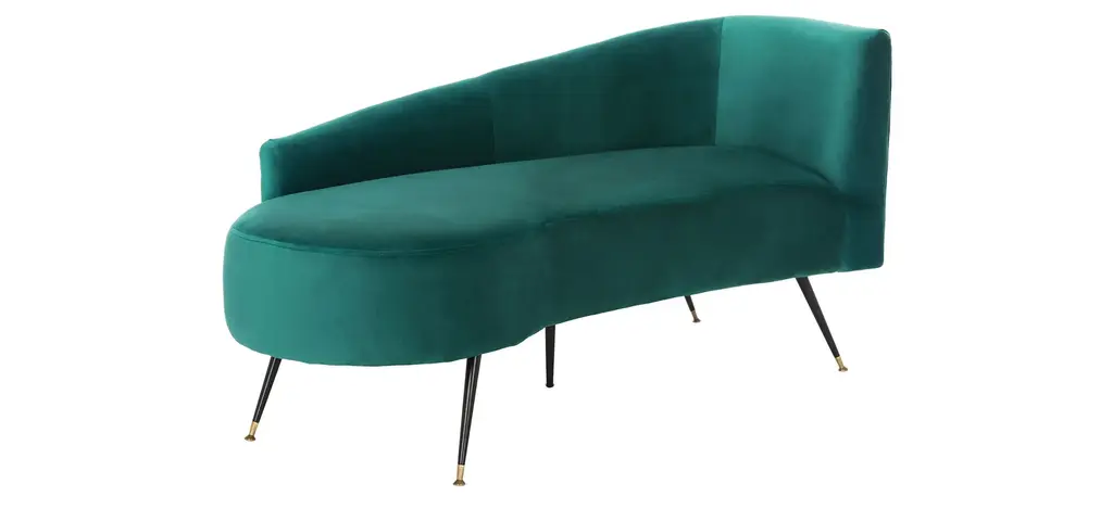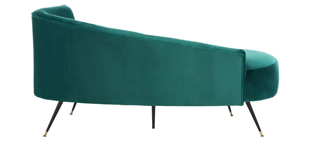 Embrace the art of relaxation with this Phoebe Settee. Designed with gentle curves and chic angles, Phoebe's plush emerald velvet upholstery transforms any living room into a soothing escape. Designers love its black metal legs and chic gold caps.