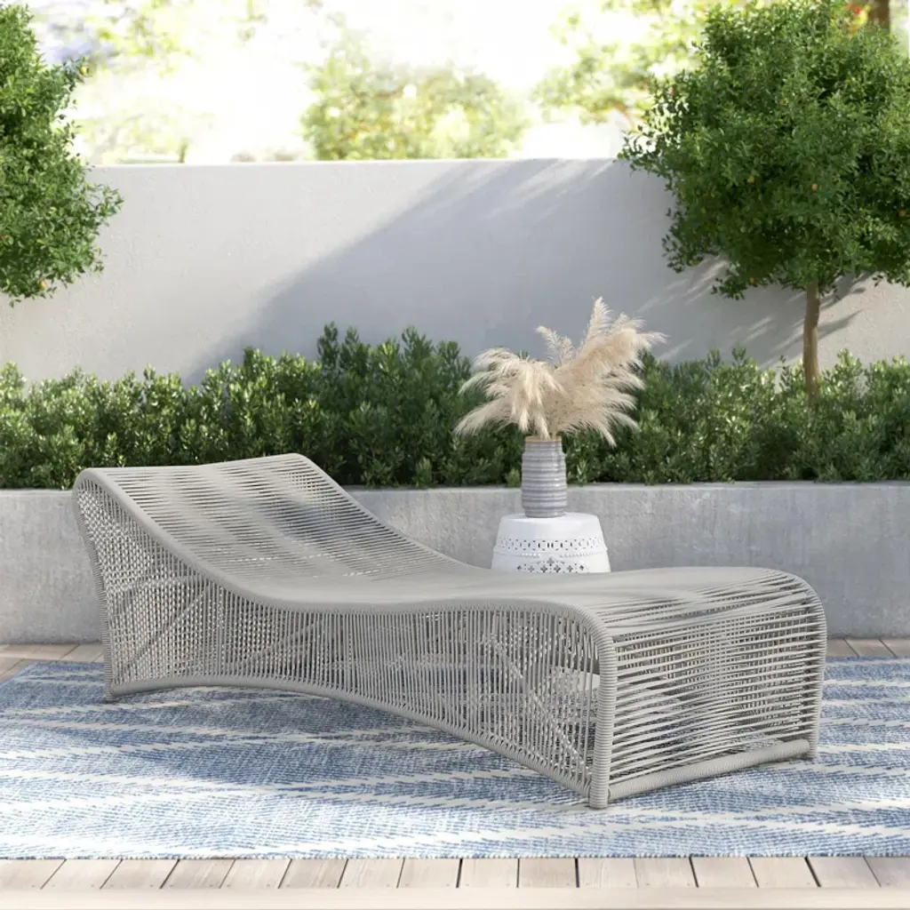 Shine a little sunny style on your terrace with this clean-lined chaise lounge. It's crafted with an aluminum frame that's wound in textured gray rope with a wicker-inspired weave. It strikes a sinuous silhouette and features a light and airy gray shade that feels so current. This patio chaise lounge holds up to sunny and wet weather without fading or rusting, so it'll stay looking crisp through long afternoons by the pool. So worth it: This sun lounger arrives fully assembled, so you can get right to relaxing.