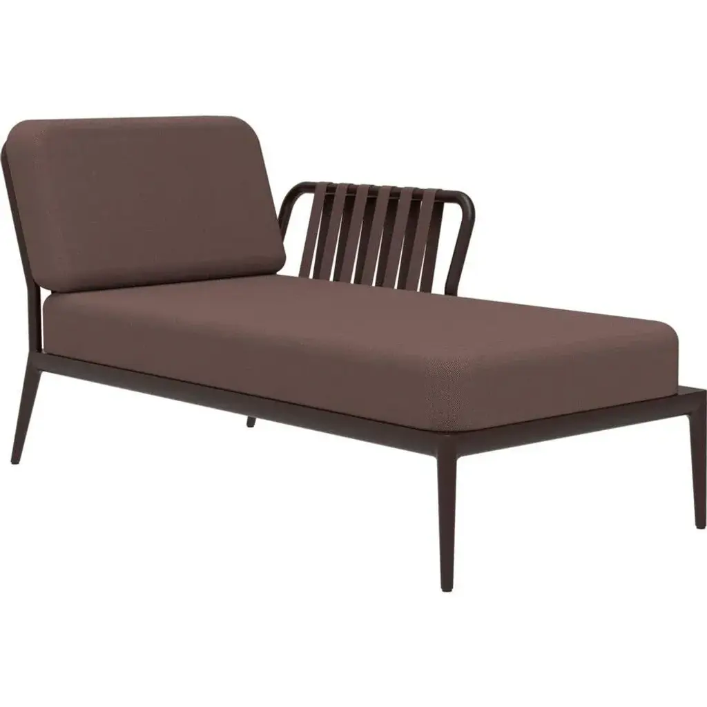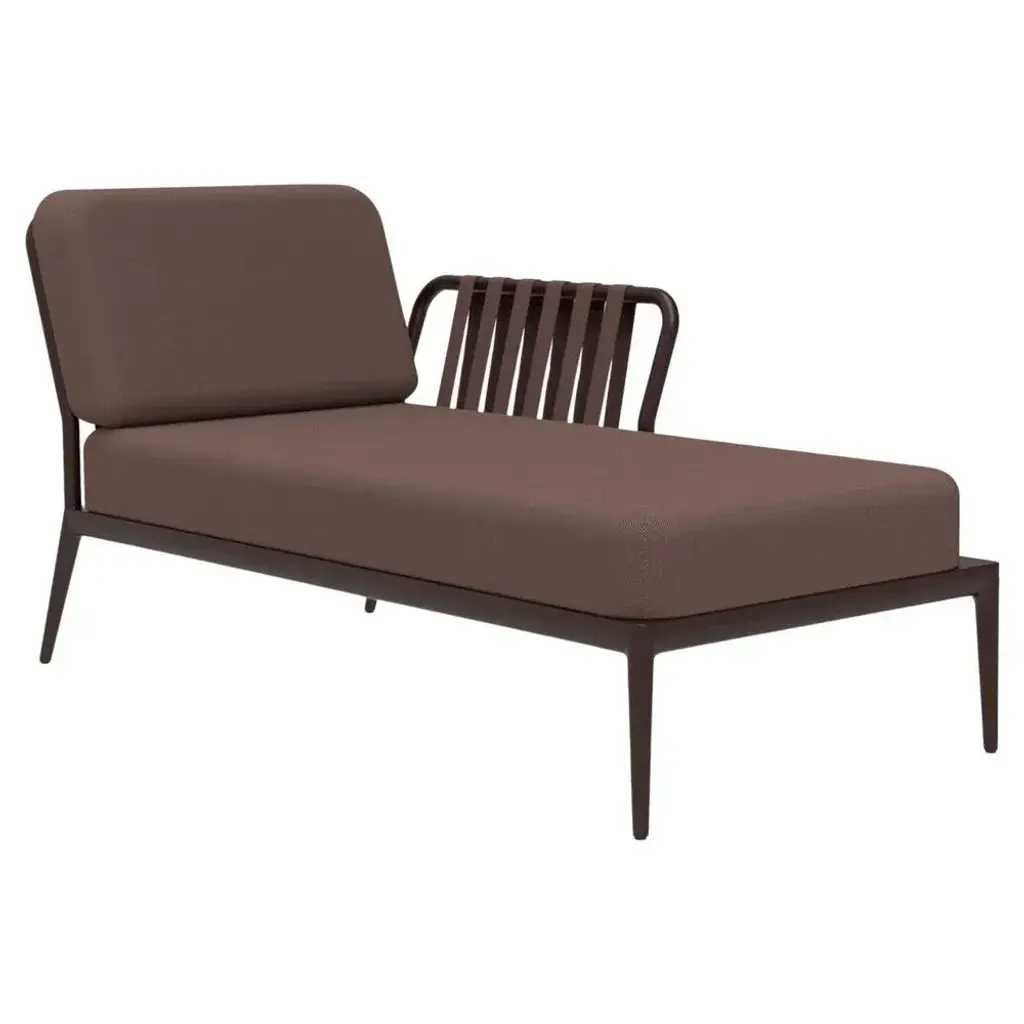 Ribbons chocolate left chaise longue by mowee dimensions: d80 x w155 x h81 cm material: aluminum, upholstery weight: 28 kg also available in different colours and finishes. An unmistakable collection for its beauty and robustness. A tribute to the valencian manufacturing tradition as a challenge to innovation, making it sustainable and durable. A collection with details that make it unique. We discover its most representative side, ribbons. Engineering and tradition come together, thus achieving a collection with its own character.