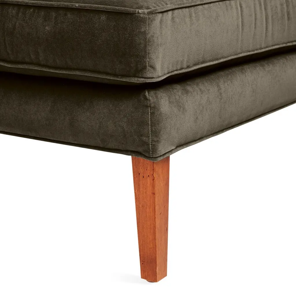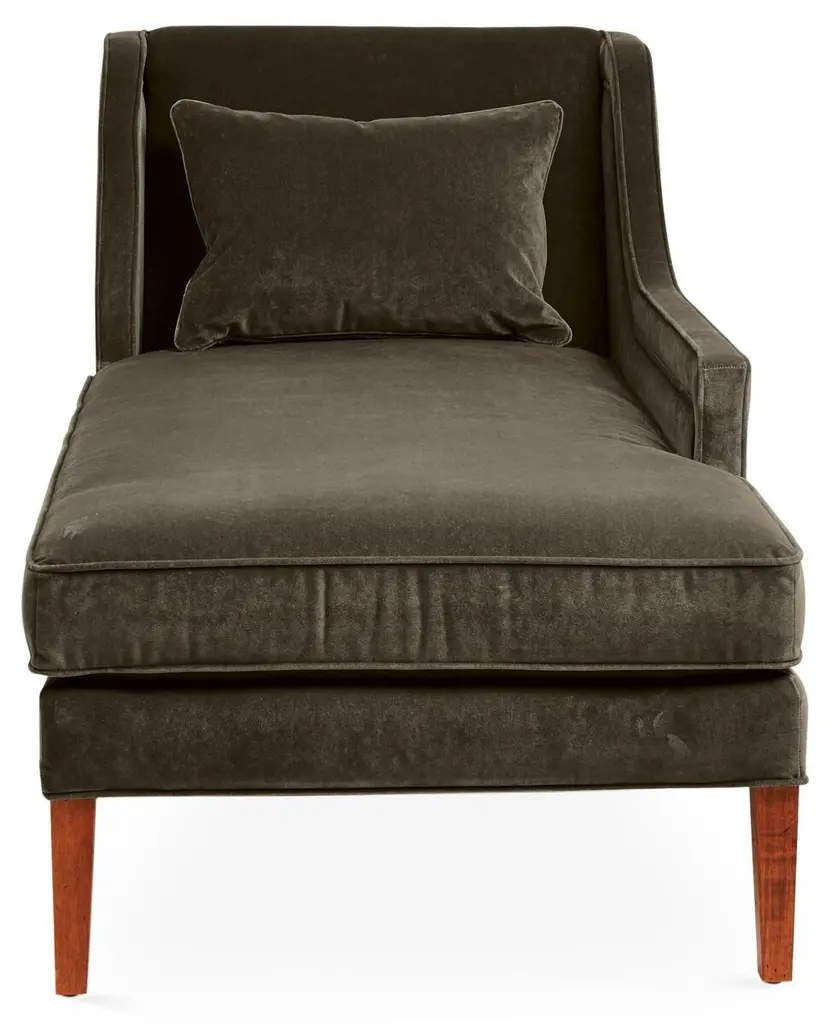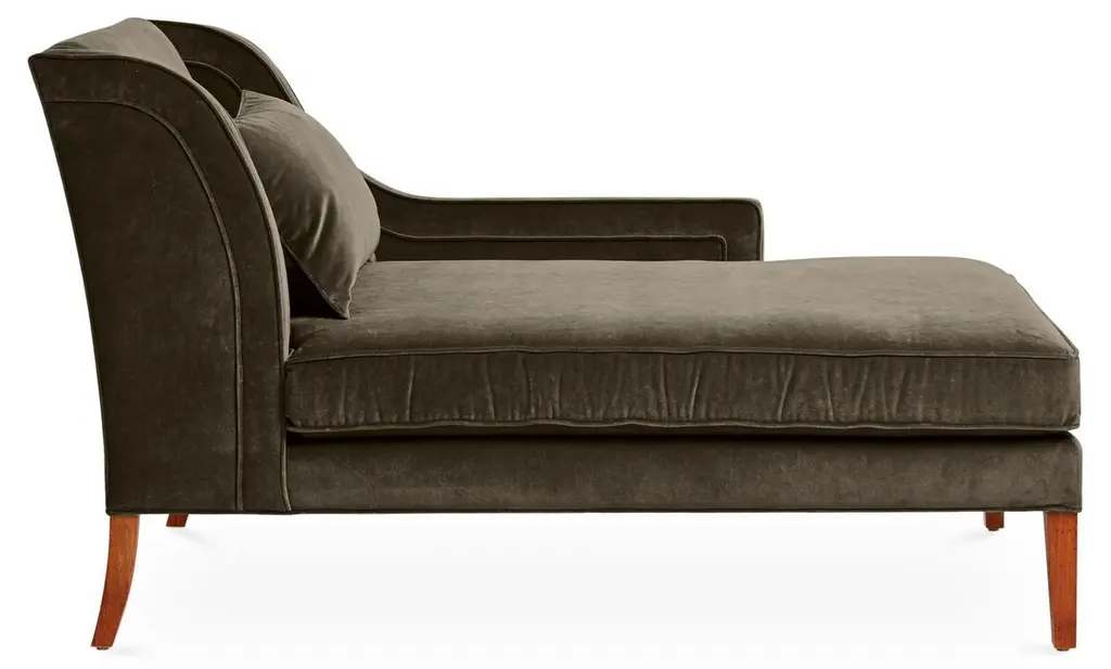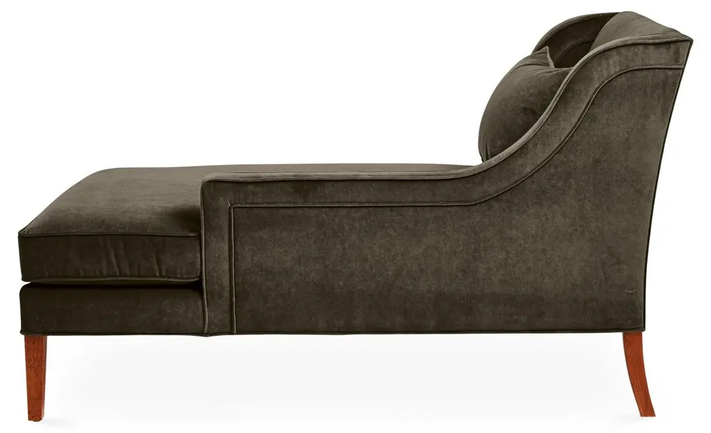 Designed by us and available only at One Kings Lane: This classic chaise promotes stylish lounging with its beautifully contoured, wingback-style frame and velvet upholstery in a rich charcoal hue with a pronounced self welt. A generous fill of foam wrapped in down with a cotton duck core ensures lasting comfort and support. Made in the USA.