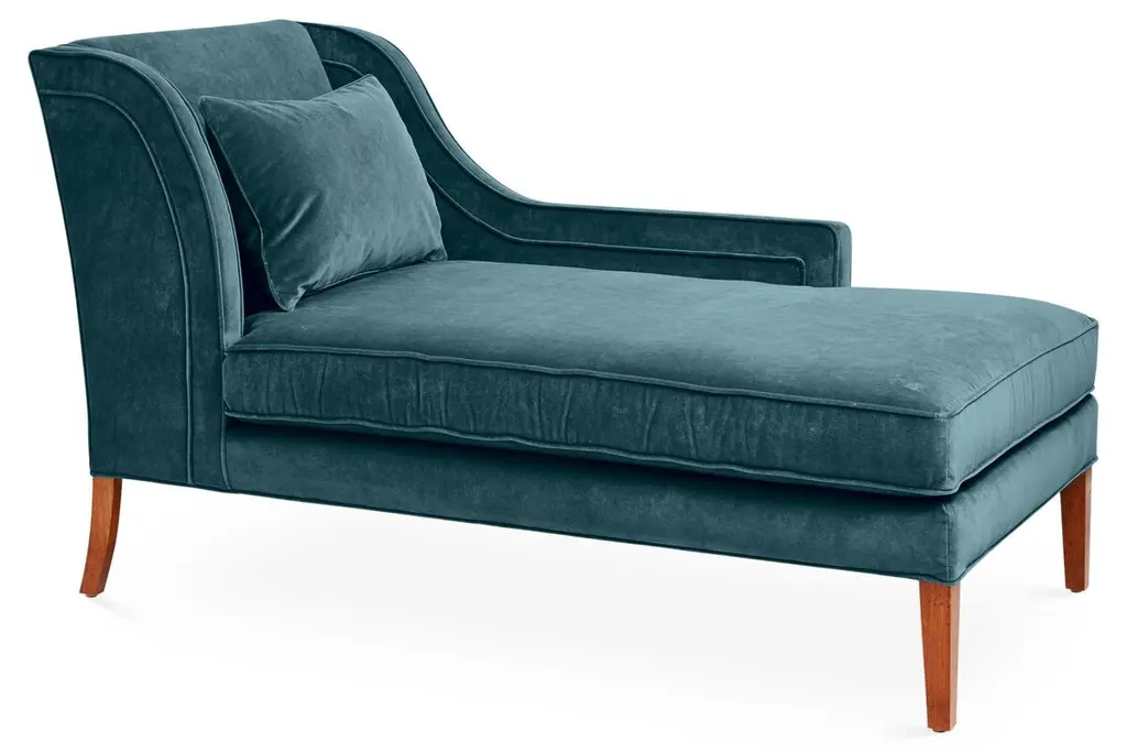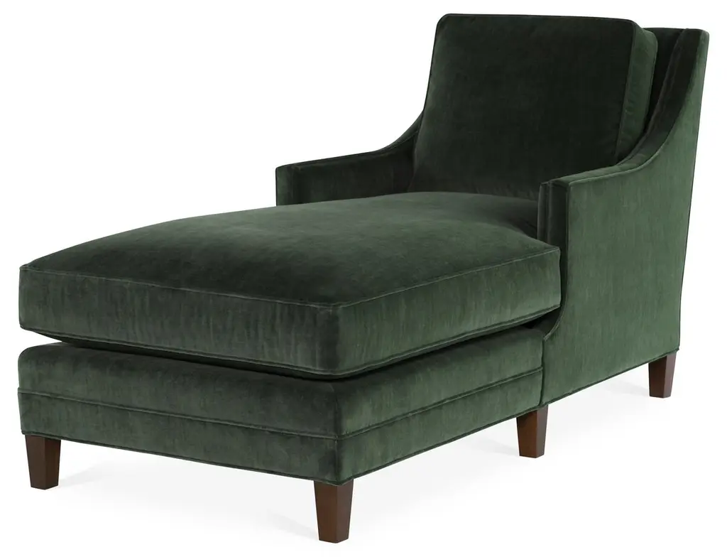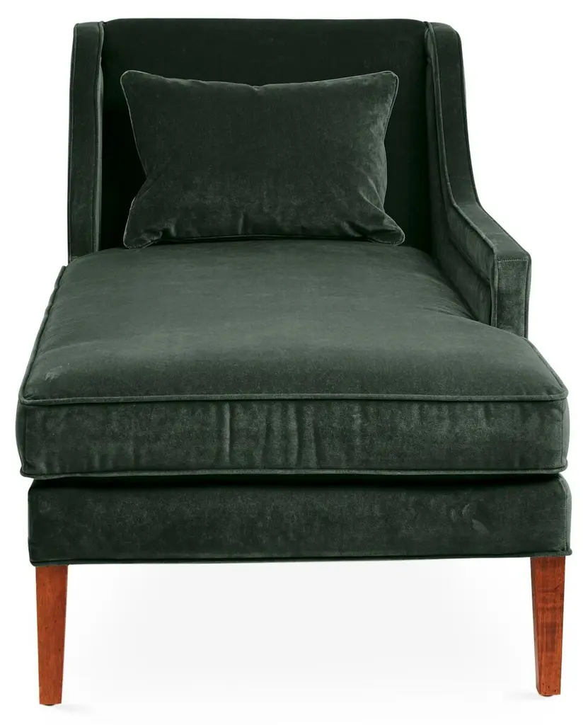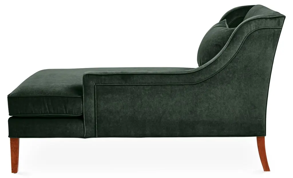Designed by us and available only at One Kings Lane: This classic chaise promotes stylish lounging with its beautifully contoured, wingback-style frame and velvet upholstery in a forest green hue with a pronounced self welt. A generous fill of foam wrapped in down with a cotton duck core ensures lasting comfort and support. Made in the USA.