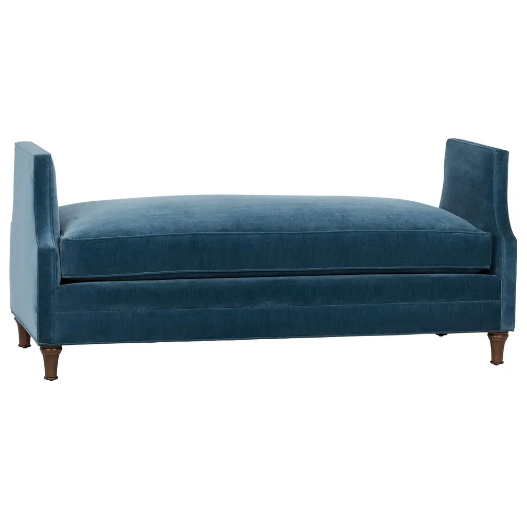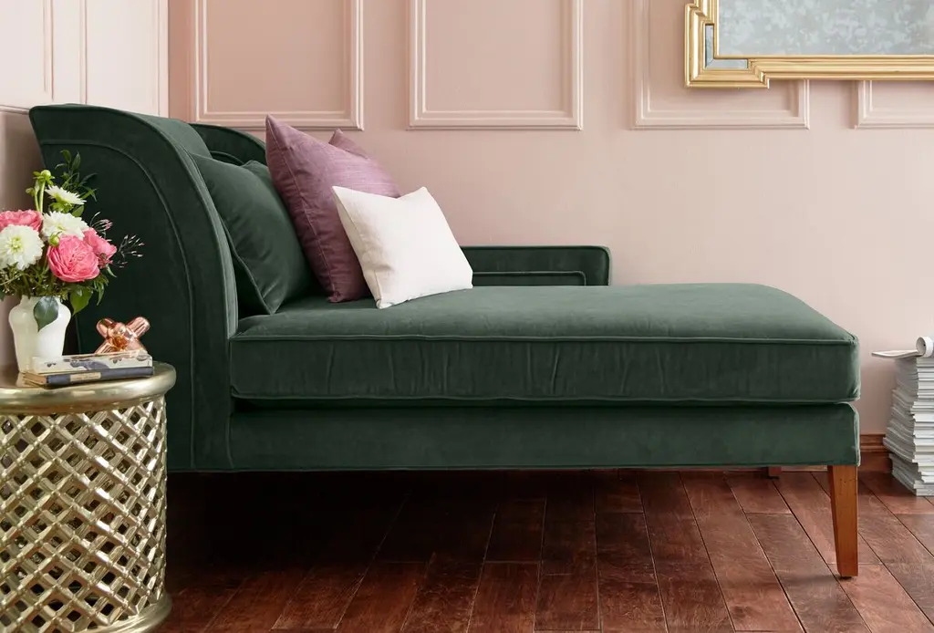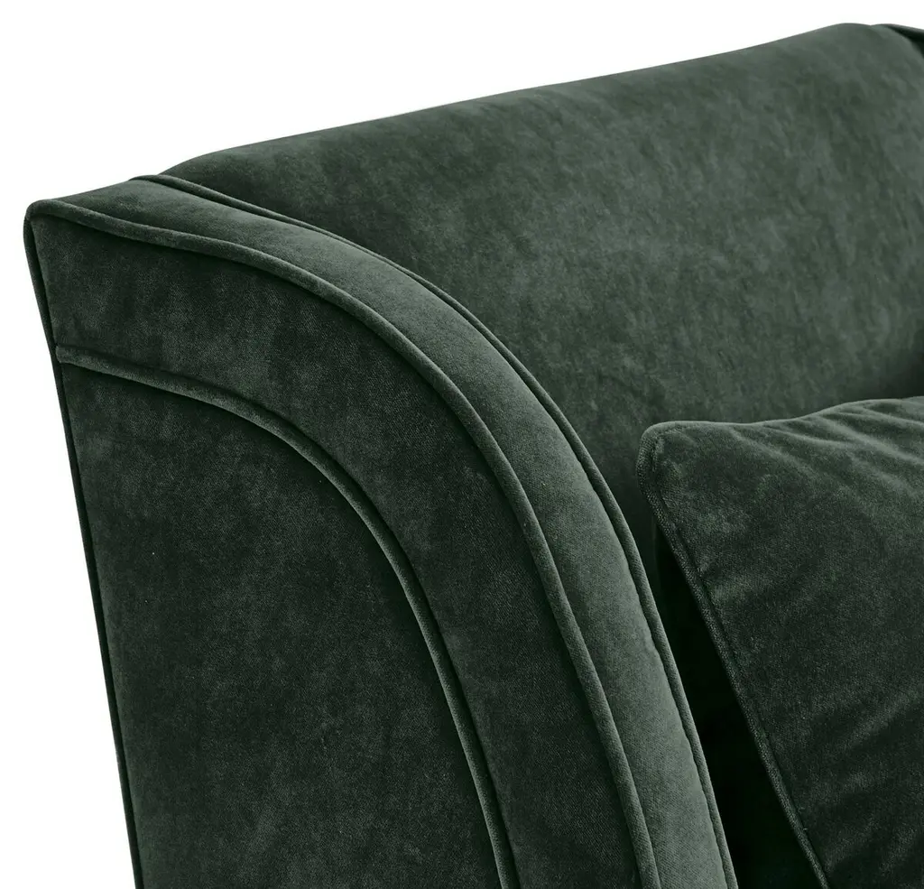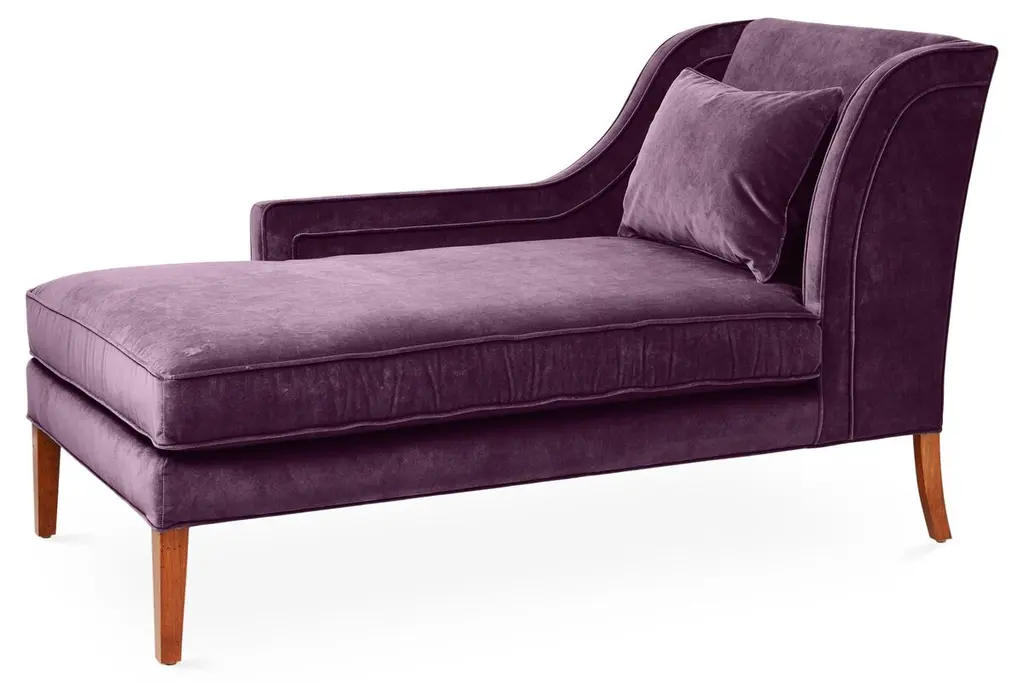 Designed by us and available only at One Kings Lane: This classic chaise promotes stylish lounging with its beautifully contoured, wingback-style frame and velvet upholstery in a forest green hue with a pronounced self welt. A generous fill of foam wrapped in down with a cotton duck core ensures lasting comfort and support. Made in the USA.