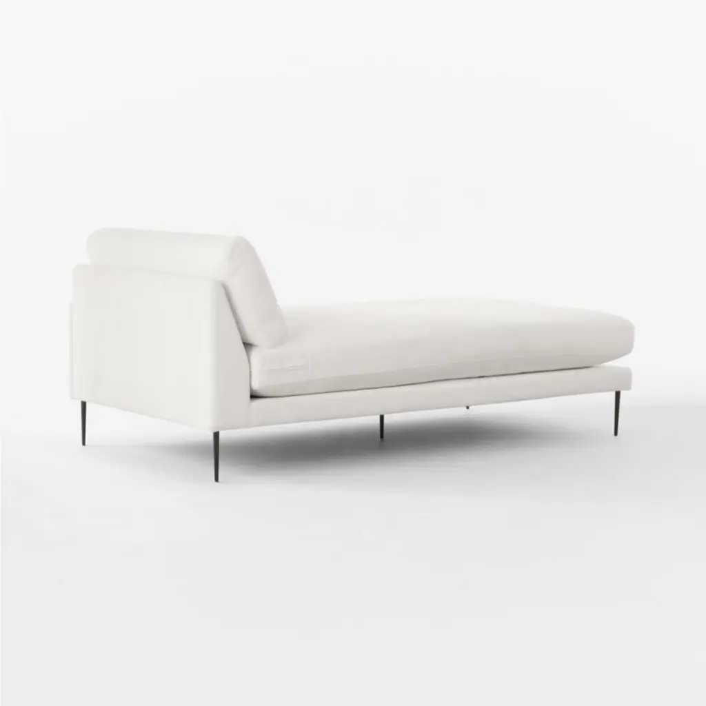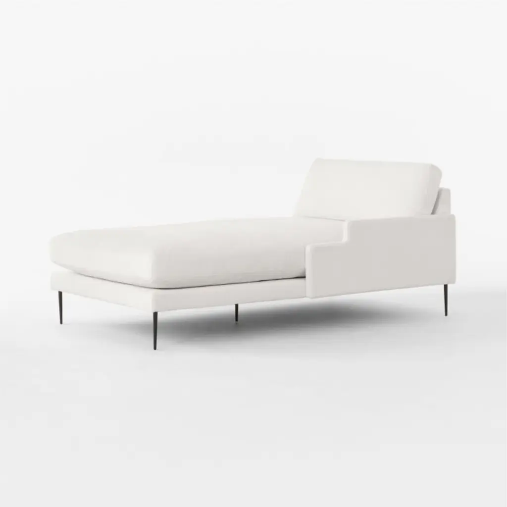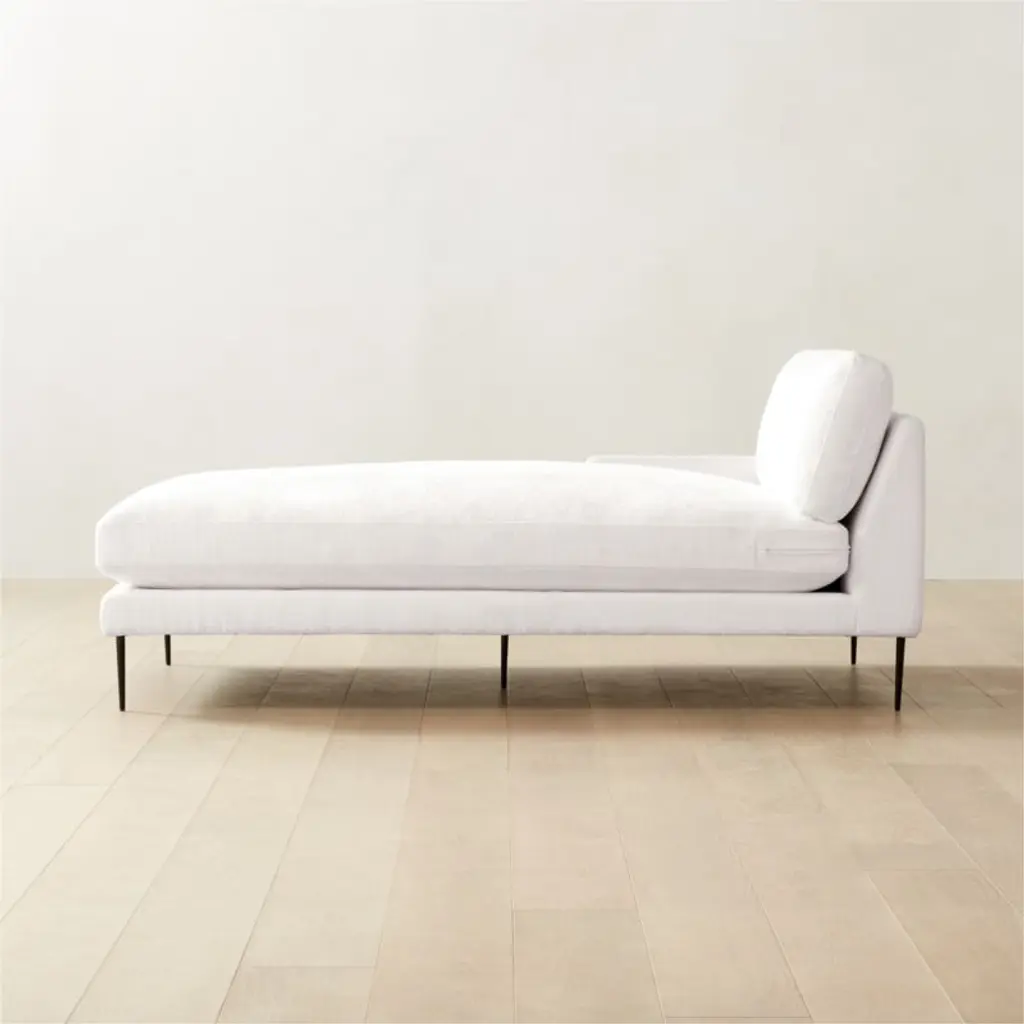 White right arm chaise by Mermelada Estudio feels traditional at first, but reveals modern sensibilities upon closer inspectionlike thin profile arms and a sleek silhouette. Tall, needlelike metal legs finished in a lustrous black powdercoat create graphic contrast with white upholstery. CB2 exclusive.