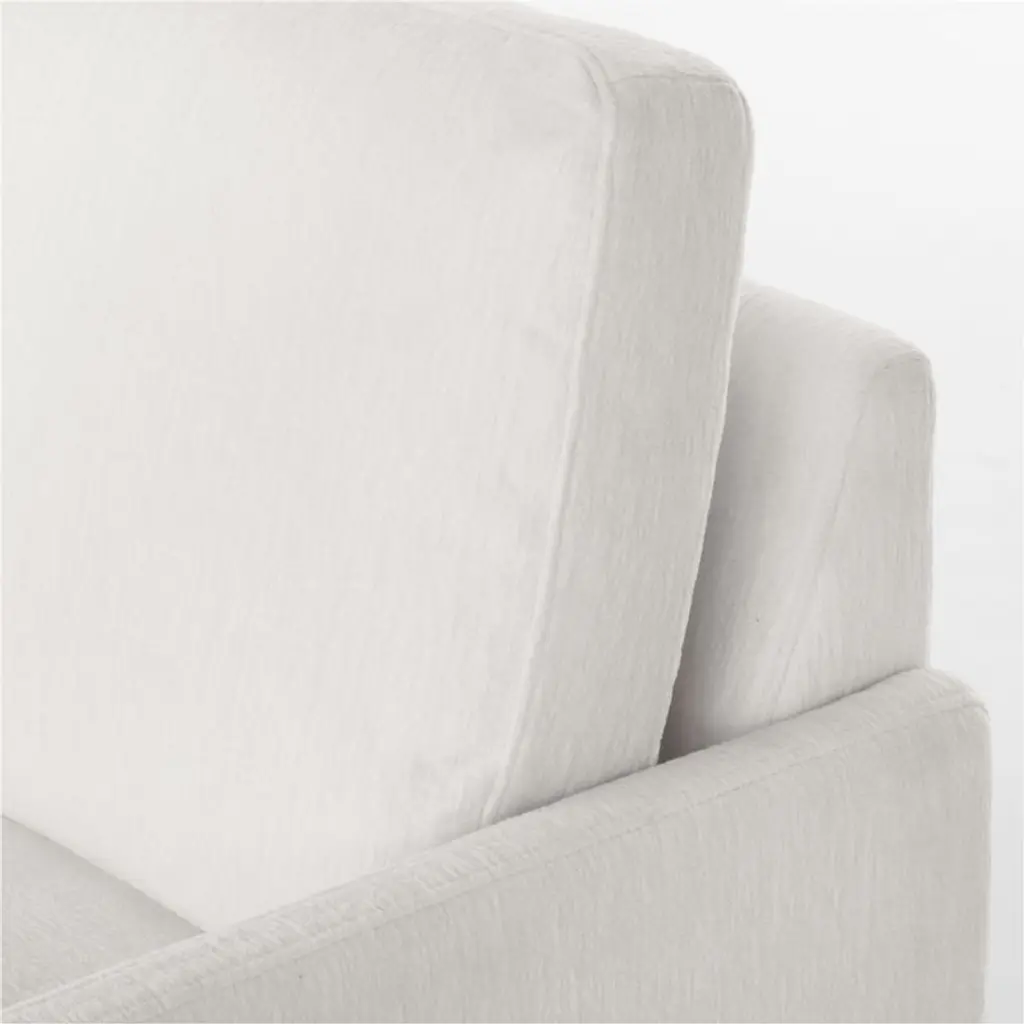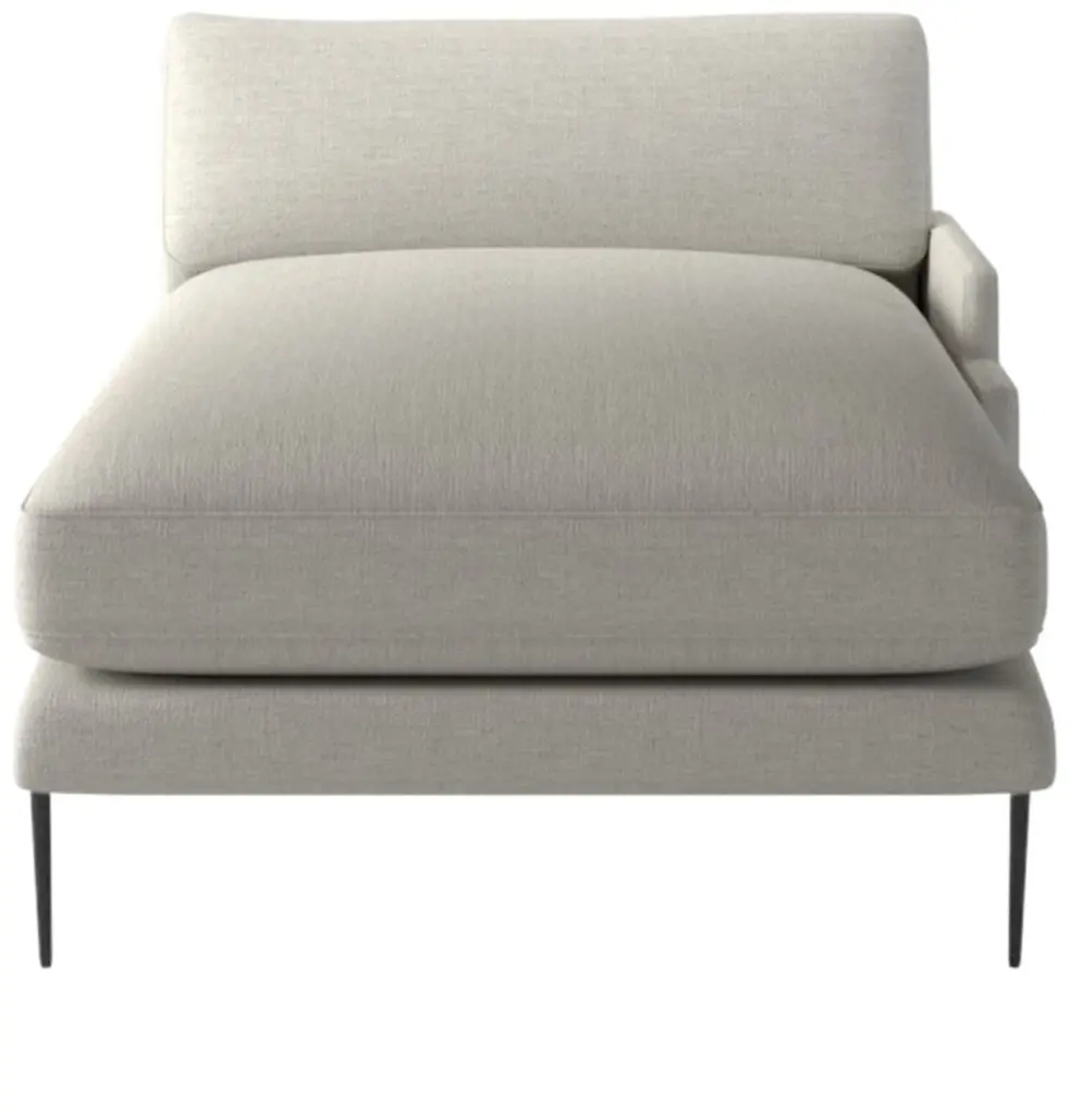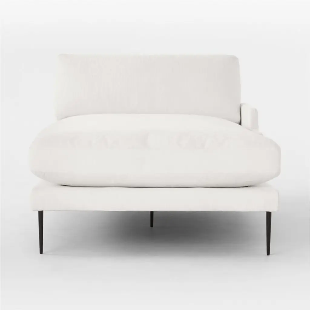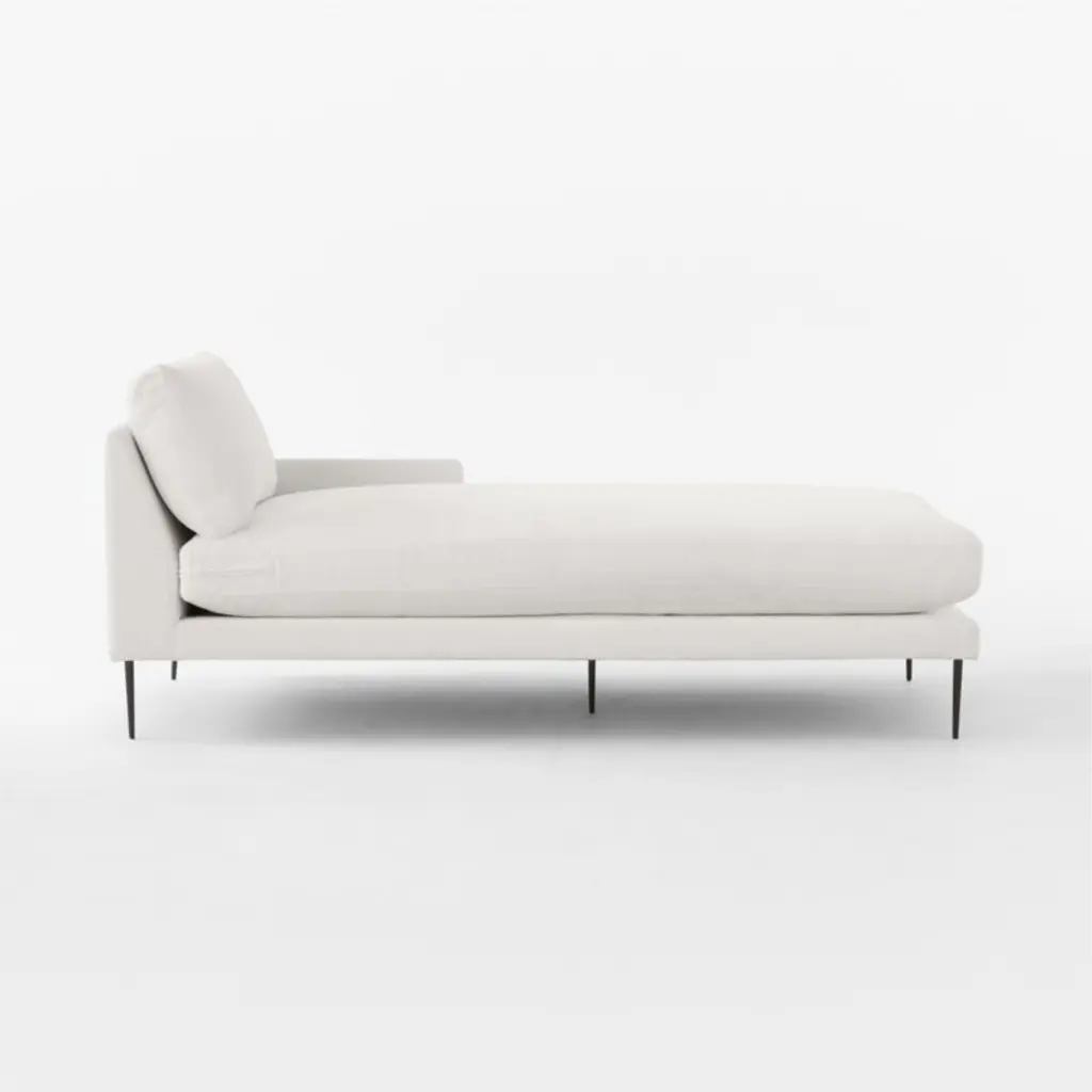 White right arm chaise by Mermelada Estudio feels traditional at first, but reveals modern sensibilities upon closer inspectionlike thin profile arms and a sleek silhouette. Tall, needlelike metal legs finished in a lustrous black powdercoat create graphic contrast with white upholstery. CB2 exclusive.