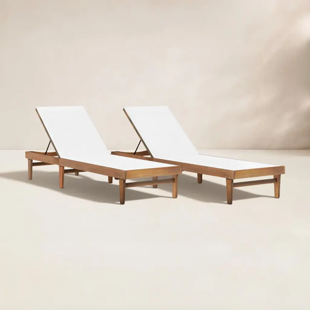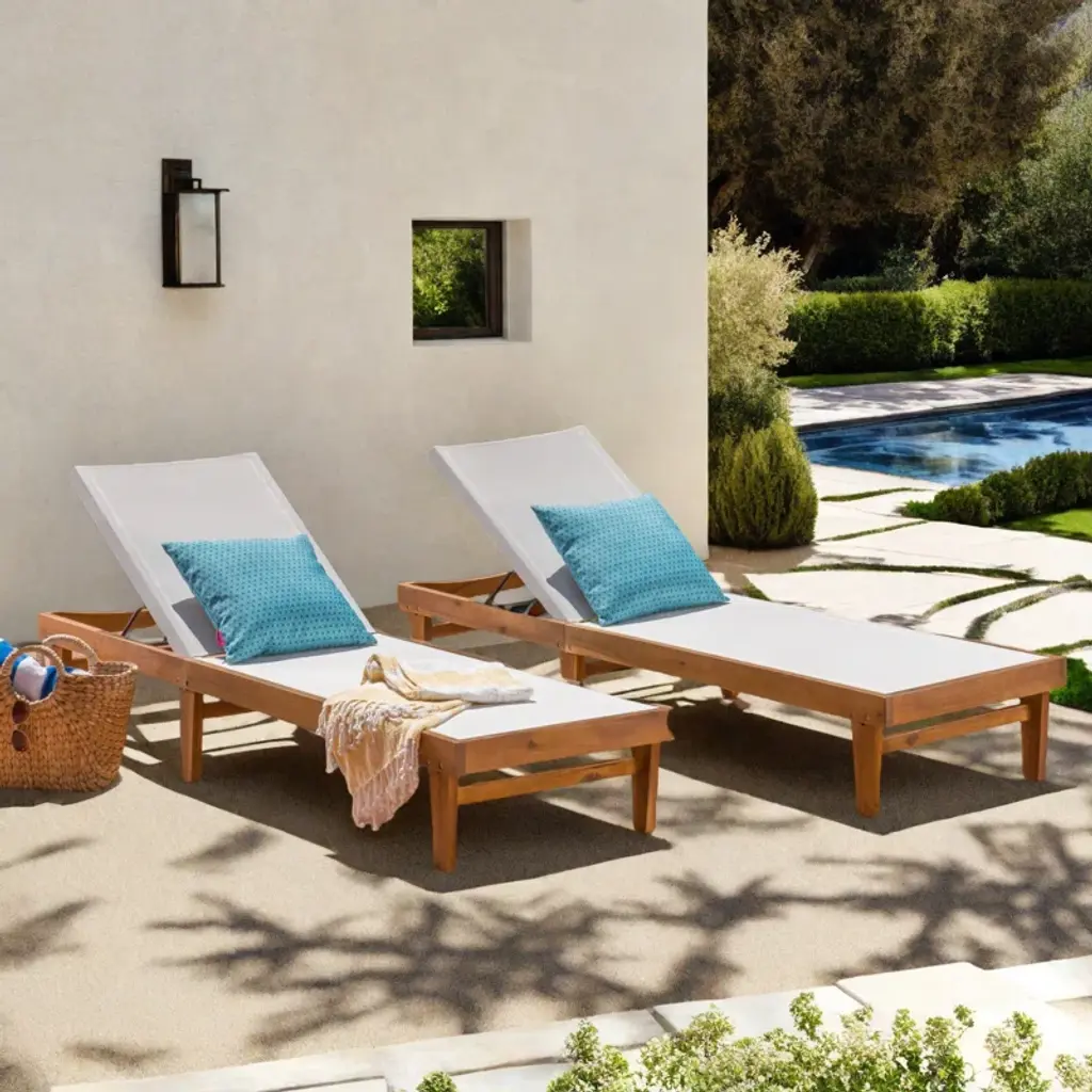 These outdoor chaise lounges are the perfect way to add some relaxation to your patio and backyard. Made from sustainably sourced acacia wood with a specially made mesh for the seat, these lounges are both comfortable and stylish. Enjoy these traditional-style lounges all summer long, and give yourself the freedom to relax with your favorite book or take a nap under the summer sun with these refreshing chaise lounges. Assembly is required upon arrival.