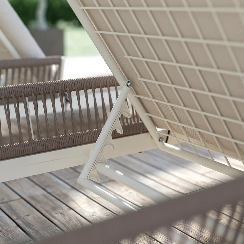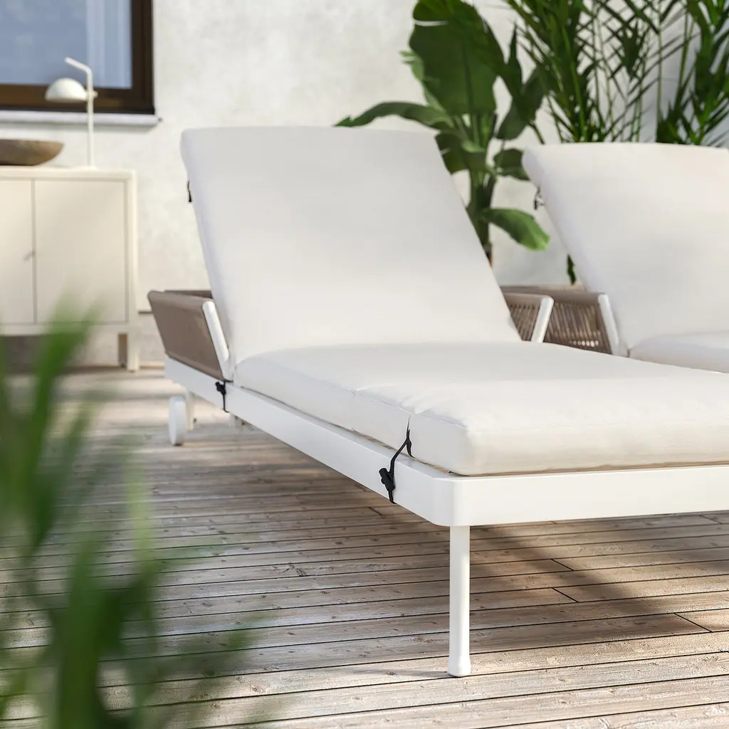 SEGERÖN Chaise - outdoor white/beige/Frösön/Duvholmen beige. This product is durable and easy to care for, since it’s made of a powder-coated steel frame and rope that is handwoven onto the product. The back can be adjusted to five different position. Wheels make it easy to move.