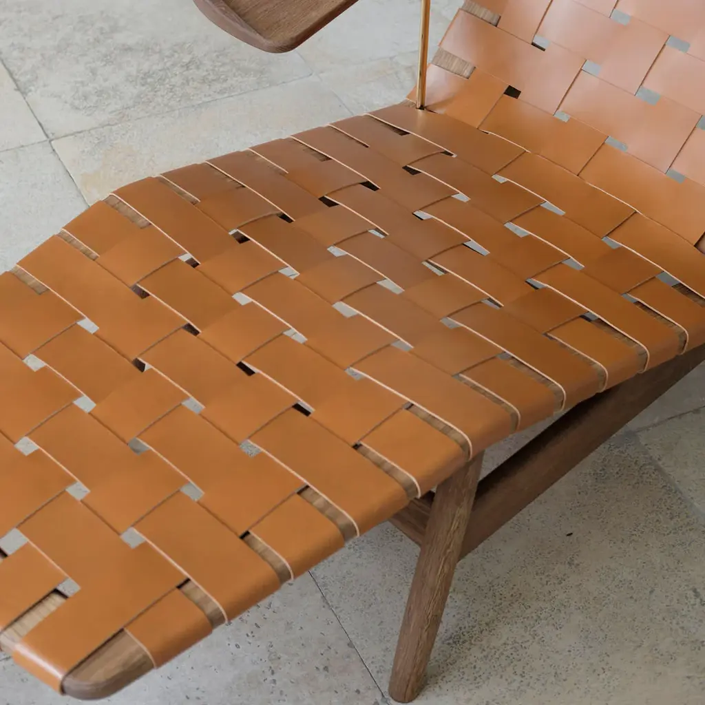 One of Danish architect Arne Vodder's favorite pieces of furniture was the AV Egoist chaise lounge he designed in the early 1950s, only a few of which were made. A rarity, timeless and unique, the AV Egoist chaise lounge was a personal favorite of Danish architect and designer Arne Vodder (1926-2009). Even so, only a few were manufactured after it was designed in the early 1950s. This is now being made up for. Danish manufacturer Sibast Furniture has delved into the archives – together with Michael Vodder, son of Arne Vodder – and, with the help of some old drawings, measurements and a few photos, their joint efforts have succeeded in recreating the chaise lounge, which Michael Vodder doesn't hesitate to call his father's signature piece of furniture. The AV Egoist chaise lounge is available in walnut or FSC-certified oak in finishes soap, white oil, natural oil, dark oil and smoked. Woven shoulder leather in black, brandy and nature. The chaise lounge is available with a cushion for the back of the head, as well as a side table of brass and solid oak or walnut. Side Table sold separately.