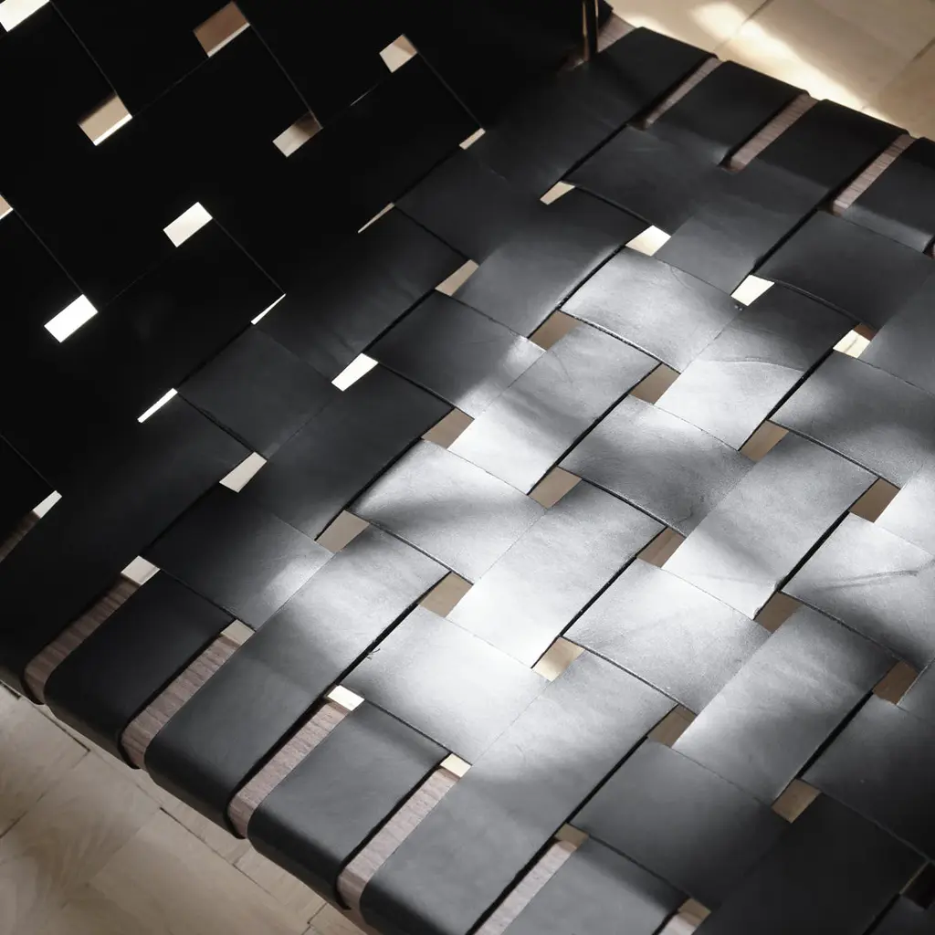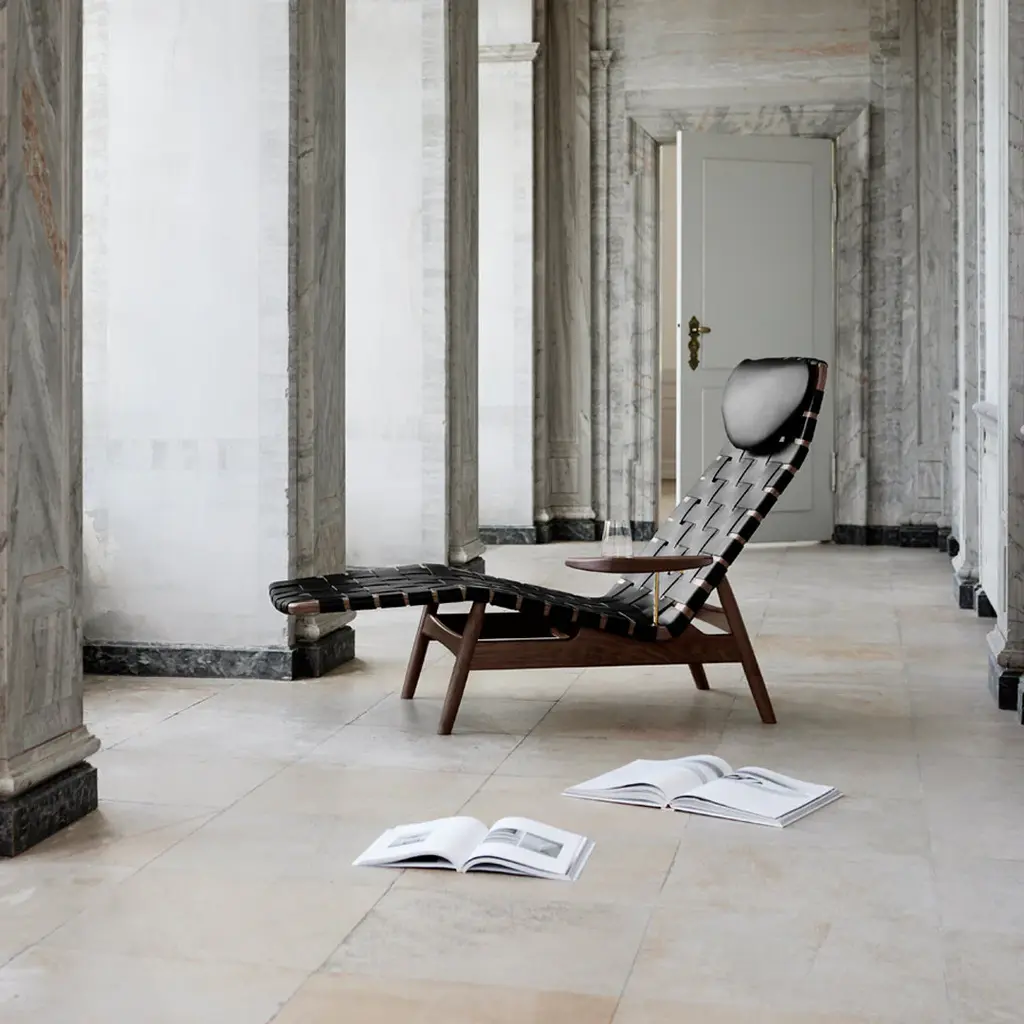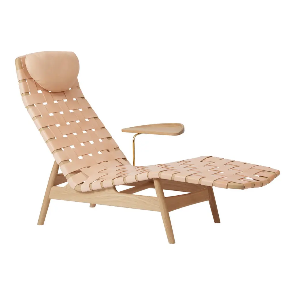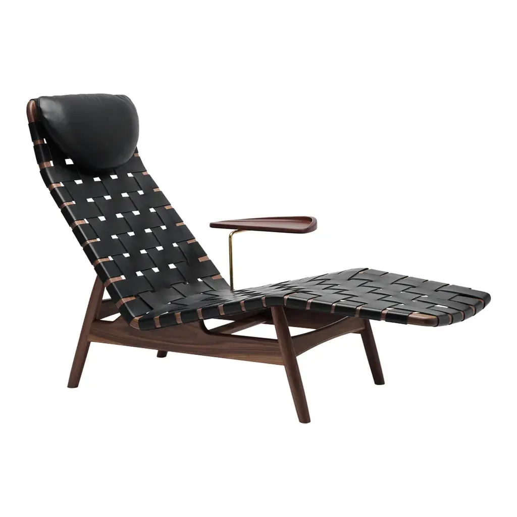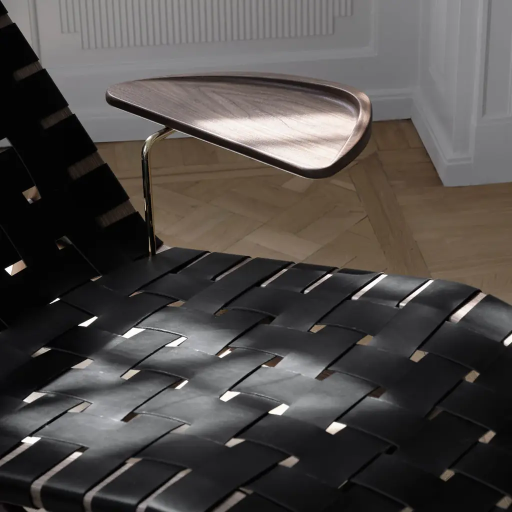 One of Danish architect Arne Vodder's favorite pieces of furniture was the AV Egoist chaise lounge he designed in the early 1950s, only a few of which were made. A rarity, timeless and unique, the AV Egoist chaise lounge was a personal favorite of Danish architect and designer Arne Vodder (1926-2009). Even so, only a few were manufactured after it was designed in the early 1950s. This is now being made up for. Danish manufacturer Sibast Furniture has delved into the archives – together with Michael Vodder, son of Arne Vodder – and, with the help of some old drawings, measurements and a few photos, their joint efforts have succeeded in recreating the chaise lounge, which Michael Vodder doesn't hesitate to call his father's signature piece of furniture. The AV Egoist chaise lounge is available in walnut or FSC-certified oak in finishes soap, white oil, natural oil, dark oil and smoked. Woven shoulder leather in black, brandy and nature. The chaise lounge is available with a cushion for the back of the head, as well as a side table of brass and solid oak or walnut. Side Table sold separately.