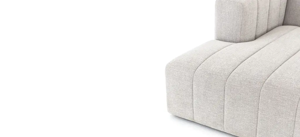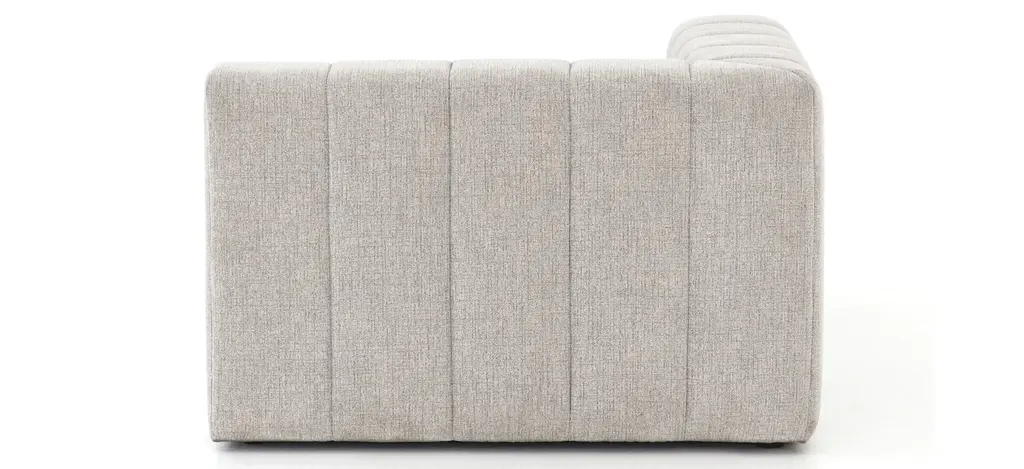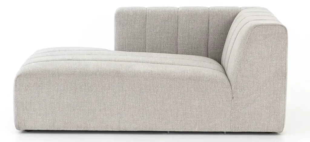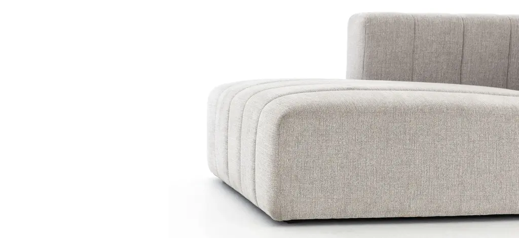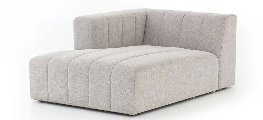 The Sparrow modular left-arm-facing chaise features wide, vertical channels and low styling. The chaise offers a textural sense to sandstone-colored covering.
