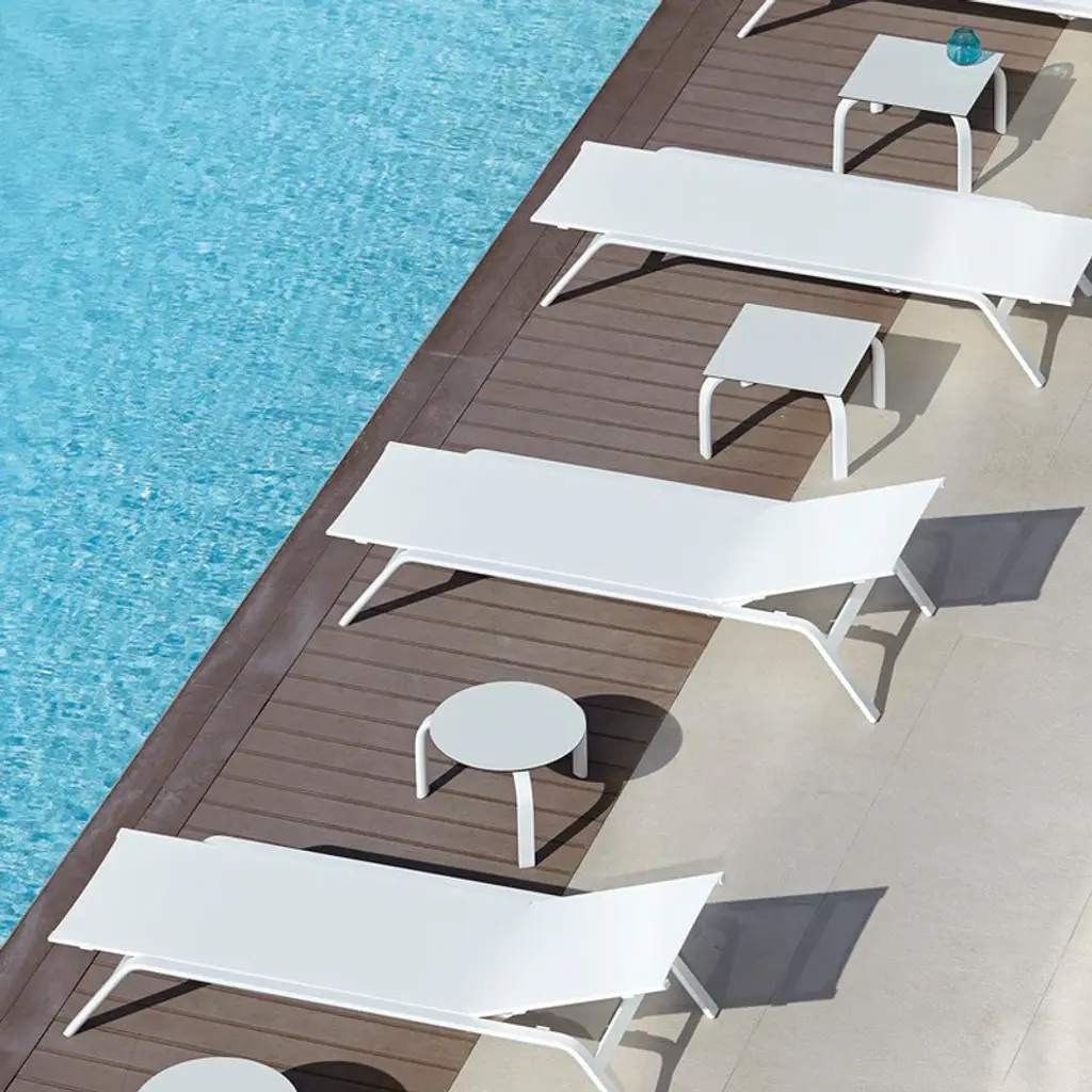 STACK was inspired by the nautical world, and recalls the stylistic shapes of the 1960s and 1970s. It is a collection of outdoor furniture with a clear and sincere structure that configures a set of elementary, balanced and extremely light pieces, due to the materials and the formal concept that govern the entire collection.” The STACK chaise longue table breathes the same spirit. It is an outdoor table, designed by Borja Garcia and made with an extruding aluminum structure that is stackable and has its own personality, which lightly stands a few inches above the floor. This stackable, multi-purpose table with its own personality, works by itself, and adapts to any Contract or residential space. Features