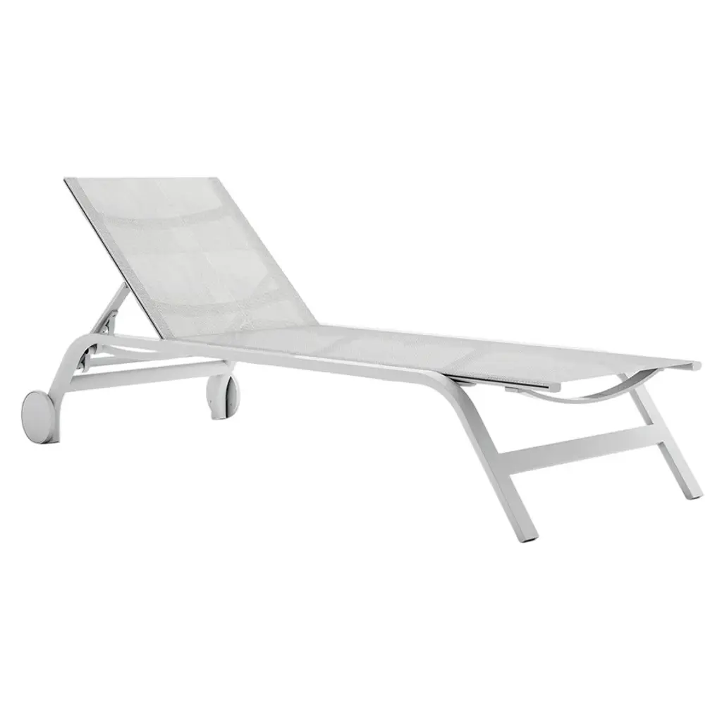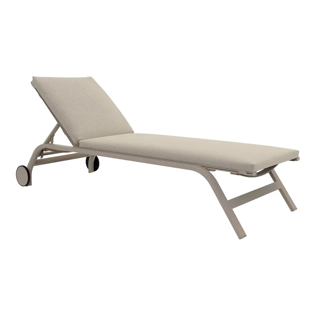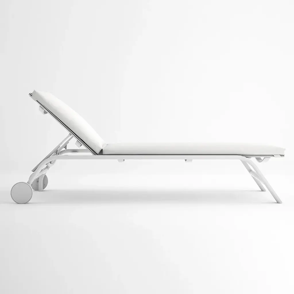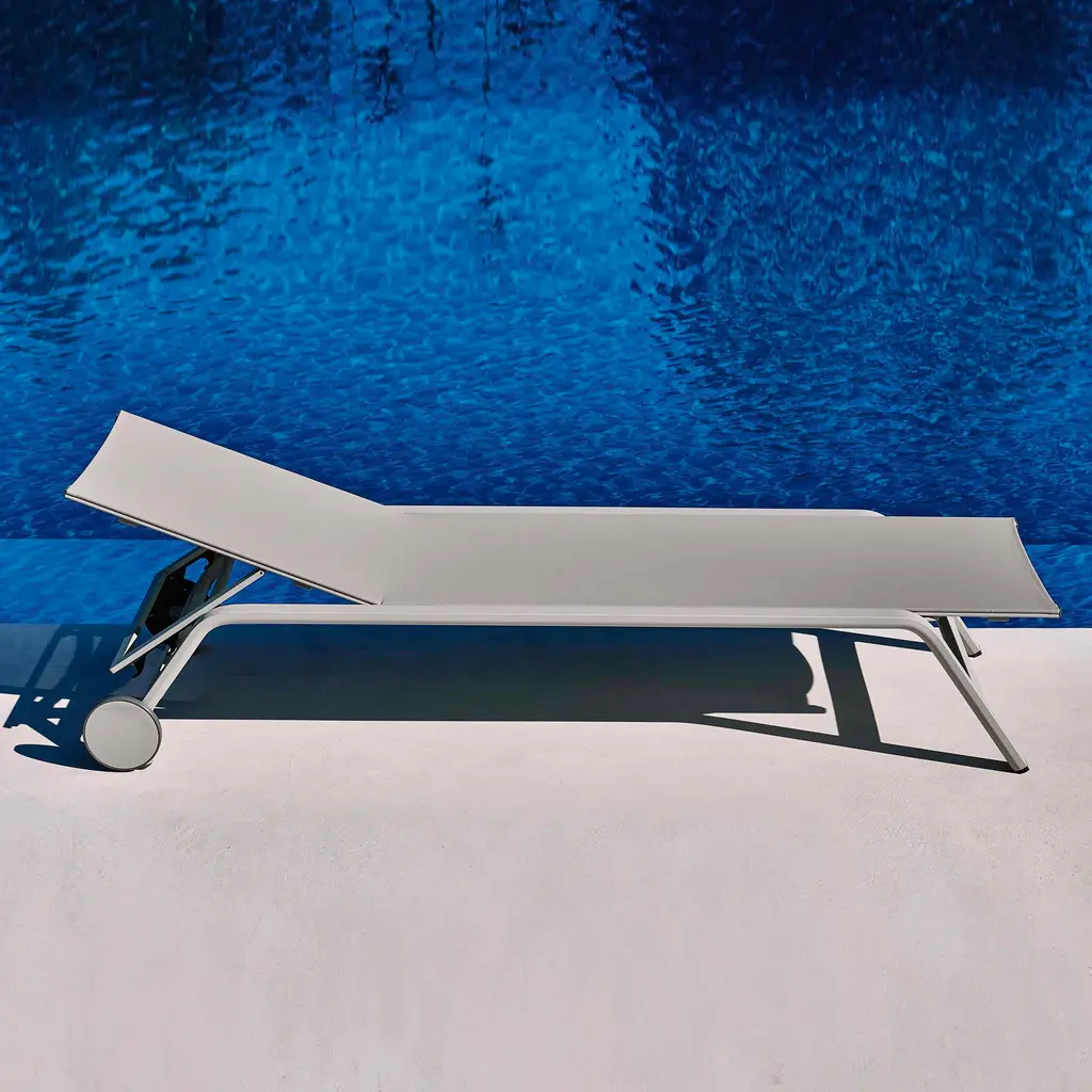 STACK is GANDIABLASCO’s most free-and-easy collection of outdoor furniture. Inspired by aesthetics from the world of sailing, it is refreshingly reminiscent of the retro elegance of the 1960s and 70s, enabling you to enjoy the outdoor life 365 days a year with all the advantages of stackability. The STACK chaise longue with wheels completes the collection. Designed by Borja Garcia, this chaiselongue is made from welded powder coated aluminum profiles, available in anthracite, white, bronze, sand… Special outdoor Batyline® fabric is employed in the seat and back, which is adhered to the aluminum structure. Features