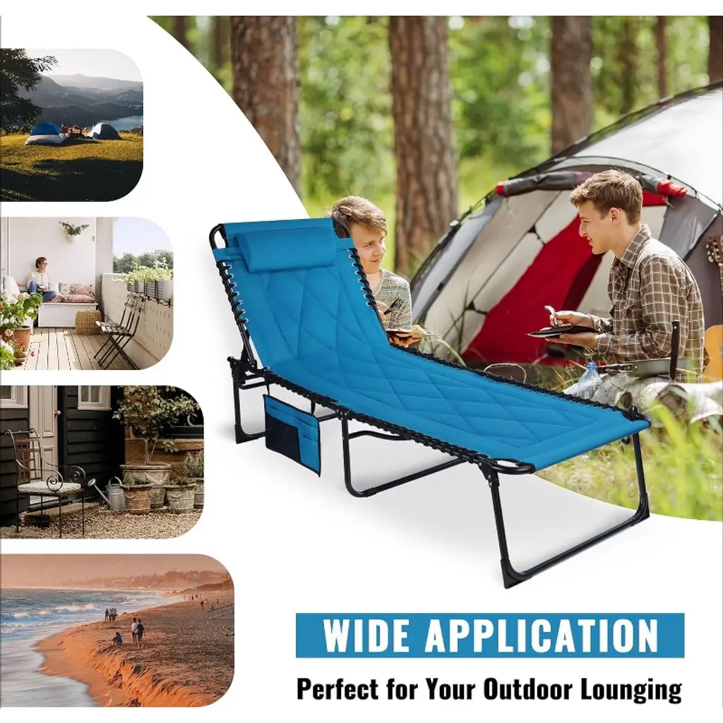 Adjustable Comfort — Customize your lounging experience on this chaise lounge with 4 adjustable backrest positions and 5 different heights (13/18/24/30/34 inch) for the ultimate relaxation Portable and Durable — This is also a camping cot, with an oversized 78-1/2"L x 27"W, and is designed to be easily trifolded and lightweight(19 lbs) for effortless transportation and storage. Its sturdy frame ensures long-lasting durability, allowing you to enjoy it for years to come Superior Cushioning — Our lounge chair features padded cushions that provide exceptional comfort. Unlike other models, our cushions offer firm support and prevent sagging, giving you the perfect balance of coziness and relaxation Robust Construction — Built with a sturdy and heavy-duty frame, which has a 440 lbs weight capacity, this chaise lounge guarantees stability and resilience. Its high-quality materials and impeccable craftsmanship ensure reliability and resilience for all your outdoor adventures Versatile and Gift-worthy — Perfect for singles, couples, and families, our chaise lounge is ideal for backyard retreats, beachside relaxation, or poolside lounging. It's a thoughtful gift that combines comfort, convenience, and style, making it the ultimate companion for leisurely days in the sun