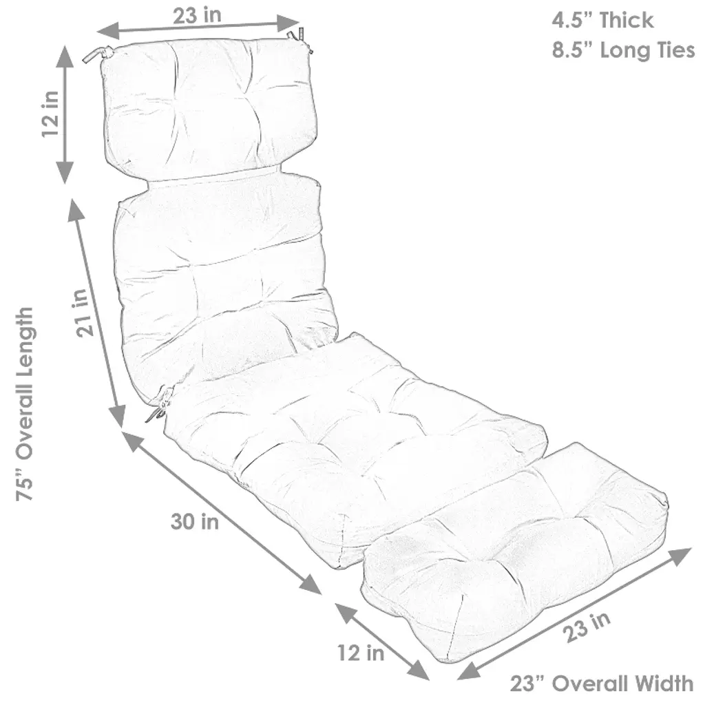 Add comfort and color to patio furniture with this cozy, high back patio cushion. This high back, tufted cushion is designed for use with patio chairs, hanging chairs, or any other seated design, and will add a vibrant pop of color to your deck, front porch, or lawn. This durable, high back dining chair cushion is made from durable fabric for weather resistance and has a plush polyester filling for comfortable seating. This high back garden chair cushion features convenient fabric ties that can be used to secure the cushion to the chair. Plus, it is easy to maintain. Simply spot wash with a mild detergent to get rid of any stains or marks. These versatile pillows are wonderful accessories to make the porch, garden, patio and indoor living areas a comfortable place to unwind and relax. Even use these pillows to add pops of color or vibrancy to any space.• DESIGNED FOR USE WITH LOUNGERS: The patio chaise lounge cushion fits excellently on an outdoor lounge chair. The overall dimensions of the patio lounge pad are 23" W x 75" L x 4.5" thick and weighs 10.4 lbs. The fabric ties measure 8.5" long (4 total).• COMFORTABLE AND DURABLE: This lounge chair cushion features a polyester cover with polyester fiber filling for relaxing comfort. Because of this, the lawn chair pad will maintain its plush shape and bright color over time.• DURABLE FOR OUTDOOR USE: This outdoor lounge chair cushion is designed for use with high back patio chairs. Easily maintain the chaise lawn chair cushion by spot cleaning with soap and water and a soft cloth.• VIBRANT COLOR: This chaise lounge chair pad features a rich vibrant color that will complement and refresh the style of any patio. In order to maintain the fabric's color, bring the patio chaise cushion indoors during inclement weather.• WORRY-FREE PURCHASING: Sunnydaze Decor backs its products with a 1-year manufacturer's warranty.