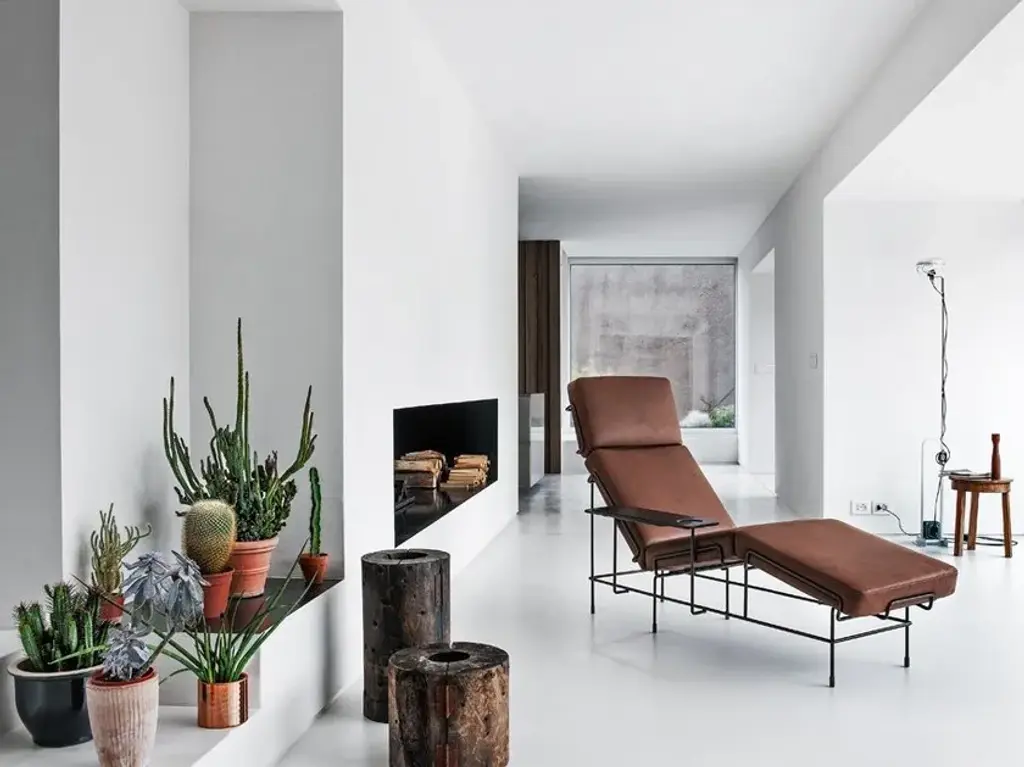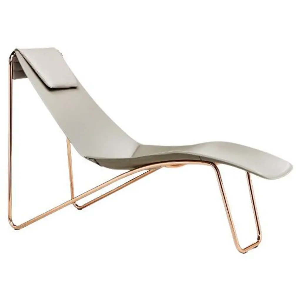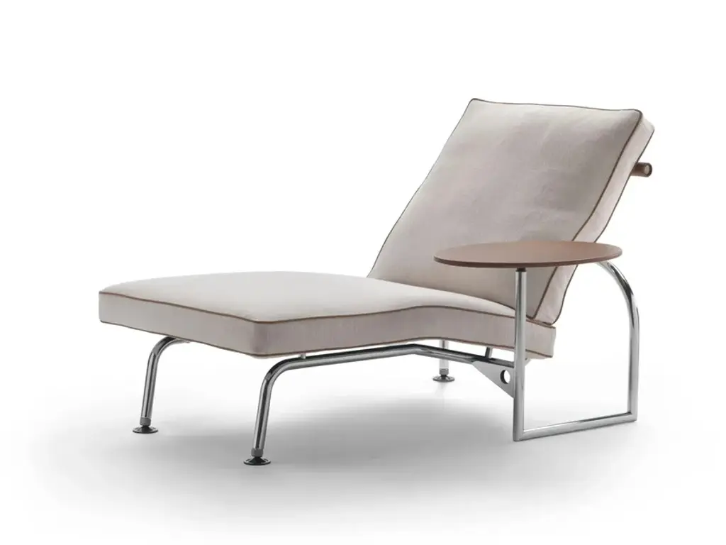 Chaise Longue.Material: frame in steel rod, painted in polyester powder; cushions in expanded polyurethane with removable cover in fabric (Kvadrat “Steelcut Trio”) or in leather. Tablet in acrylic stone.