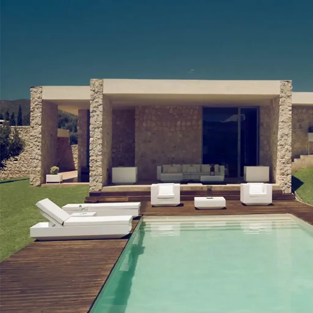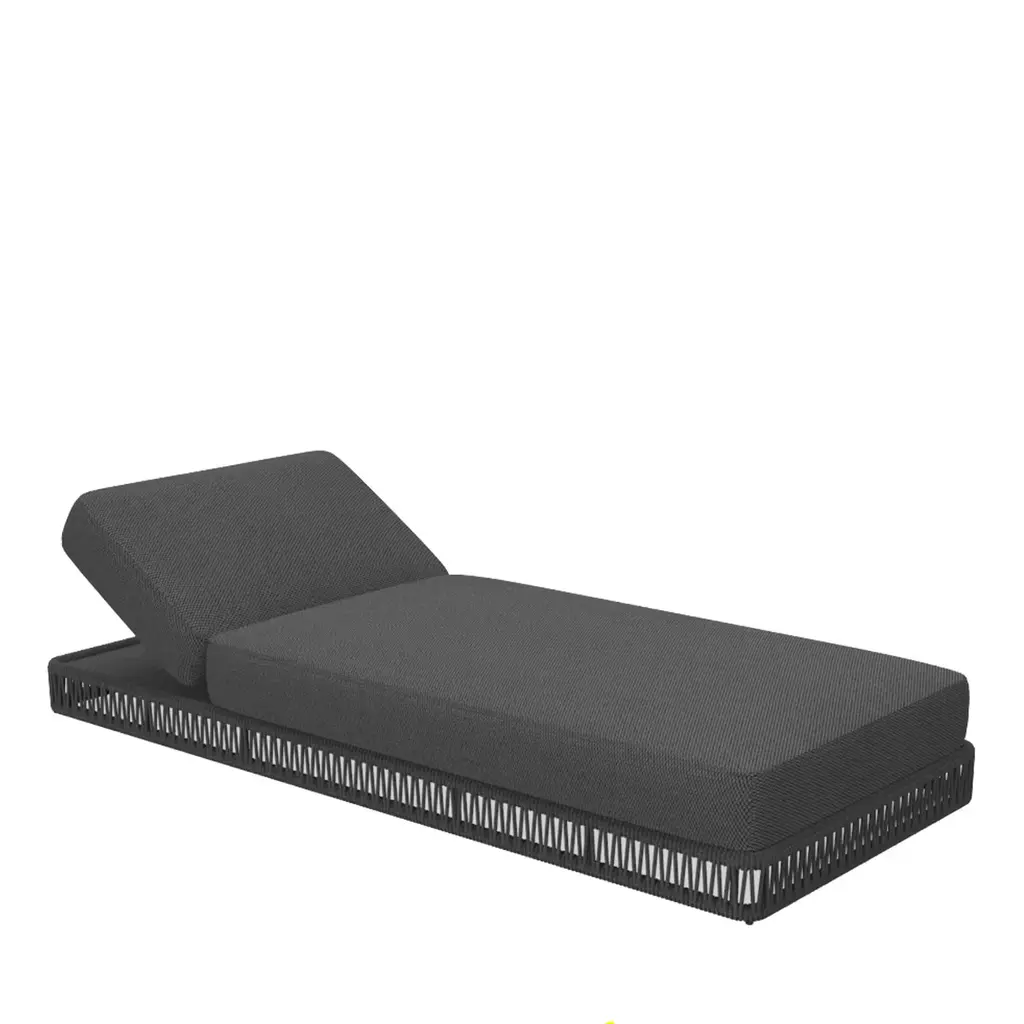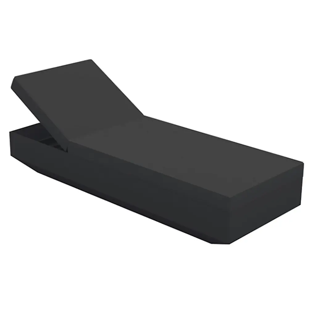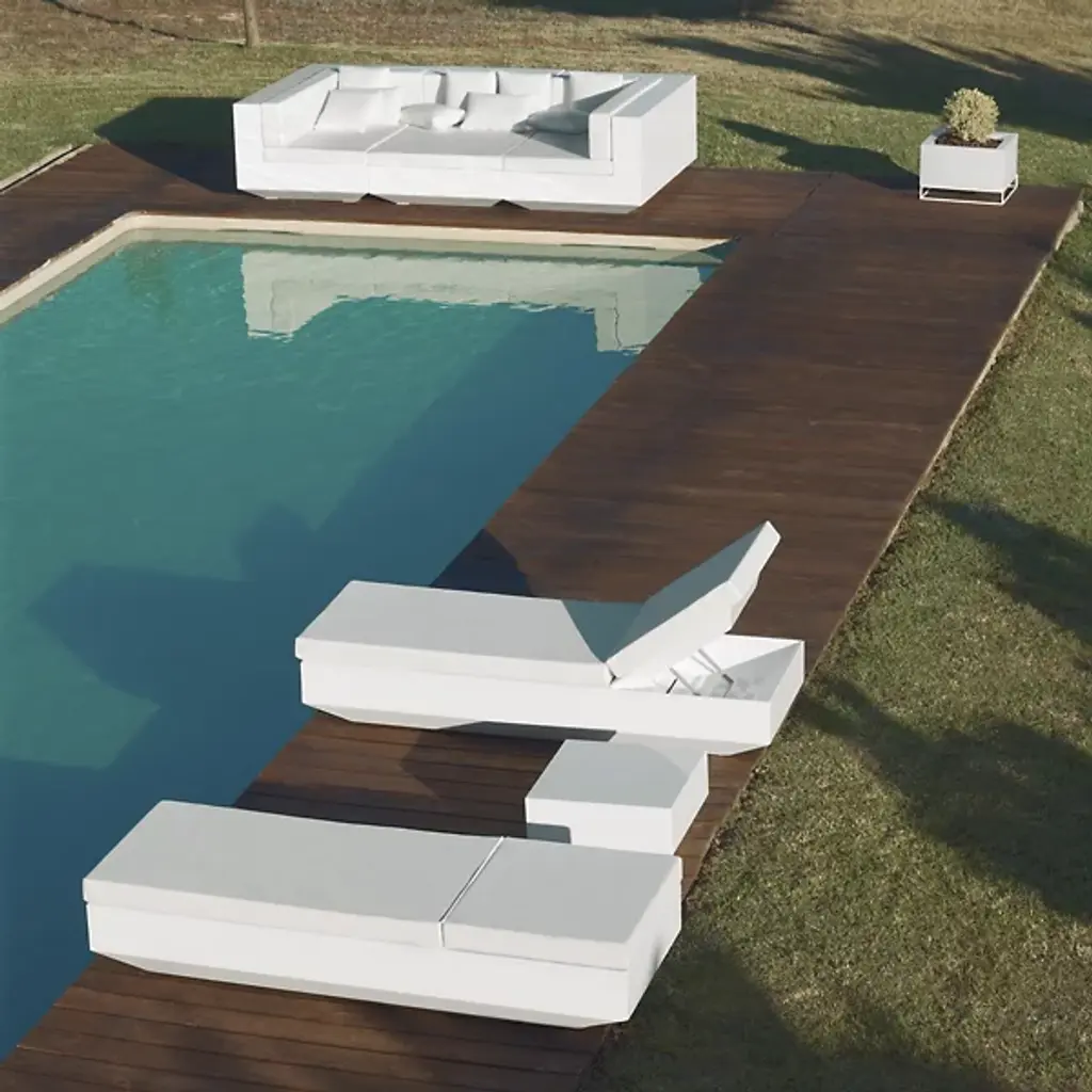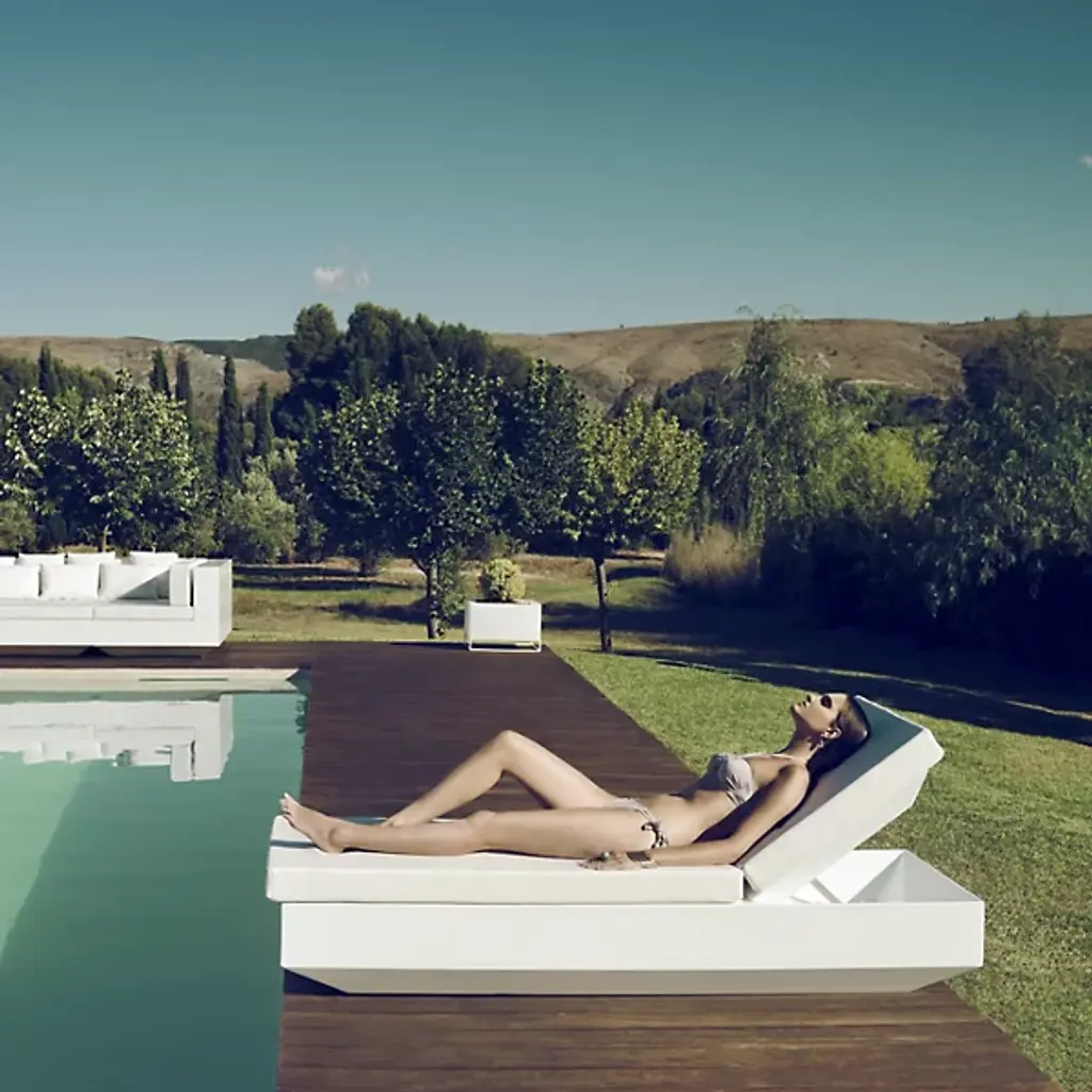 The Vondom Vela Sun Chaise includes a matte white polyethylene base with an inward angle that makes it appear to float. And, while they maintain the overall piece's geometric form, the sharp lines of the polyester vinyl cushion belie its softness. The head of this chaise is height adjustable for reading, chatting or napping as needed.