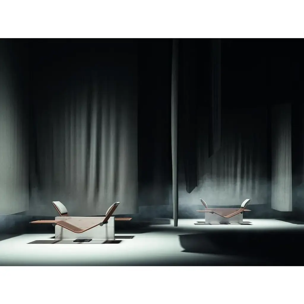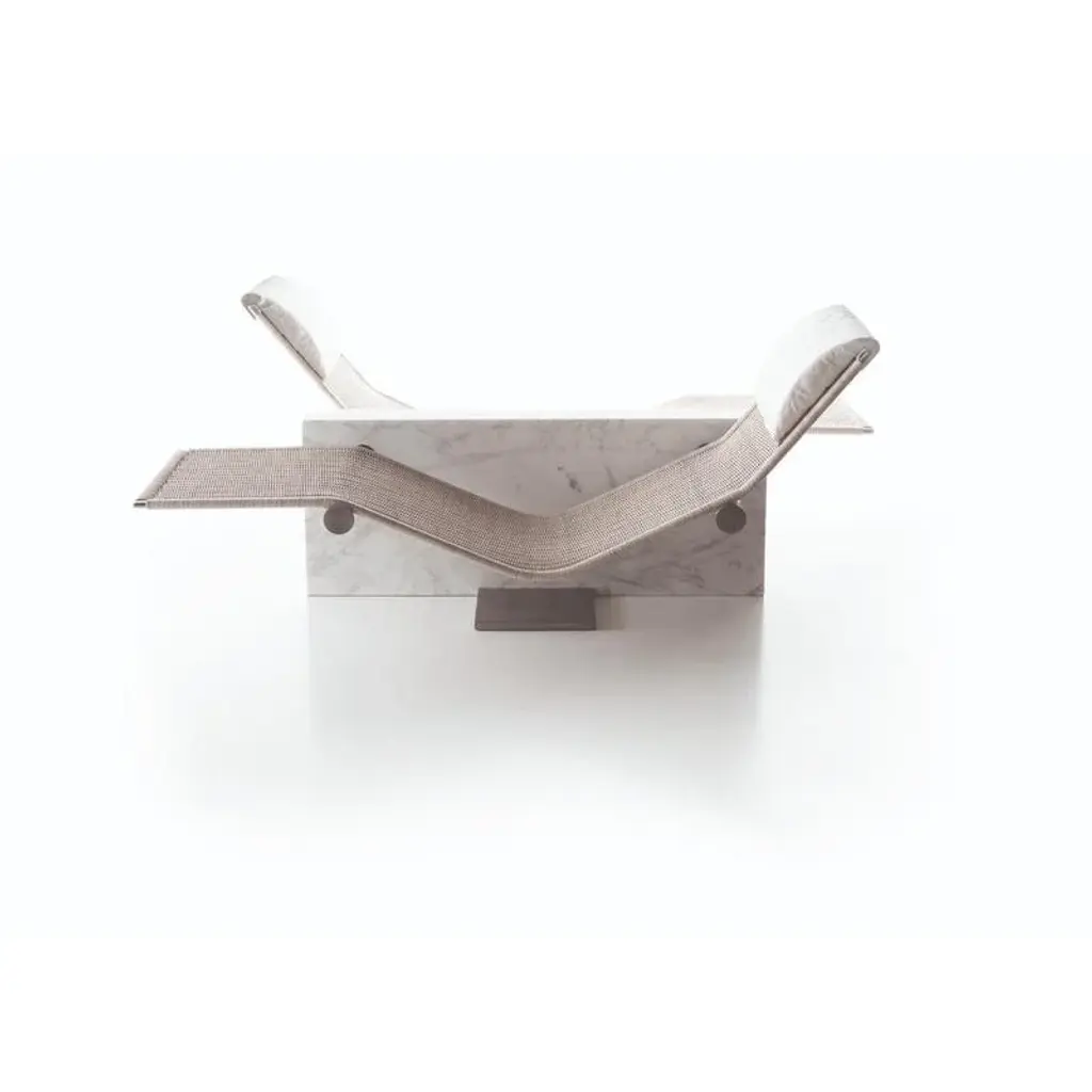 Vis à Vis Double Chaise Longue by Kreoo Design Designed by Enzo Berti Dimensions: D 147 x W 184 x H 78 cm. Materials: Grey marble, natural linen, and wicker.