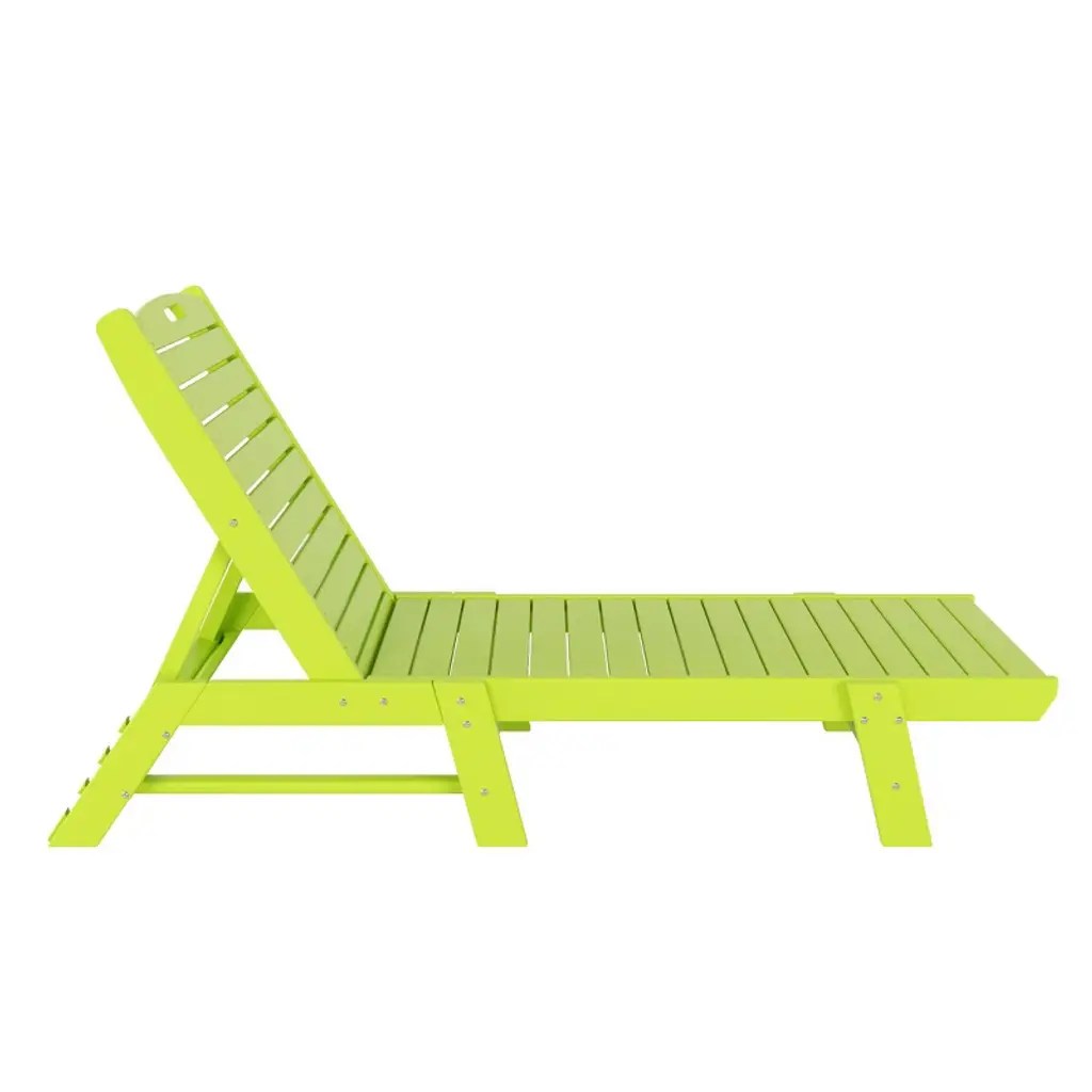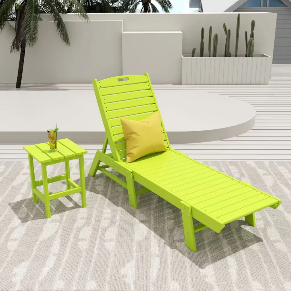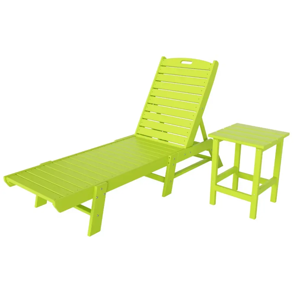 Sit out and relax in the sun with this lovely chaise lounge and side table set that brings a little bit of the beach into your own backyard. The armless design makes it more spacious, and the adjustable back lets you change the position of the back from reclined to lying down with ease. Move the lounge with ease thanks to a convenient handle in the headrest, and it's easy to store thanks to the chair's flat-folding design. The superior all-weather HDPE material will look great all year and is sure to spruce up your backyard.While we strive to accurately represent product colors, please be aware that actual colors may vary slightly due to individual screen settings and lighting conditions. FeaturesSet includes: One (1) 78" Lounge Chair , One (1) Side TableBackrest can be adjusted in 5 different positions for the perfect seatMade with eco-friendly HDPE lumberUV and weather resistant treated materialFade resistant colors to protect the vibrant color all season longFold flat to store away with easeConvenient handle in headrest to move lounge with easeDetails:Product Type: Patio Chaise LoungesWhat's Included: (1) Chaise Lounge; (1) Side TableChaise LoungeDimensions: 22.75" W x 78.25" D x 38" HWeight: 66 lbs.Seat Width: 21"Seat Depth: 46.5"Seat Height: 11.75"Weight Capacity: 450 lbs.Table Top Width: 14"Table Top Depth: 14"Table Top Thickness: 0.5"Side TableDimensions: 14" W x 14" D x 18" HWeight: 9 lbs.Table Top Width: 14"Table Top Depth: 14"Table Top Thickness: 0.5"Weight Capacity: 180 lbs.