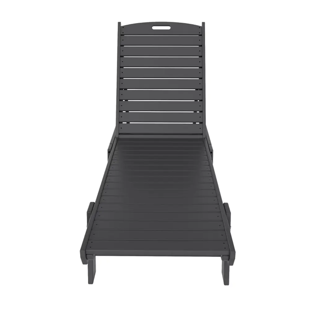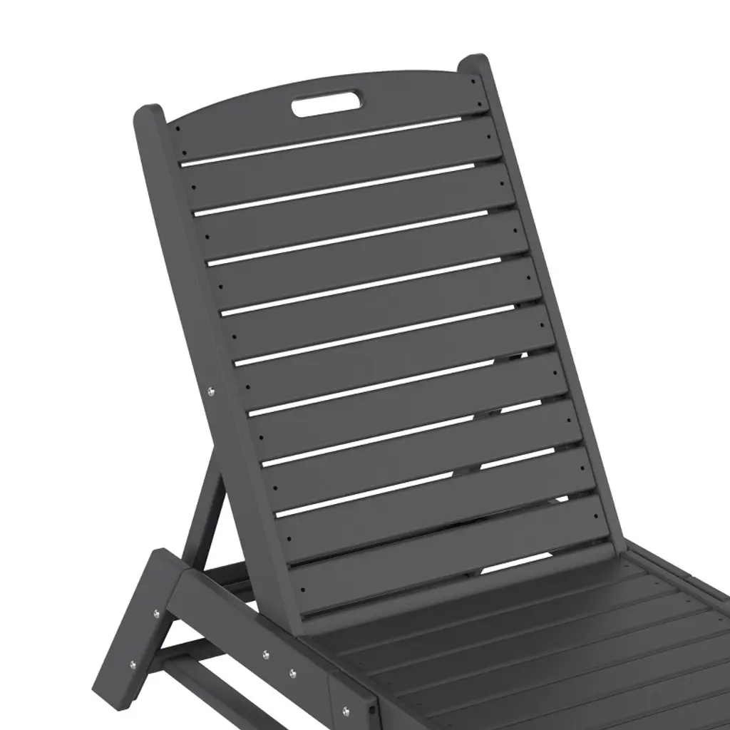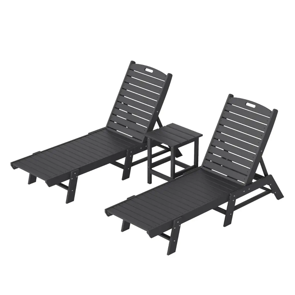 Sit out and relax in the sun with this lovely 3-piece chaise lounge and side table set that brings a little bit of the beach into your own backyard. The armless design makes it more spacious, and the adjustable back lets you change the position of the back from reclined to lying down with ease. Move the lounge with ease thanks to a convenient handle in the headrest, and it's easy to store thanks to the chair's flat-folding design that can stack. The superior all-weather HDPE material will look great all year and is sure to spruce up your backyard.While we strive to accurately represent product colors, please be aware that actual colors may vary slightly due to individual screen settings and lighting conditions. FeaturesSet includes: Two (2) 78" Lounge Chairs and one (1) Side TableBackrest can be adjusted in 5 different positions for the perfect seatMade with eco-friendly HDPE lumberUV and weather resistant treated materialFade resistant colors to protect the vibrant color all season longFold flat to stack and store away with easeEasy and simple to assembleDetails:Product Type: Patio Chaise LoungesWhat's Included: (2) Chaise Lounge; (1) Side TableChaise LoungeDimensions: 22.75" W x 78.25" D x 38" HWeight: 66 lbs.Seat Width: 21"Seat Depth: 46.5"Seat Height: 11.75"Weight Capacity: 450 lbs.Table Top Width: 14"Table Top Depth: 14"Table Top Thickness: 0.5"Side TableDimensions: 14" W x 14" D x 18" HWeight: 9 lbs.Table Top Width: 14"Table Top Depth: 14"Table Top Thickness: 0.5"Weight Capacity: 180 lbs.