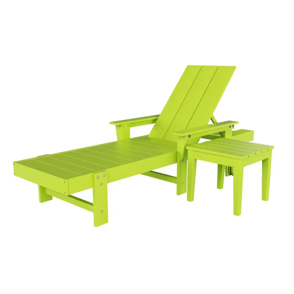 Lounge back and relax this summer with our charming Chaise Lounger with Arms and Wheels and side table. Relax by the pool this season in style with the modern Adirondack backrest that is easy to adjust, so you can sit up, lay your arms on the armrest and read a book, or lay back and catch a tan while having your drink right by your side with our matching 18" side table. Made with a durable, eco-friendly HDPE material that is resistant to the harsh UV rays and has fade-resistant coloring, so you can keep your lounger looking great all season. If you need to move the lounger from storage or just need some more shade, simply pick up the lounger from the front and move to wherever you need with the helpful wheels that make moving it an ease. This lounger is sure to make your summer more relaxing and comfortable.While we strive to accurately represent product colors, please be aware that actual colors may vary slightly due to individual screen settings and lighting conditions. FeaturesSet Includes: One (1) Chaise Loungers with arms and wheels and One (1) 18" Square Side TableEco-friendly HDPE materialAdjustable backrest for multiple lounging positionsSpacious armrest for all-day comfortWheels on back legs to move around or store with easeUV and Fade resistant protect color and material from harsh sunSimple to assembleDetails:Product Type: Patio Chaise LoungesWhat's Included: (1) Chaise Lounge; (1) Side TableChaise LoungeDimensions: 21" W x 75.5" D x 37.75" HWeight: 70 lbs.Seat Width: 21"Seat Depth: 44"Seat Height: 12.25"Weight Capacity: 330 lbs.Table Top Thickness: 0.5"Seat Width: 21"Seat Depth: 44"Side TableDimensions: 17.75" W x 17.75" D x 17" HWeight: 15.75 lbs.Table Top Thickness: 0.5"Weight Capacity: 110 lbs.
