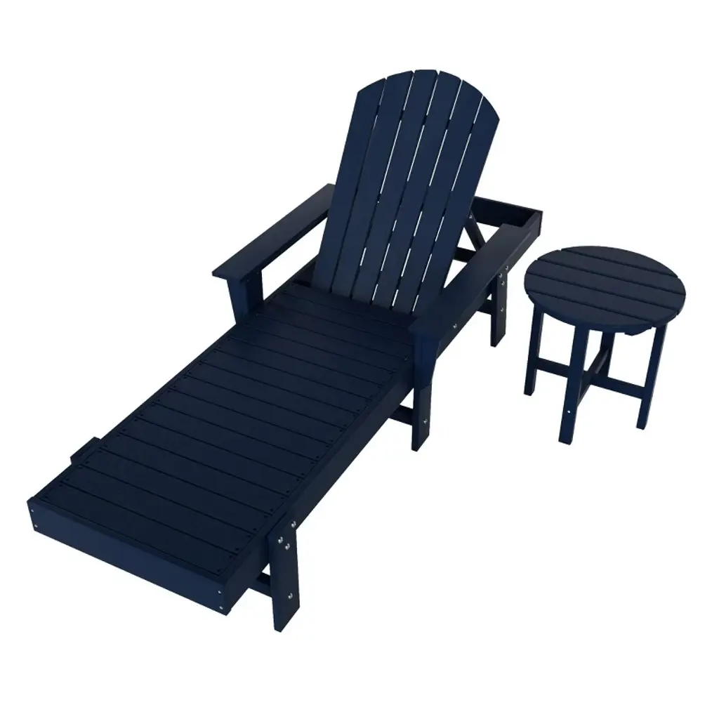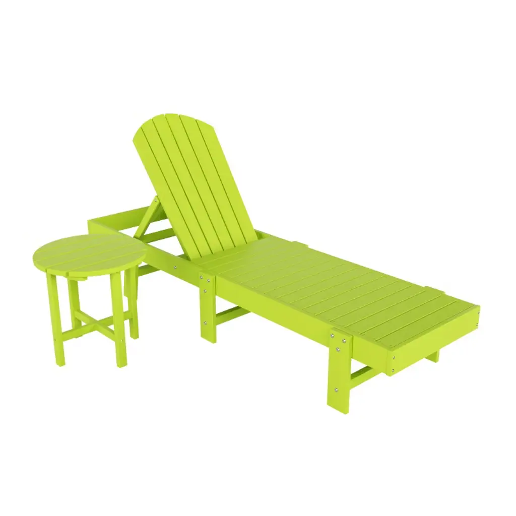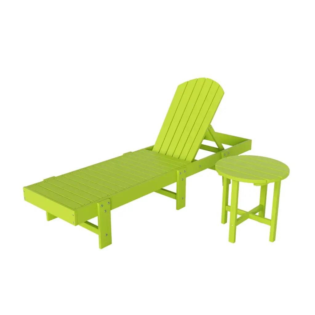 Lay by the poolside and catch a tan or read a book with this attractive reclining chaise lounger. Charming design with the seashell adirondack back that brings a piece of the beach with you and gives your backyard that refreshing feeling. Spacious seat because of the armless design, making it perfect for relaxing. Made with an eco-friendly HDPE material that is durable and perfect for the outdoors, the all-weather and UV-resistant material helps keep the lounger protected each season. Lay back and relax while having your refreshing drink of choice next to you on the matching adirondack side table.While we strive to accurately represent product colors, please be aware that actual colors may vary slightly due to individual screen settings and lighting conditions. FeaturesSet includes: One (1) Adirondack chaise lounger and One (1) Side tableMade with Eco-friendly HDPE materialAdjustable backrest with multiple lounging positions including flatWeather and UV-resistant material to protect from the outdoor weatherFade-resistant colors help preserve the vibrant colorsDurable material prevents cracks, chips, and peelingSimple to assembleDetails:Product Type: Patio Chaise LoungesWhat's Included: (1) Chaise Lounge; (1) Side TableChaise LoungeDimensions: 21" W x 75.5" D x 37.75" HWeight: 57.5 lbs.Seat Width: 21"Seat Depth: 44"Seat Height: 12.25"Weight Capacity: 330 lbs.Seat Width: 21"Seat Depth: 44"Side TableDimensions: 17.5" W x 17.5" D x 18" HWeight: 10.5 lbs.Weight Capacity: 180 lbs.
