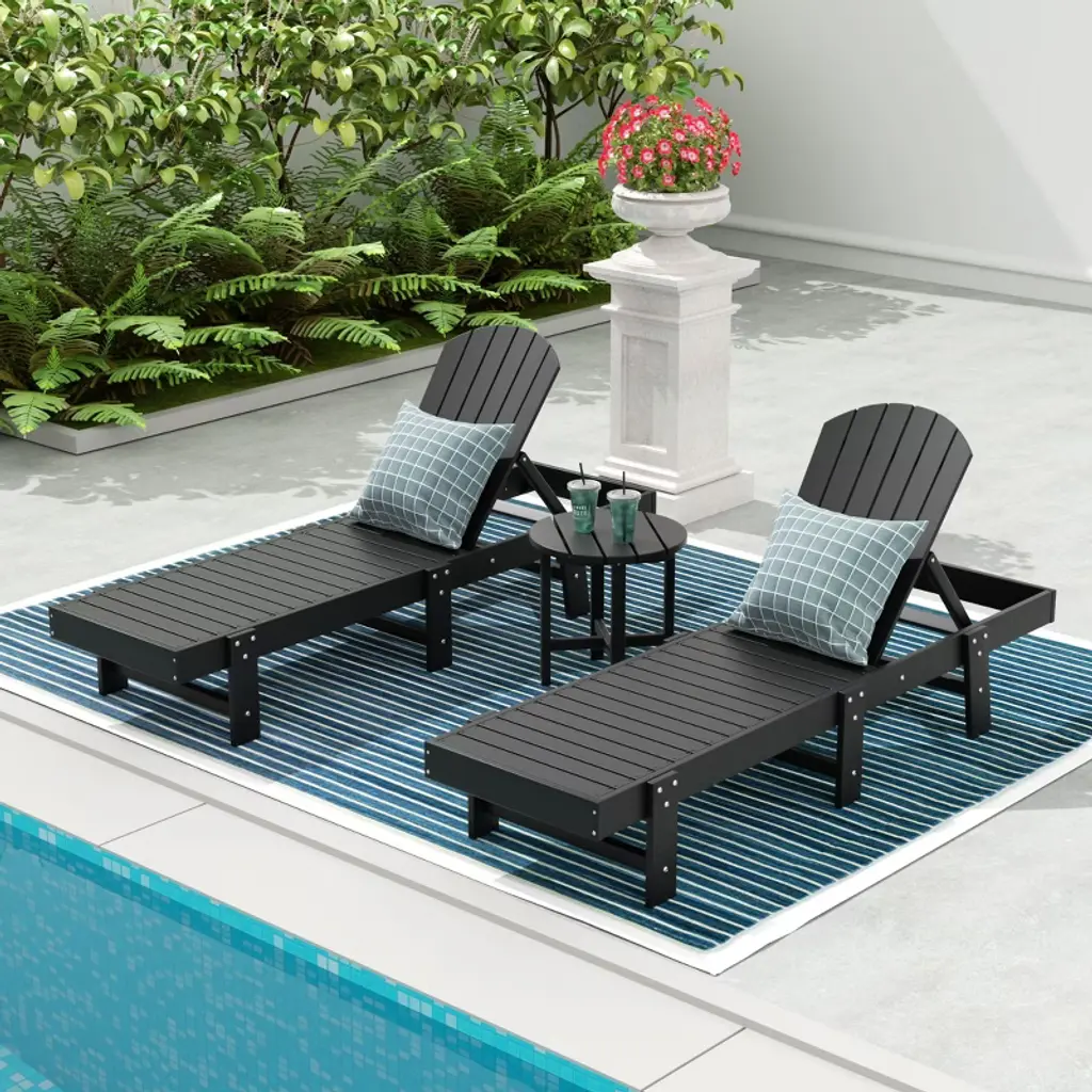 Lay by the poolside and relax with a loved one or friend this season in this attractive 3-piece reclining chaise lounger and side table set. Charming design with the classic adirondack back that brings a piece of the beach with you and gives your backyard that refreshing feeling . Spacious seating thanks to the armless design, making it perfect for relaxing. Made with an eco-friendly HDPE material that is durable and perfect for the outdoors, the all-weather and UV-resistant material helps keep the lounger protected each season. Lay back and relax while having your refreshing drink of choice next to you on the matching adirondack side table.While we strive to accurately represent product colors, please be aware that actual colors may vary slightly due to individual screen settings and lighting conditions. FeaturesSet of Two (2) Adirondack chaise lounger and One (1) Side tableMade with Eco-friendly HDPE materialAdjustable backrest with multiple lounging positions including flatWeather and UV-resistant material to protect from the outdoor weatherFade-resistant colors help preserve the vibrant colorsSimple to assembleDurable material prevents cracks, chips, and peelingDetails:Product Type: Patio Chaise LoungesWhat's Included: (2) Chaise Lounge; (1) Side TableChaise LoungeDimensions: 21" W x 75.5" D x 37.75" HWeight: 57.5 lbs.Seat Width: 21"Seat Depth: 44"Seat Height: 12.25"Weight Capacity: 330 lbs.Seat Width: 21"Seat Depth: 44"Side TableDimensions: 17.5" W x 17.5" D x 18" HWeight: 10.5 lbs.Weight Capacity: 180 lbs.