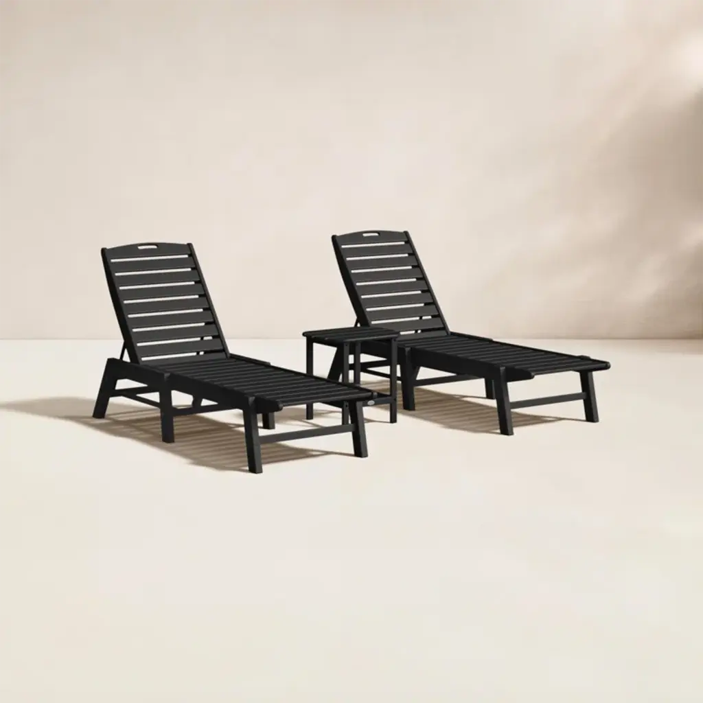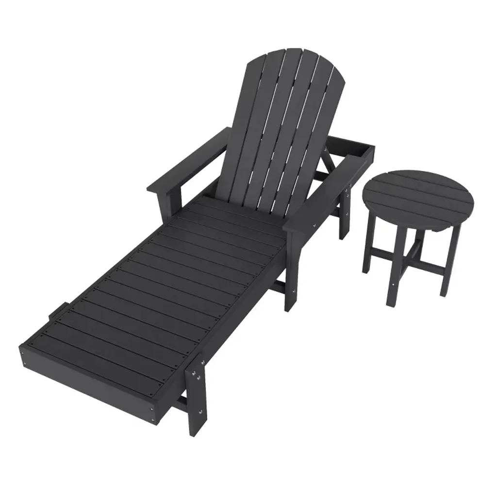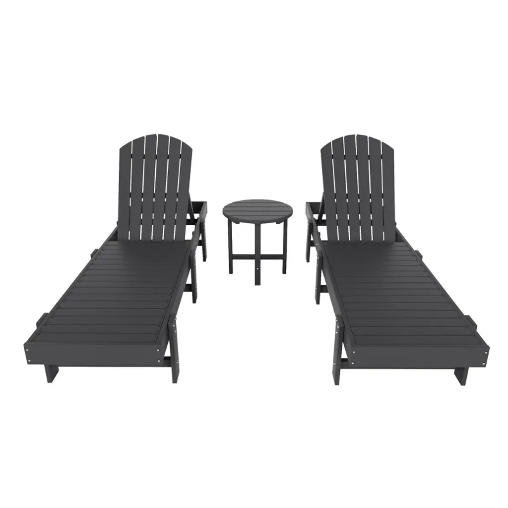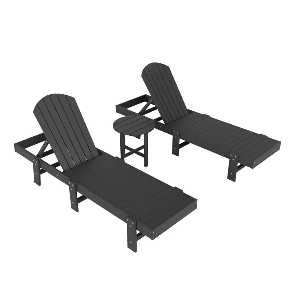 Lay by the poolside and relax with a loved one or friend this season in this attractive 3-piece reclining chaise lounger and side table set. Charming design with the classic adirondack back that brings a piece of the beach with you and gives your backyard that refreshing feeling . Spacious seating thanks to the armless design, making it perfect for relaxing. Made with an eco-friendly HDPE material that is durable and perfect for the outdoors, the all-weather and UV-resistant material helps keep the lounger protected each season. Lay back and relax while having your refreshing drink of choice next to you on the matching adirondack side table.While we strive to accurately represent product colors, please be aware that actual colors may vary slightly due to individual screen settings and lighting conditions. FeaturesSet of Two (2) Adirondack chaise lounger and One (1) Side tableMade with Eco-friendly HDPE materialAdjustable backrest with multiple lounging positions including flatWeather and UV-resistant material to protect from the outdoor weatherFade-resistant colors help preserve the vibrant colorsSimple to assembleDurable material prevents cracks, chips, and peelingDetails:Product Type: Patio Chaise LoungesWhat's Included: (2) Chaise Lounge; (1) Side TableChaise LoungeDimensions: 21" W x 75.5" D x 37.75" HWeight: 57.5 lbs.Seat Width: 21"Seat Depth: 44"Seat Height: 12.25"Weight Capacity: 330 lbs.Seat Width: 21"Seat Depth: 44"Side TableDimensions: 17.5" W x 17.5" D x 18" HWeight: 10.5 lbs.Weight Capacity: 180 lbs.