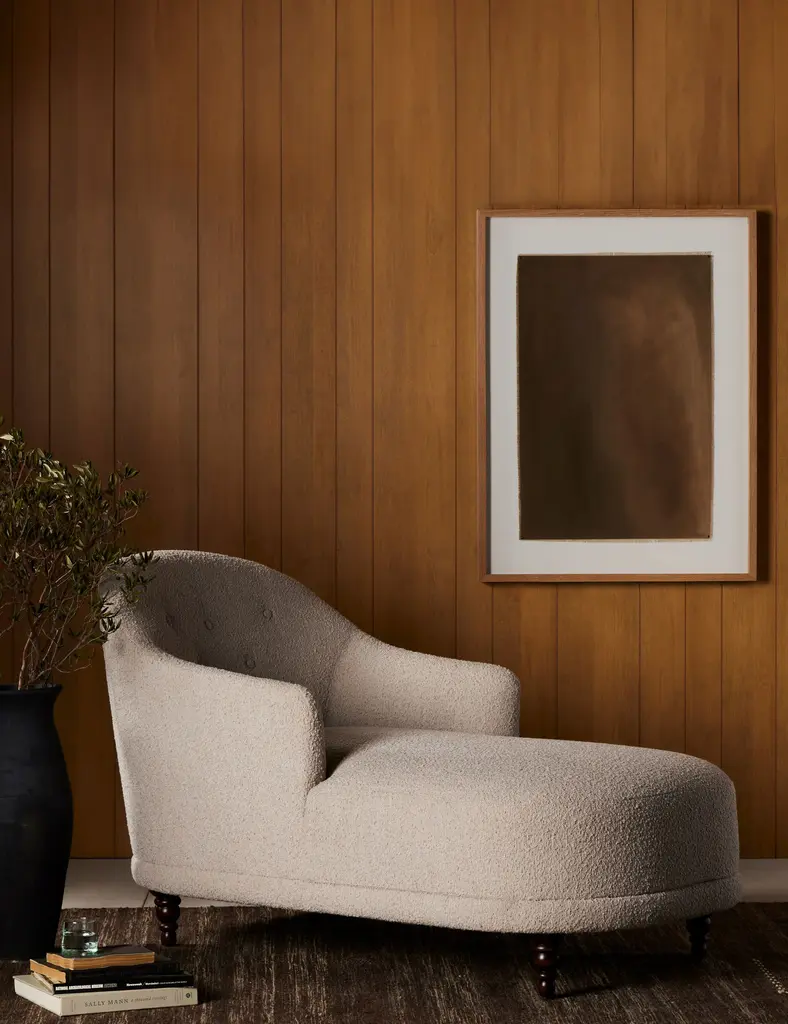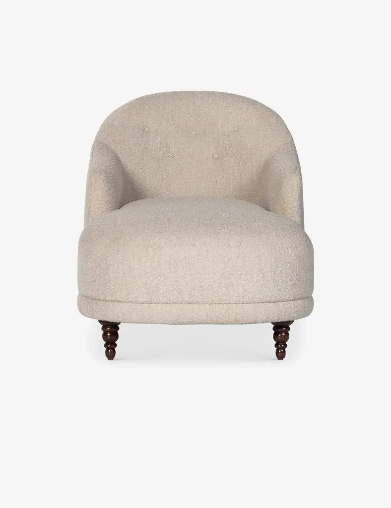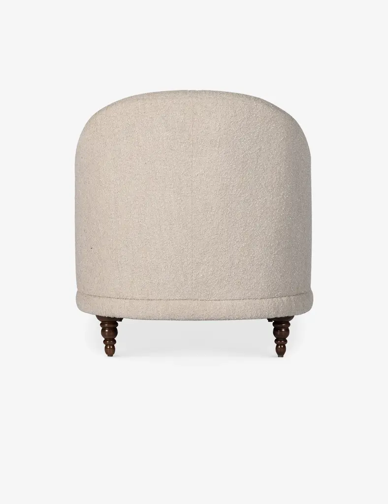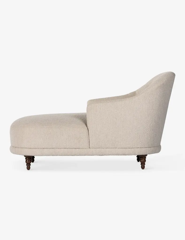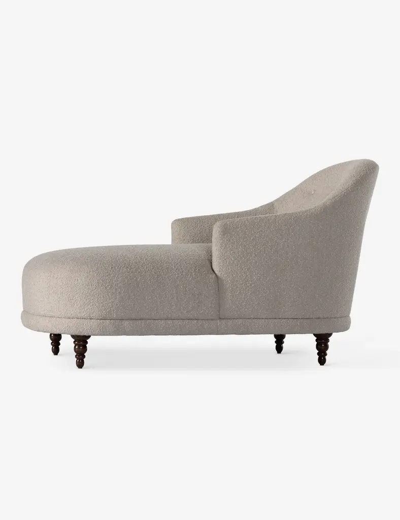 Timeless in its elegance, this traditional-meets-modern chaise is the perfect accent feature for a bedroom or lounge. Sculptural lines soften the classic silhouette, inviting repose. Boucle upholstery and turned legs complete the look for a seamless transitional style.
