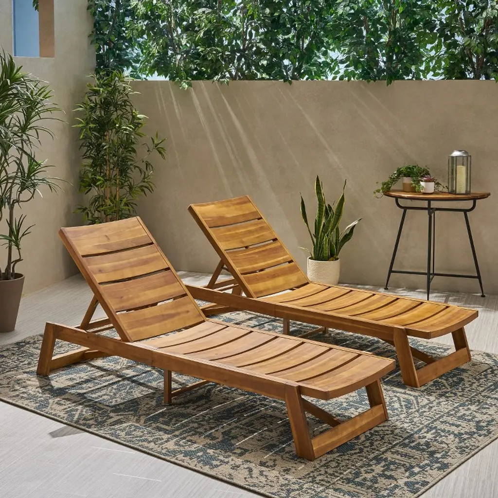 Wooakway Modern Rustic 2Pcs 79"l Slatted Acacia Wood Patio Chaise Lounge With Adjustable Reclining Backrest For Poolside Terrace Deck Balcony Lawn