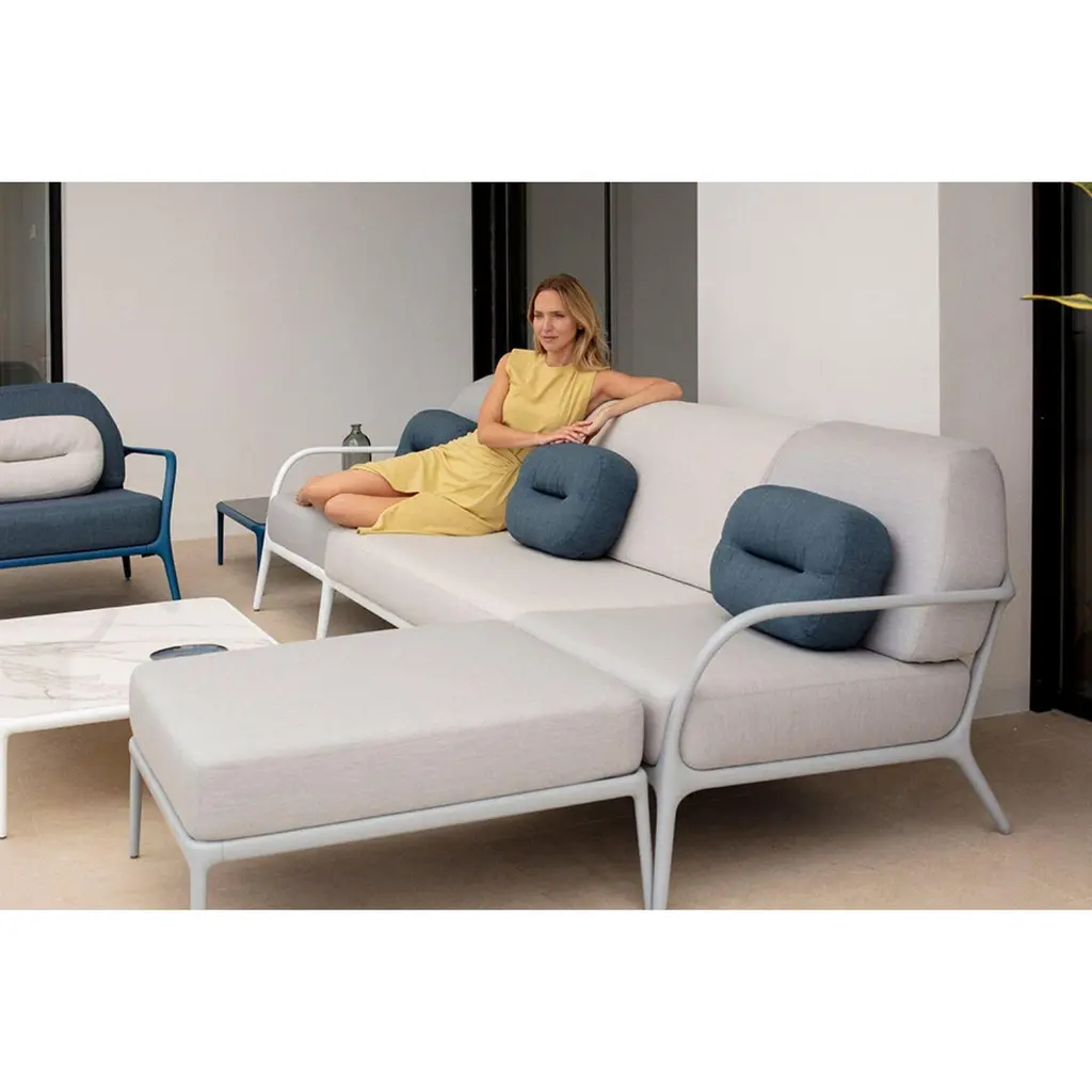 Xaloc navy chaise longue by MoweeDimensions: D 82 x W 90 x H 43 cmMaterial: Aluminium, TextileWeight: 13 kgAlso available in different colours and finishes. Xaloc synthesizes the lines of interior furniture to extrapolate to the exterior, creating an elegant and versatile collection that can coexist in both contexts. The textile of its elements also want to represent this concern to provide the exterior with the warmth of the interior furniture. The name Xaloc comes from the wind with the same name. A strong wind typical of the Mediterranean area. A wind capable of eroding the environment it meets. The shapes of the collection represent this wind-induced erosion that generates natural and harmonic forms.Möwee is part of the work, effort and commitment of Gaviota, a leading company in the outdoor sector. It was set up as an independent venture to broaden horizons in the outdoor furniture world, with its own distinctive character and way of doing things. Freshness, simplicity, quality and design are at the heart of its DNA.