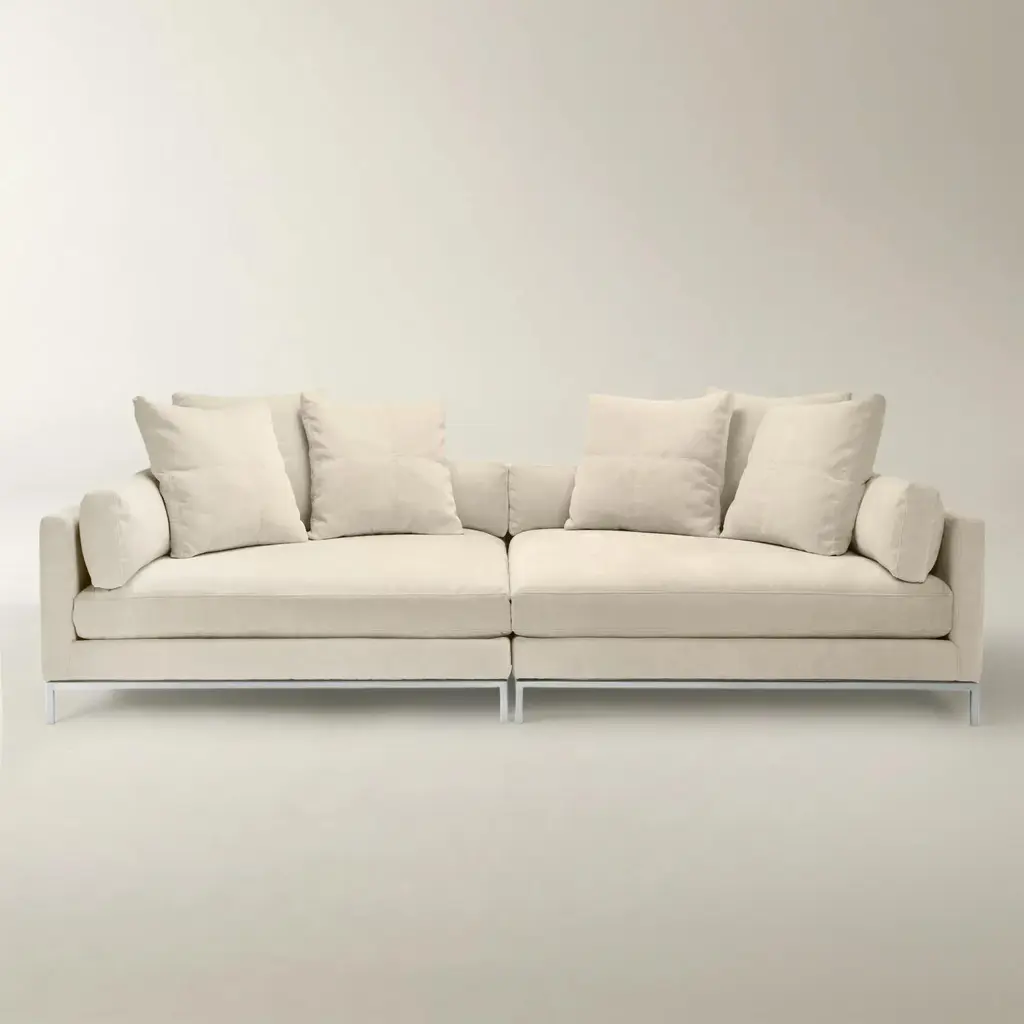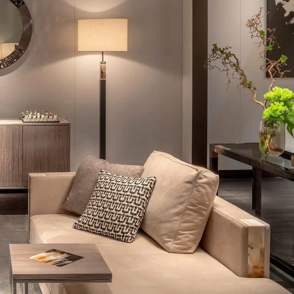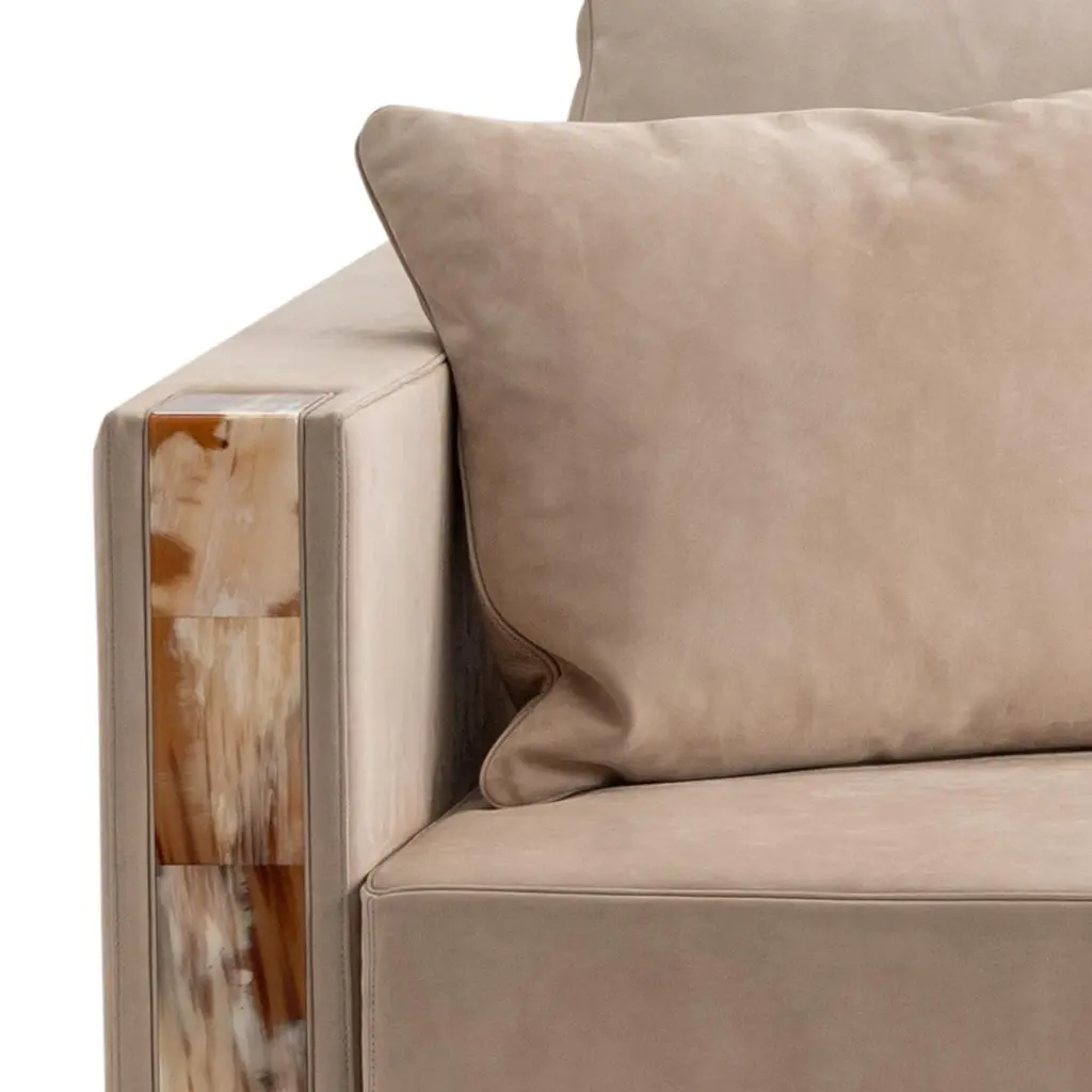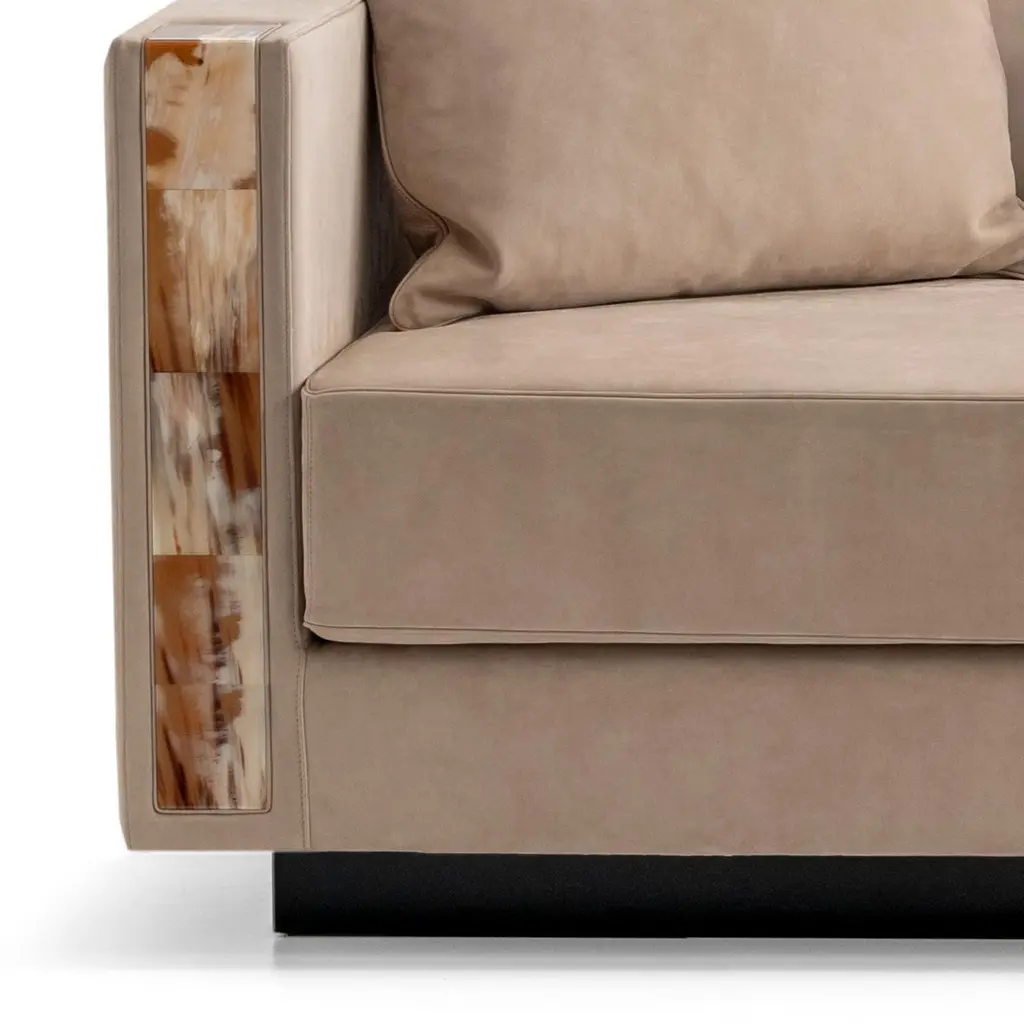 Pairing optimum sitting comfort with high-style, the Zeus chaise lounge is perfect for bedrooms, hallways and lounges. The design is proposed in a soft Carmen nabuk leather (cat. Luxe) in Sabbia colour, a nuance that recalls the beach sand and ensures a warm, natural feeling. Also available in customizable upholstery, the chaise lounge is distinguished by handcrafted L-shaped armrests in Corno Italiano with gloss finish. The padding in multi-density expanded polyurethane foam, goose down and memory foam offers a refined relaxation. Resting on a sturdy base in wood with lacquered black gloss finish, Zeus chaise lounge is available both in right-hand or left-hand orientation and can be suited to any space and design need.Notes:- Colors and shades of Corno Italiano processed by our Company are unique and due to the natural origin of raw material. For this reason Corno Italiano tones that can be seen in pictures are indicative and cannot be reproduced in finished products.- Price is referred to chaise lounge and decorative cushions upholstered in the same material and color.- When an element with armrest is ordered, specify in all cases whether left or right, always when facing the element.
