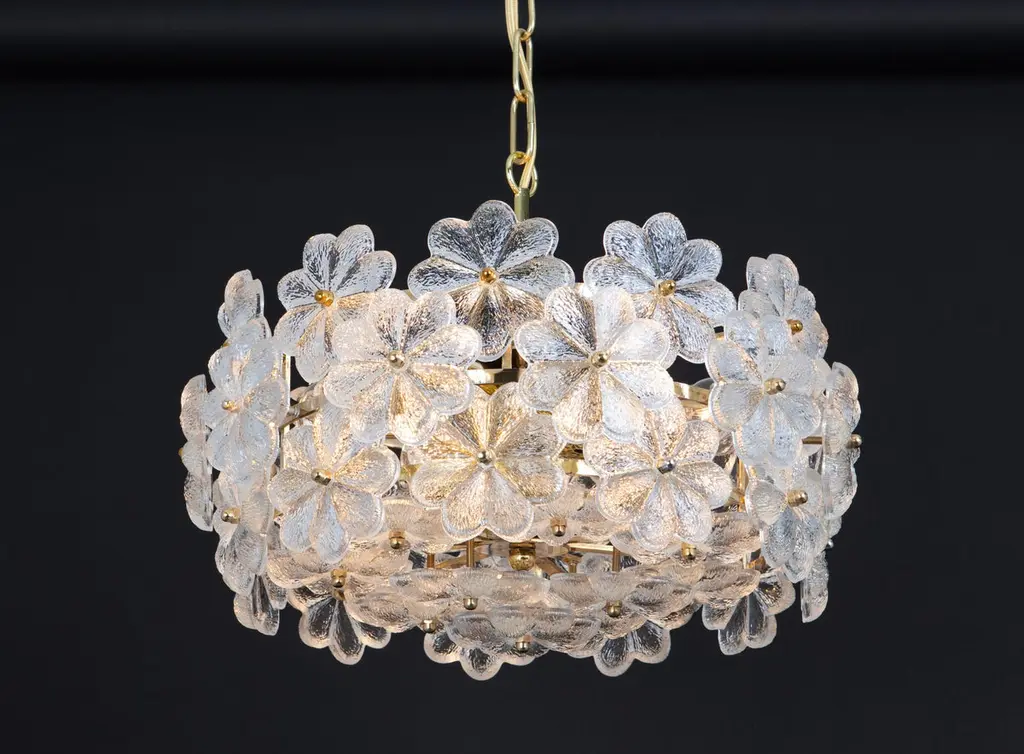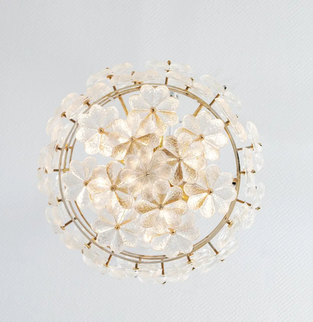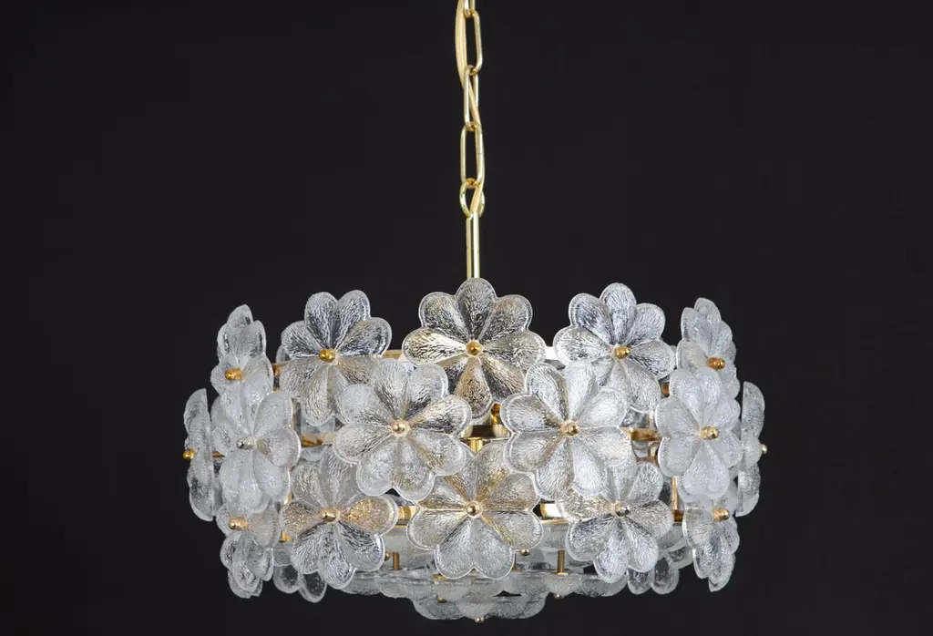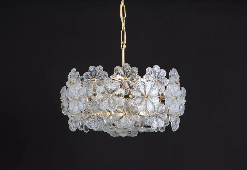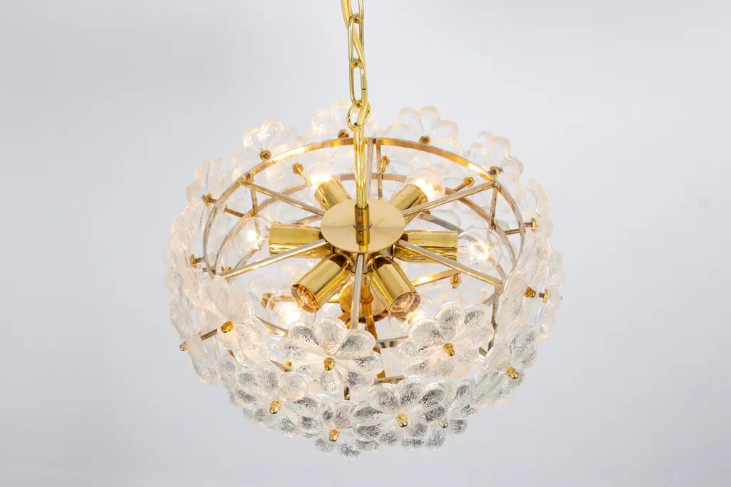 Petite stunning chandelier with many Murano flower crystal glass over a brass frame, made by Ernst Palme in Germany, 1970s.High quality and in very good condition. Cleaned, well-wired and ready to use. The chandelier requires 6 x E14 small bulbs with 40W max each.Light bulbs are not included. It is possible to install this fixture in all countries (US, UK, Europe, Asia, Australia,..)The height can be adjusted for a higher or lower ceiling.The listed price is for one chandelier.Two Chandeliers are available.