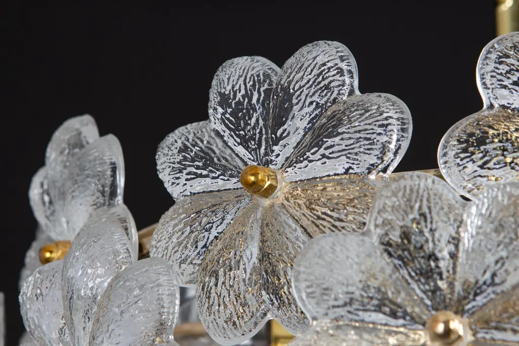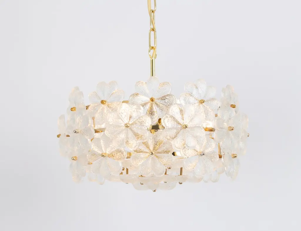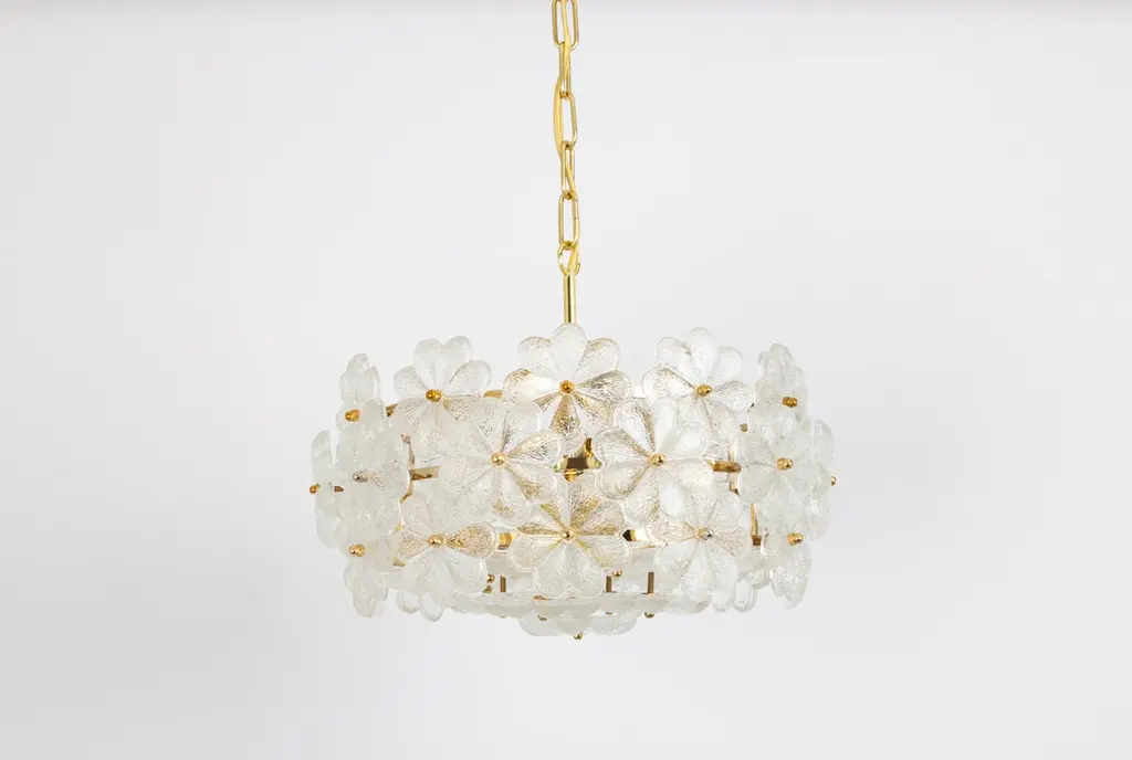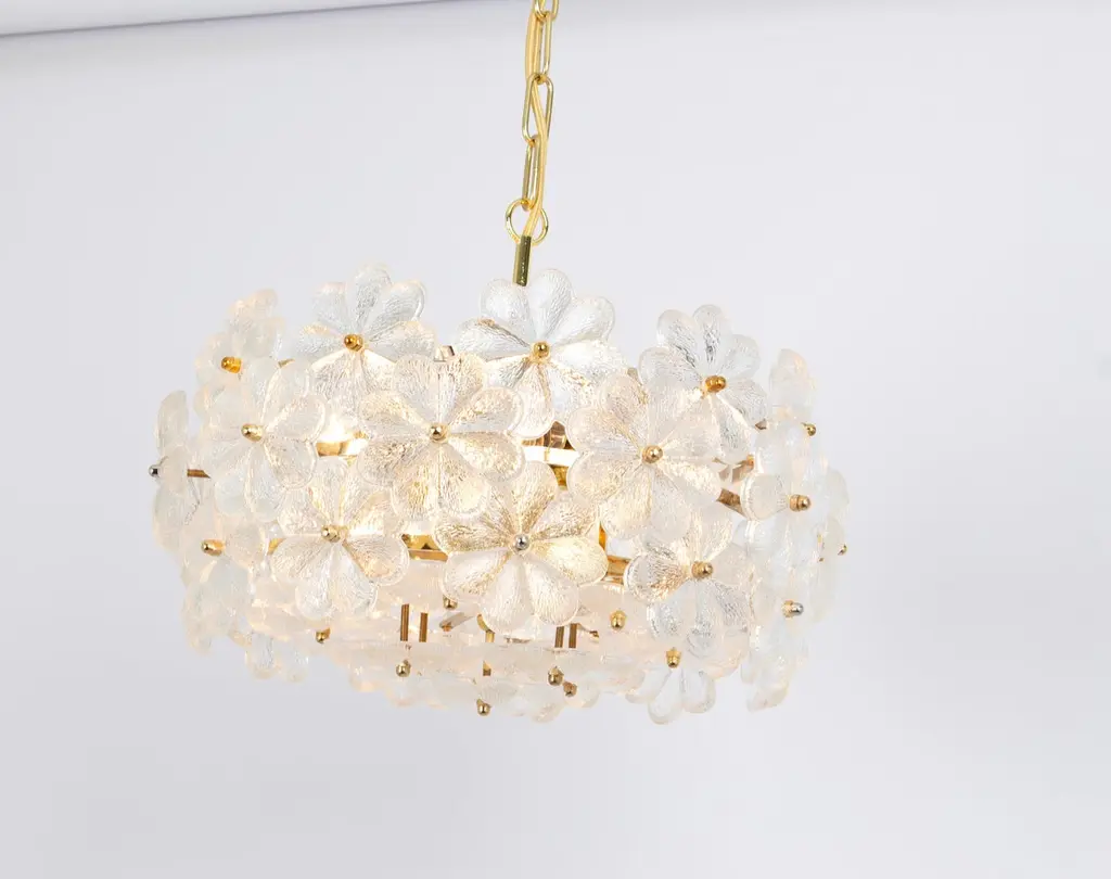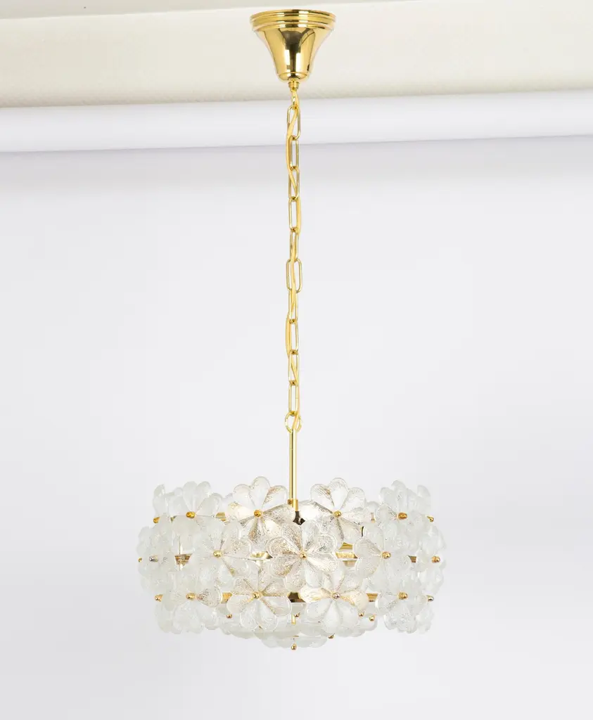 Petite stunning chandelier with many Murano flower crystal glass over a brass frame, made by Ernst Palme in Germany, 1970s.High quality and in very good condition. Cleaned, well-wired and ready to use. The chandelier requires 6 x E14 small bulbs with 40W max each.Light bulbs are not included. It is possible to install this fixture in all countries (US, UK, Europe, Asia, Australia,..)The height can be adjusted for a higher or lower ceiling.The listed price is for one chandelier.Two Chandeliers are available.