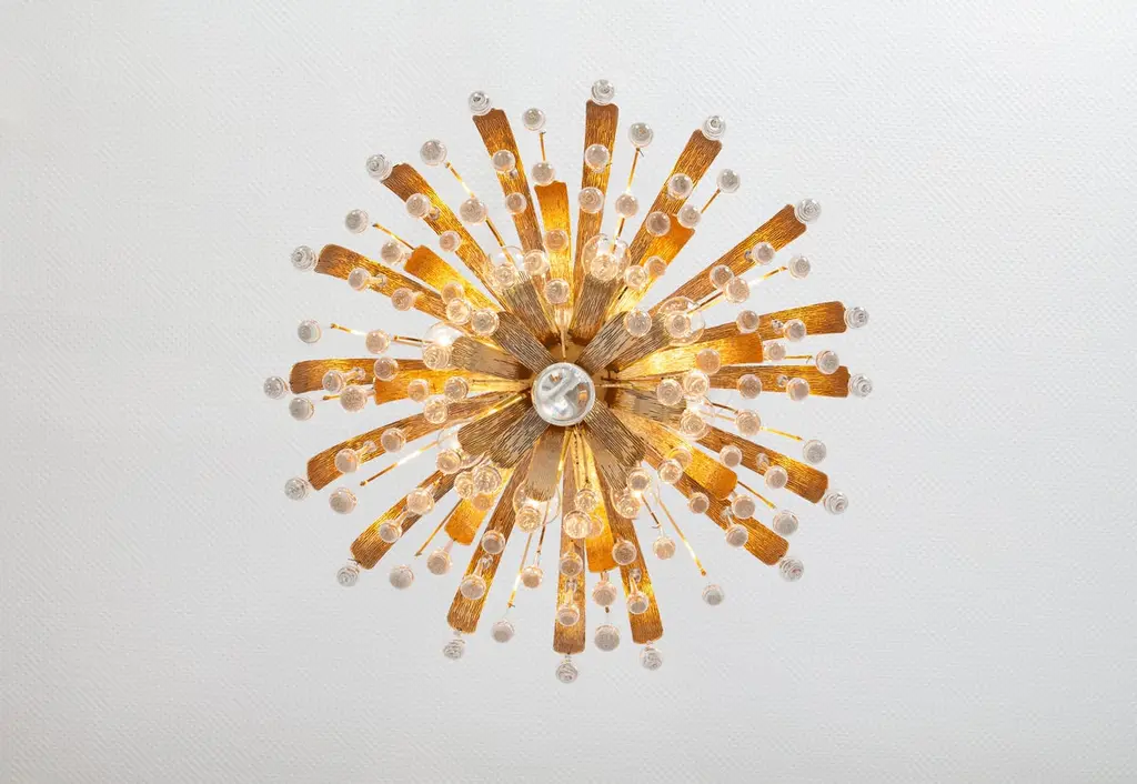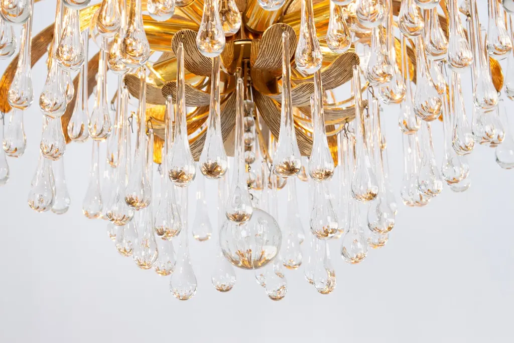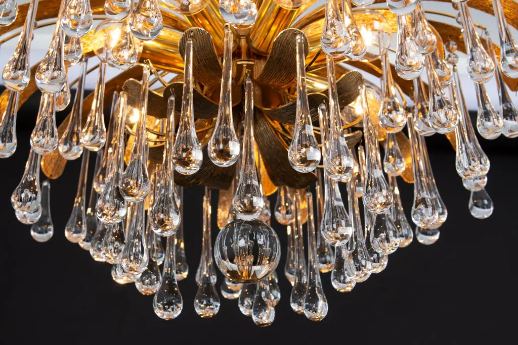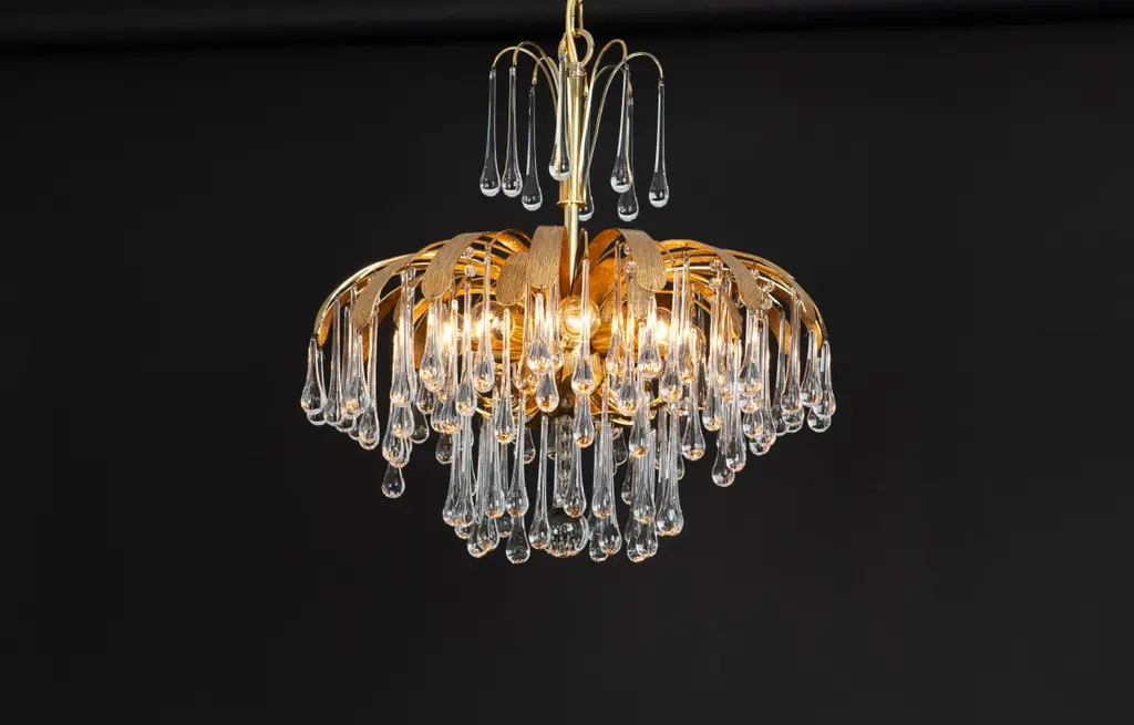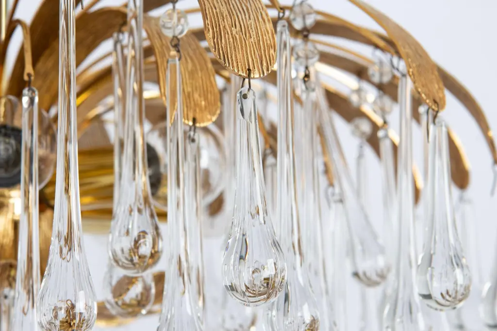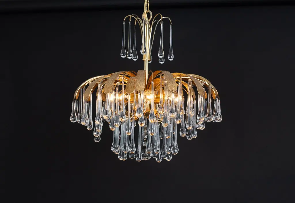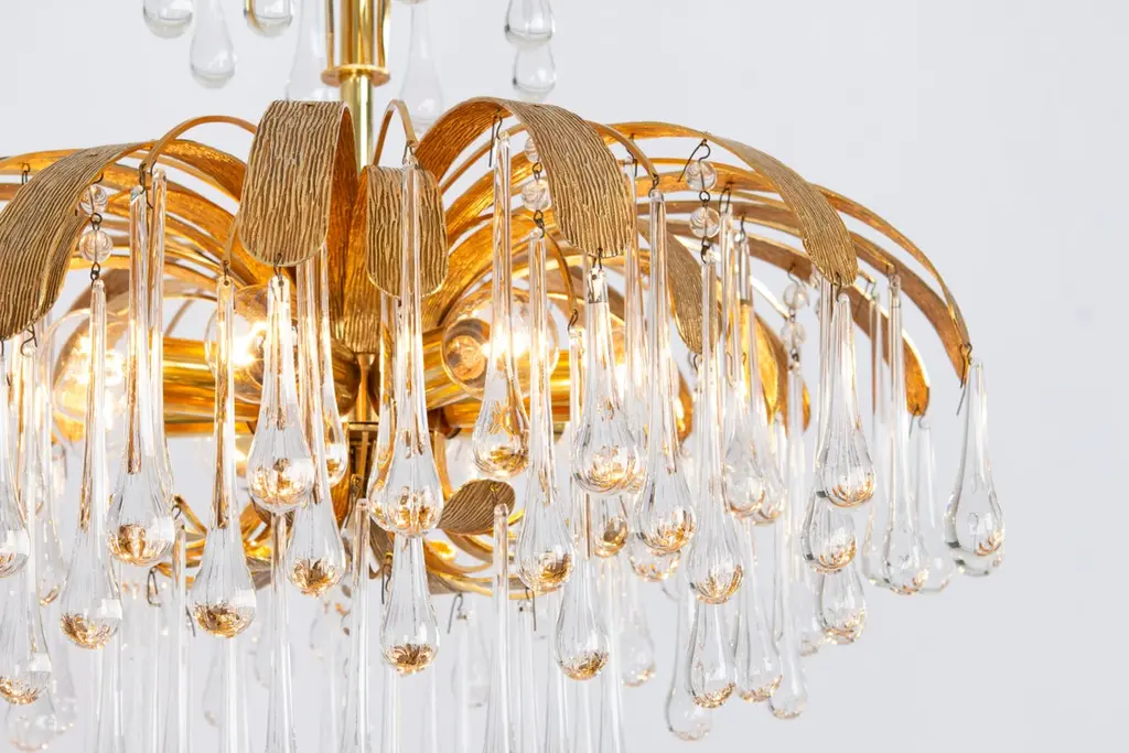 Delicate floral chandelier with tear drop glasses and gilded brass parts made by Palwa, Sciolari Design Germany, 1970s. The height can be adjusted for higher or lower ceiling.Sockets: 8 small bulbs (E-14) max each 40W.Light bulbs are not included. It is possible to install this fixture in all countries (US, UK, Europe, Asia, Australia.)Very good condition.The listed price is for one chandelier.Three chandeliers are available.