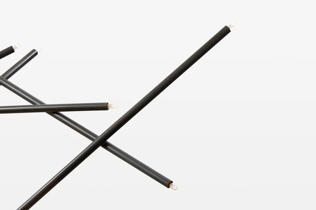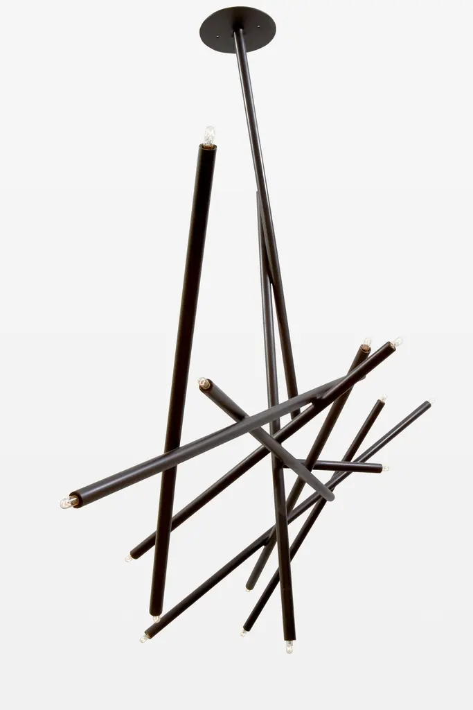 10 Stick ChandelierEach piece is handmade in the Studio of Cam Crockford. These sculptural light fixtures are all bonded by precise welds, sanded and brushed to create a smooth transition that is nearly inapparent. The finishes are live unless otherwise specified. This means the brass will naturally patina over time based on the environment it lives in. The Cam Crockford Studio is UL listed and every light fixture created will come with a Certified UL stamp. Custom commissions are available and welcomed. Available in completely custom as well as standard configurations, each fixture is fabricated entirely by hand. Additional information:Materials: BrassBulbs: (19) 130V 6 watt T4 indicator bulbsHardware: Universal mounting bracket, ball end screwsFinishes: Antique brass, blackened brass, bronze, brushed brass, burnished brass, and stainless steelDimensions: 66 W x 33.5 D x 48.5 H inchesDrop length 48.5 inchesCanopy: 6 W x 0.25 H inches.