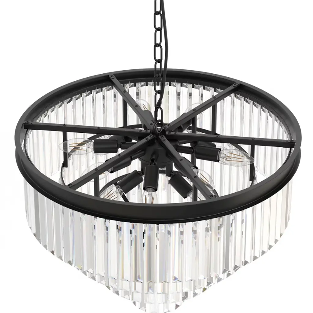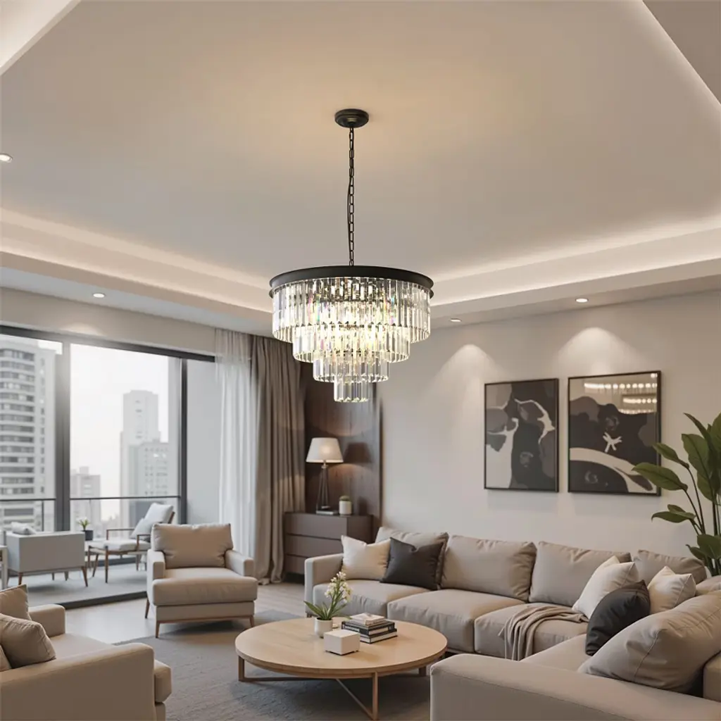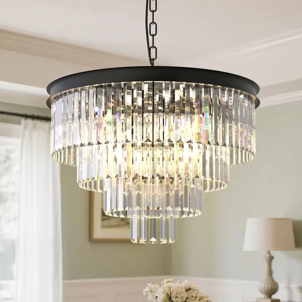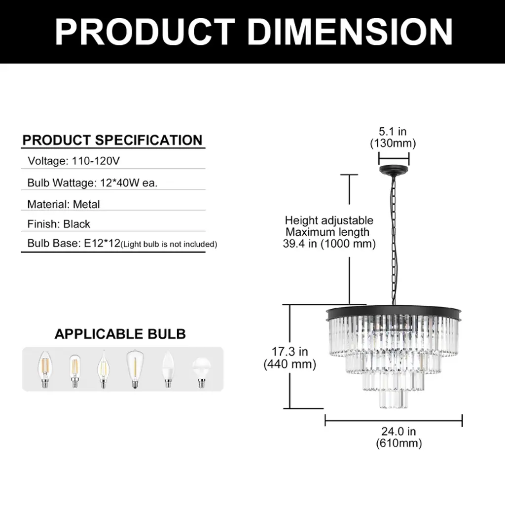 Elevate your home d¨¦cor with this elegant 12-light tiered chandelier featuring a sleek matte black finish and four layers of sparkling triangular crystal strips. With a diameter of 23.6 inches, this chandelier is ideal for creating a dramatic focal point in dining rooms, entryways, or living areas. The non-integrated light source design lets you select bulbs according to your preferred brightness and style (bulbs sold separately). Easy installation is ensured with included mounting hardware. This fixture blends modern sophistication with timeless glamour for a stunning lighting solution.
